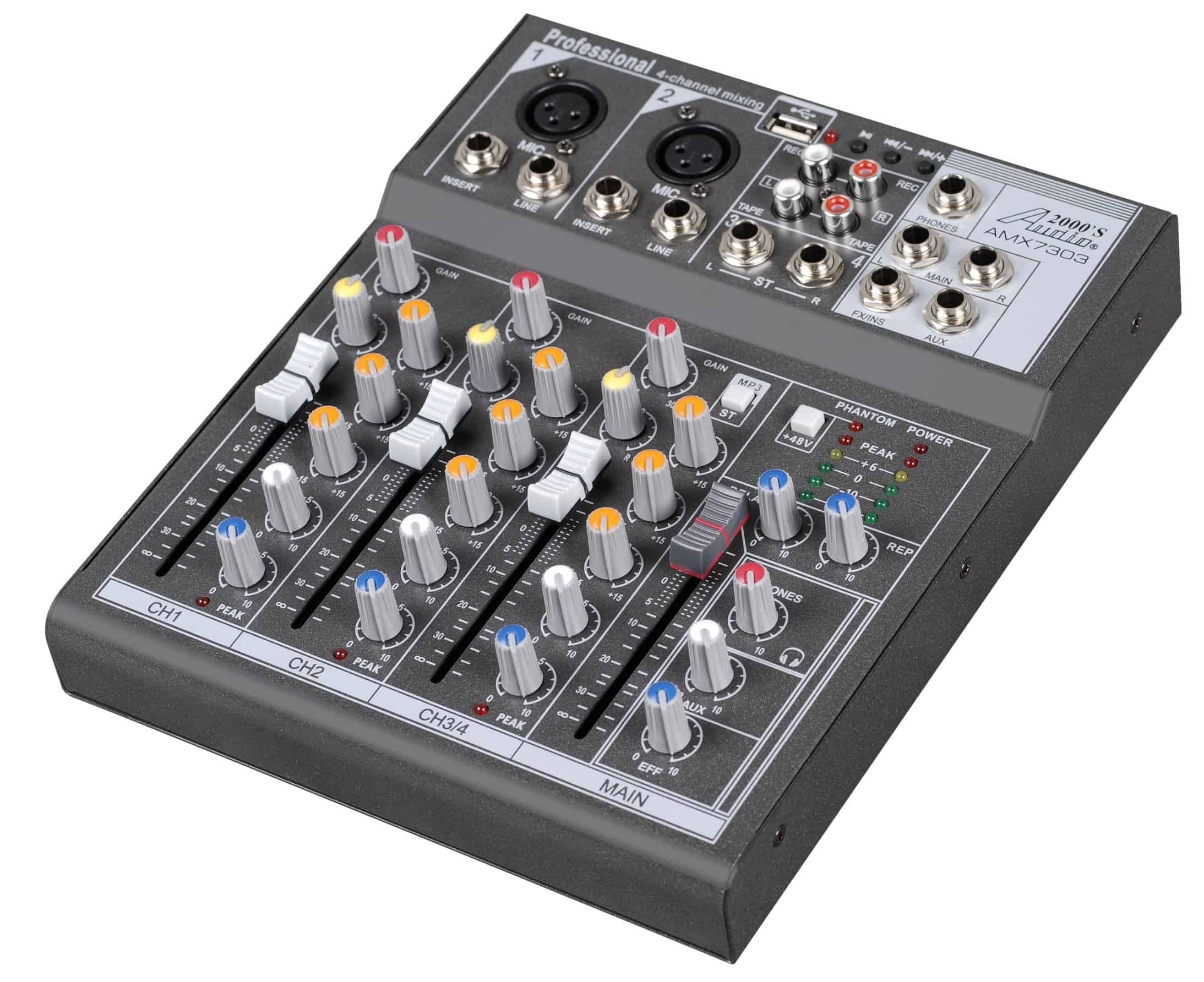 El mezclador de audio de cuatro canales AMX7303 tiene un procesador DSP incorporado. Incluye entradas de micrófono + línea estéreo y diversos formatos de música. Reproductor de MP3 integrado que admite una variedad de formatos de música. Indicadores de pico LED en todos los canales. Indicador de nivel de alta precisión, interruptor de alimentación fantasma (+48V) chasis de acero resistente.