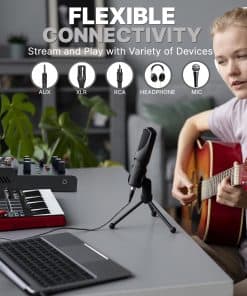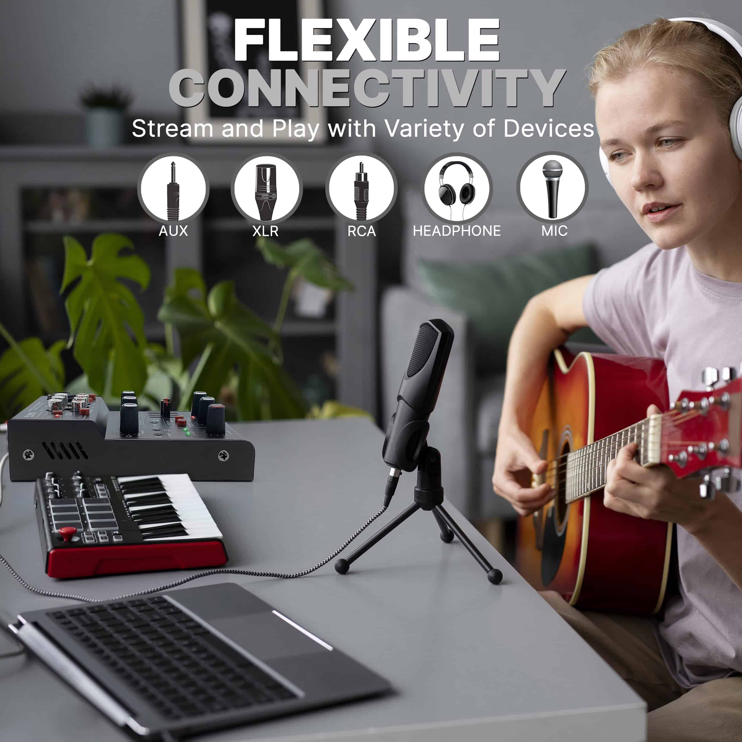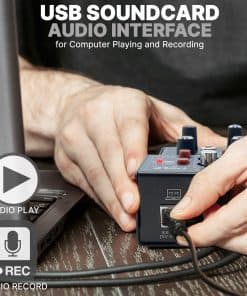 Características: – Diseño ultrabajo en ruido con amplio rango dinámico. – Tarjeta de sonido/Interfaz de audio USB, para reproducir y grabar en la computadora. – Efecto de eco integrado. – Ecualizador musical de 2 bandas y PAN en cada canal. – Combo Jack (XLR+6.35mm) para entradas de MIC/LINE. – Entrada estéreo independiente de 3.5mm. – Conectividad flexible para una variedad de dispositivos externos. – Conectores RCA para entrada y salida estéreo. – Entradas RCA 2-TK. – Conectores de 3.5mm para entrada de micrófono y salida de monitoreo de auriculares. – Alimentación Phantom +48V. – Fuente de alimentación DC 5V o PC. – Chasis resistente de metal. Conectividad Bluetooth: – Recibe instantáneamente transmisión de música inalámbrica. – Funciona con todos tus dispositivos favoritos. – Versión Bluetooth: 5.0. – Nombre de red Bluetooth: ‘MP’. – Rango inalámbrico de Bluetooth: 50 pies. Contenido del paquete: – Mini Mezclador. – Adaptador de corriente (2 clavijas planas). – Cable USB. Especificaciones técnicas: – Tarjeta de sonido USB: Tipo-B 2.0. – Fuente de alimentación: DC 5V, 500mA. – Voltaje: 100/240V. – Consumo de energía: 5W. – Longitud del cable USB: 3.94 pies. – Dimensiones del producto (L x W x H): 5.35» x 3.95» x 1.38» pulgadas.