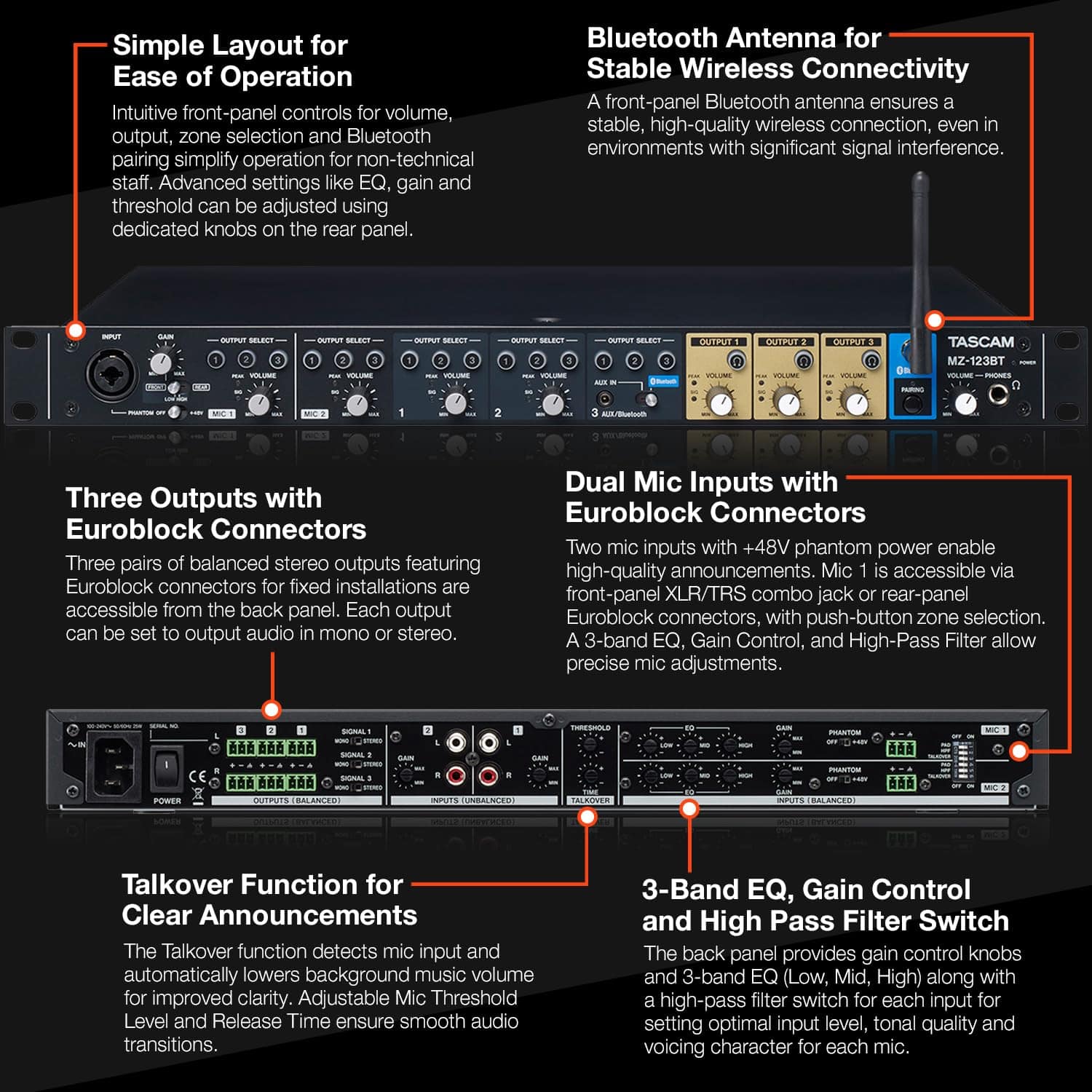 Un mezclador indispensable para todo tipo de aplicaciones comerciales que requieren enrutamiento y mezcla de audio versátil. El Mezclador de audio multifuncional de grado comercial Tascam MZ-123BT es una solución compacta, pero potente, que brinda la flexibilidad necesaria para satisfacer las demandas de ambientes comerciales diversos. Con funcionalidades como enrutamiento de hasta tres canales, atenuación automática de música, control de volumen por zona y conectividad Bluetooth avanzada, este mezclador pone el control total en tus manos. Ya sea en un restaurante, hotel, tienda minorista o cualquier otro entorno comercial, el MZ-123BT garantiza una calidad de audio excepcional y una facilidad de uso incomparable. ¡Potencia tu negocio con el Mezclador de audio multifuncional Tascam MZ-123BT!