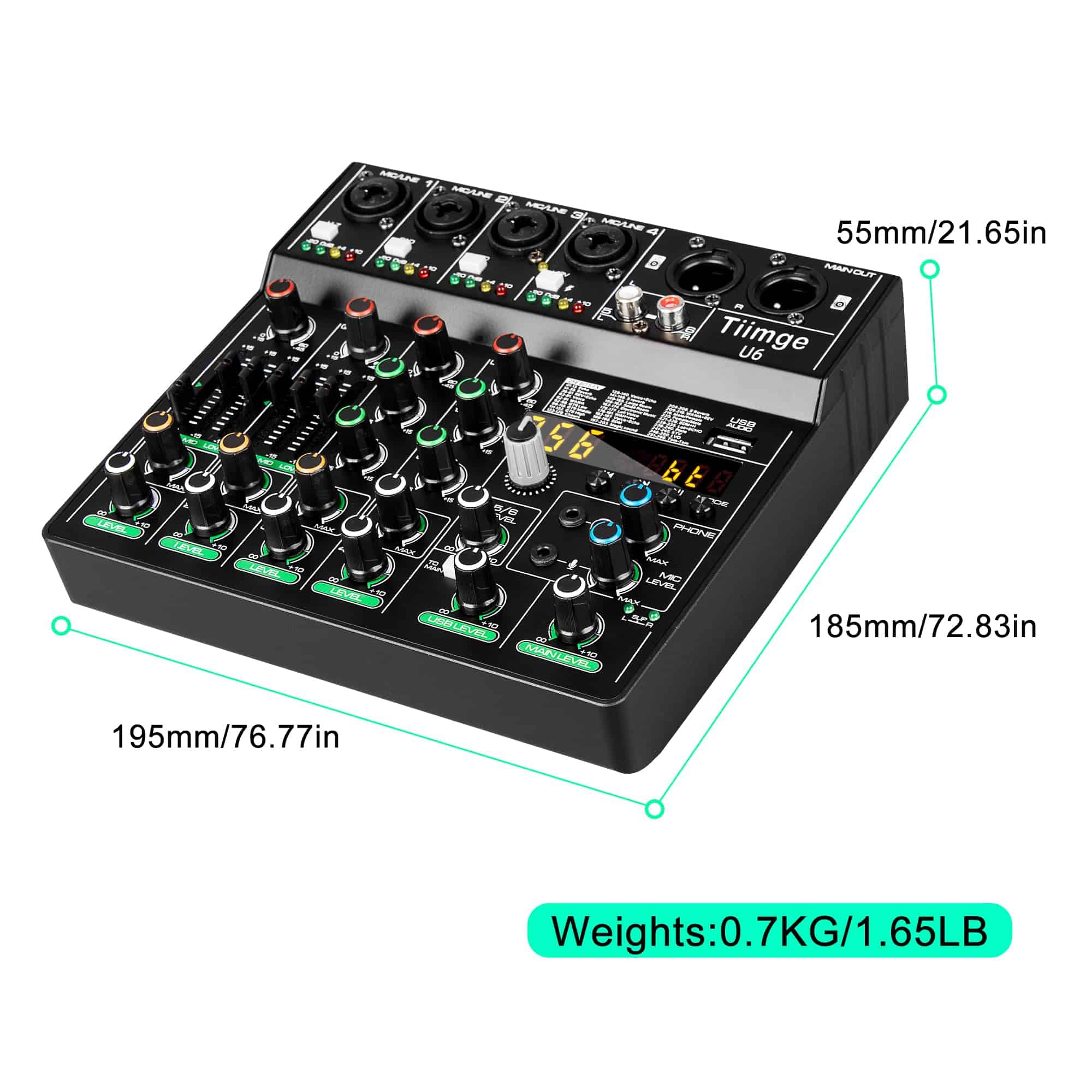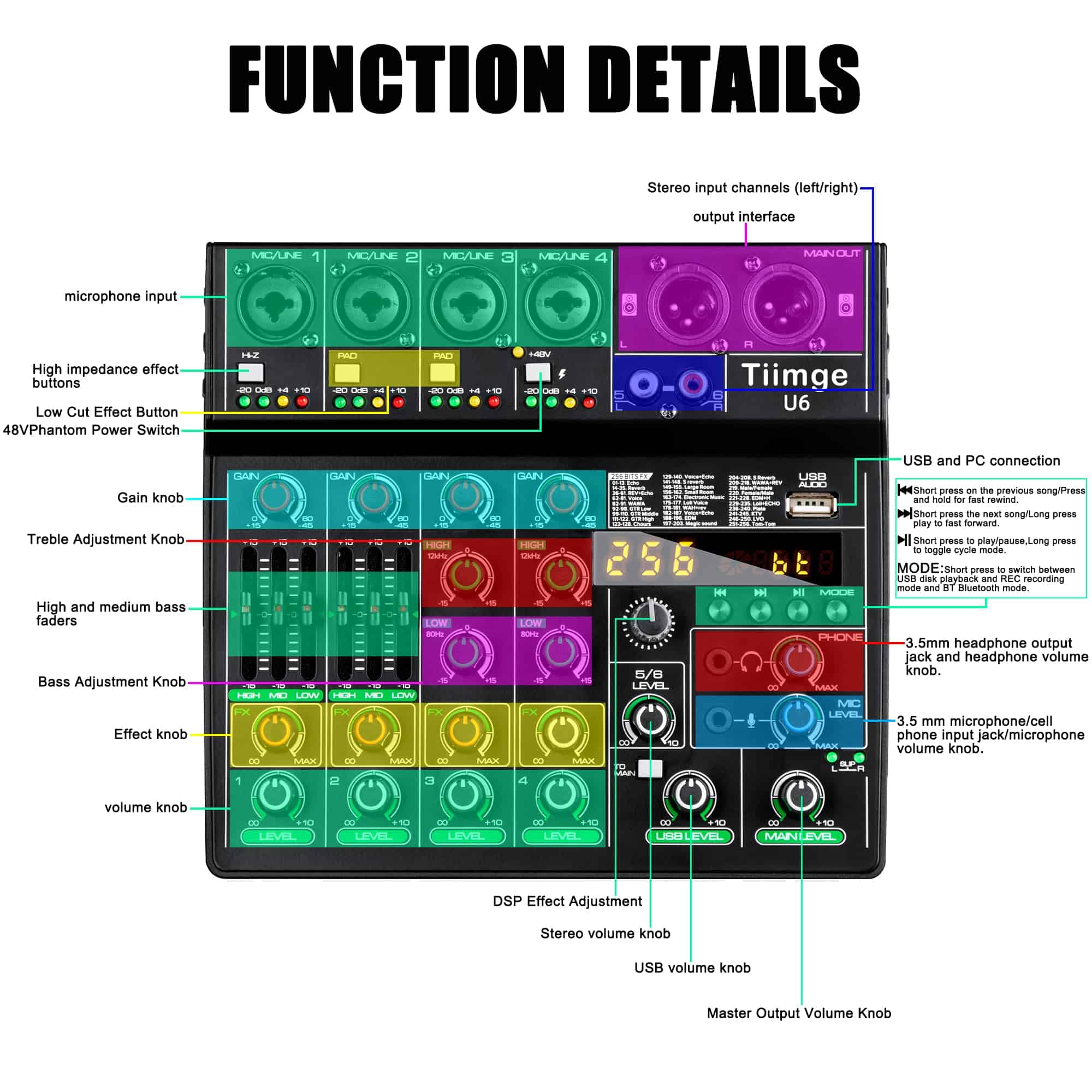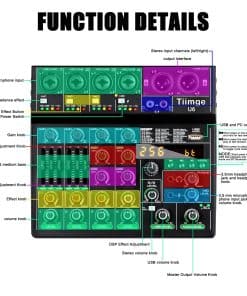 1. Mezcla de DJ de 6 canales: 4 entradas de micrófono combo XLR / LINE jack, 1 par de entradas estéreo RCA, 1 par de salidas XLR y 1 par de salidas principales de 1/8�� más conector para auriculares, con 6 canales y 256 efectos DSP. El mezclador de audio Tiimge proporciona una experiencia de mezcla de sonido de alta calidad para los usuarios, permitiéndoles crear transiciones perfectas entre pistas y mejorar sus actuaciones en vivo.