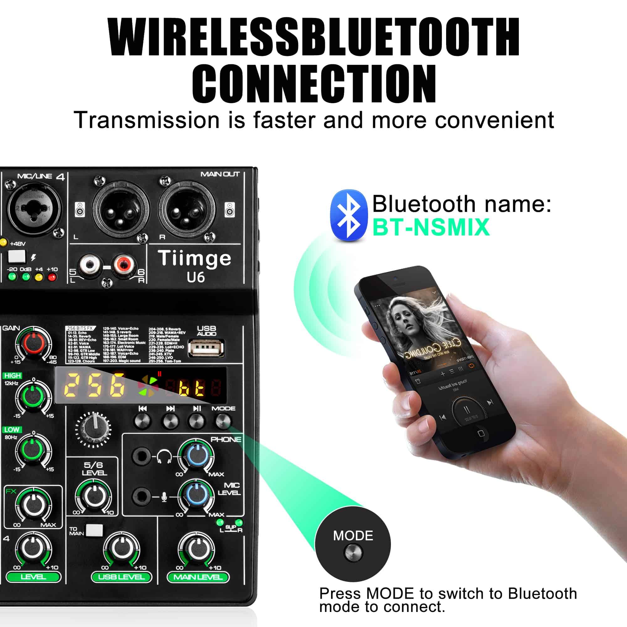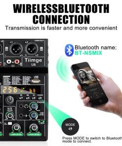 2. Conectividad Bluetooth: La función Bluetooth (BT-NSMIX) del mezclador permite a los usuarios conectar sus teléfonos inteligentes u otros dispositivos habilitados para Bluetooth al mezclador de forma inalámbrica, facilitando la reproducción de música desde cualquier fuente y ampliando sus capacidades de mezcla.
