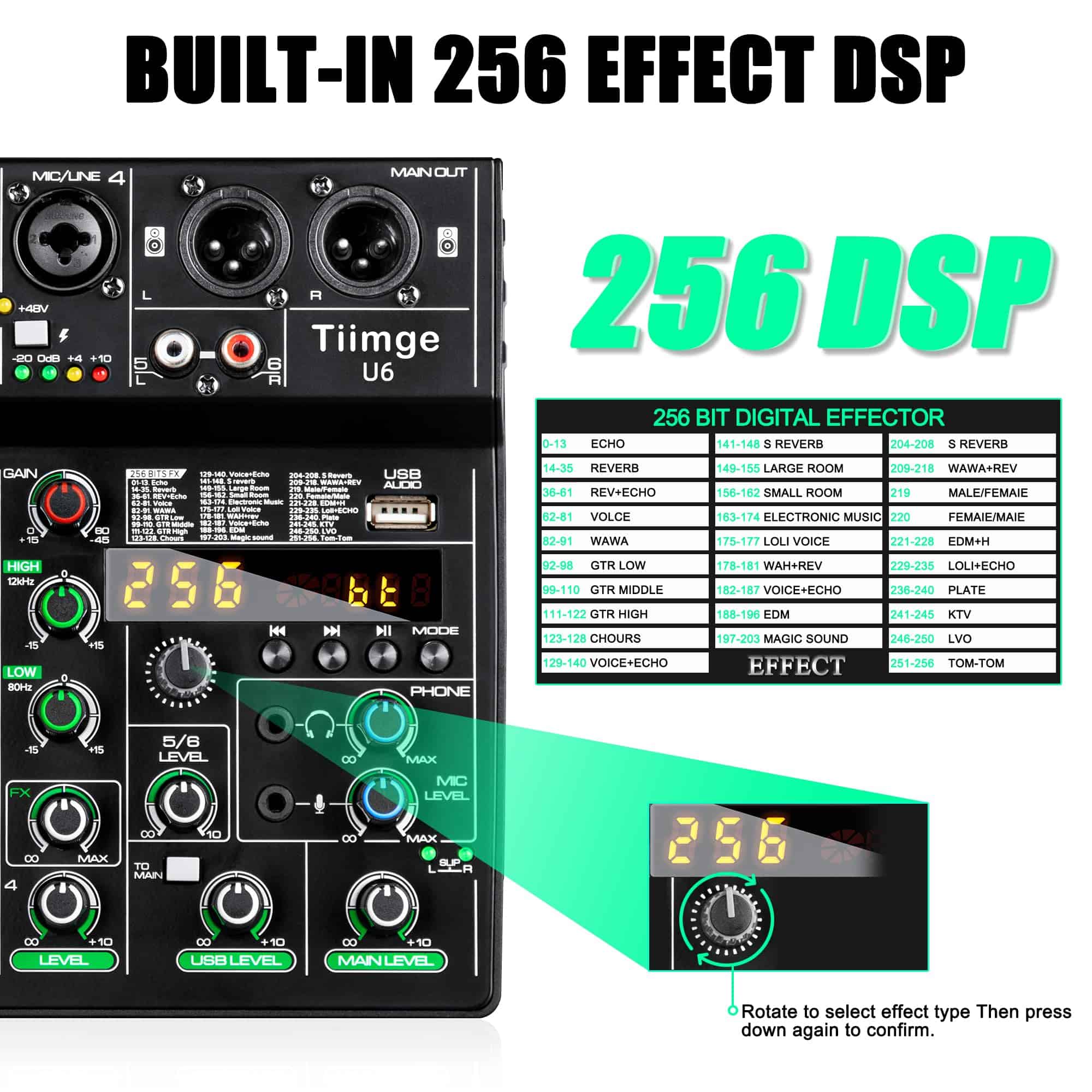 3. Efectos DSP y Ecualizadores: La perilla de reverb DSP le permite ajustar 256 efectos de reverb según diferentes escenarios. El canal 1-Channel y 2-Channel tienen ecualización alta / media / grave, el canal 3-Channel y 4-Channel tienen ecualización alta / baja, lo que le permite ajustar el sonido según sus propias preferencias.