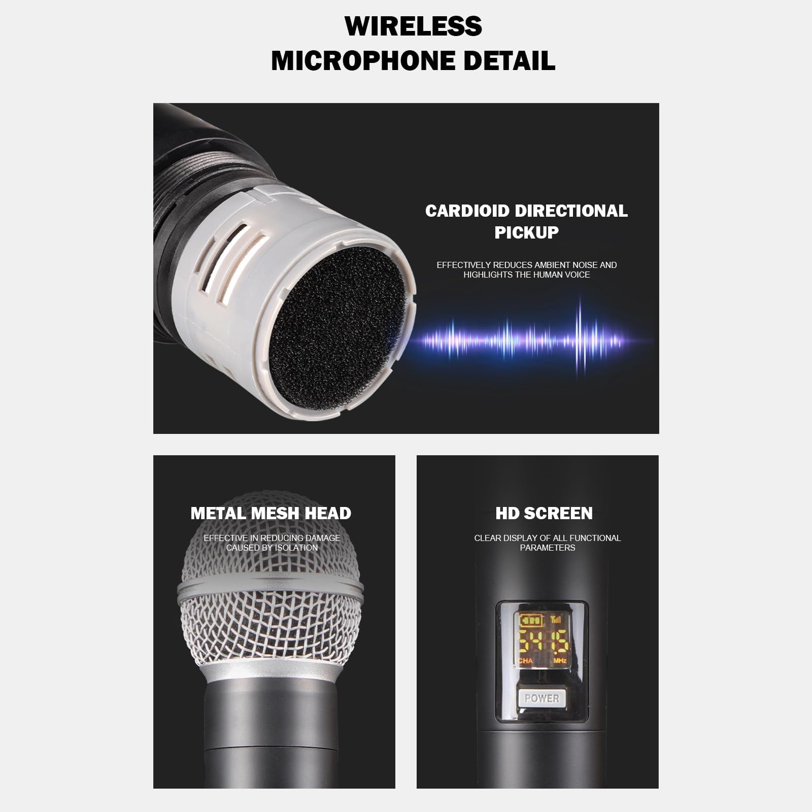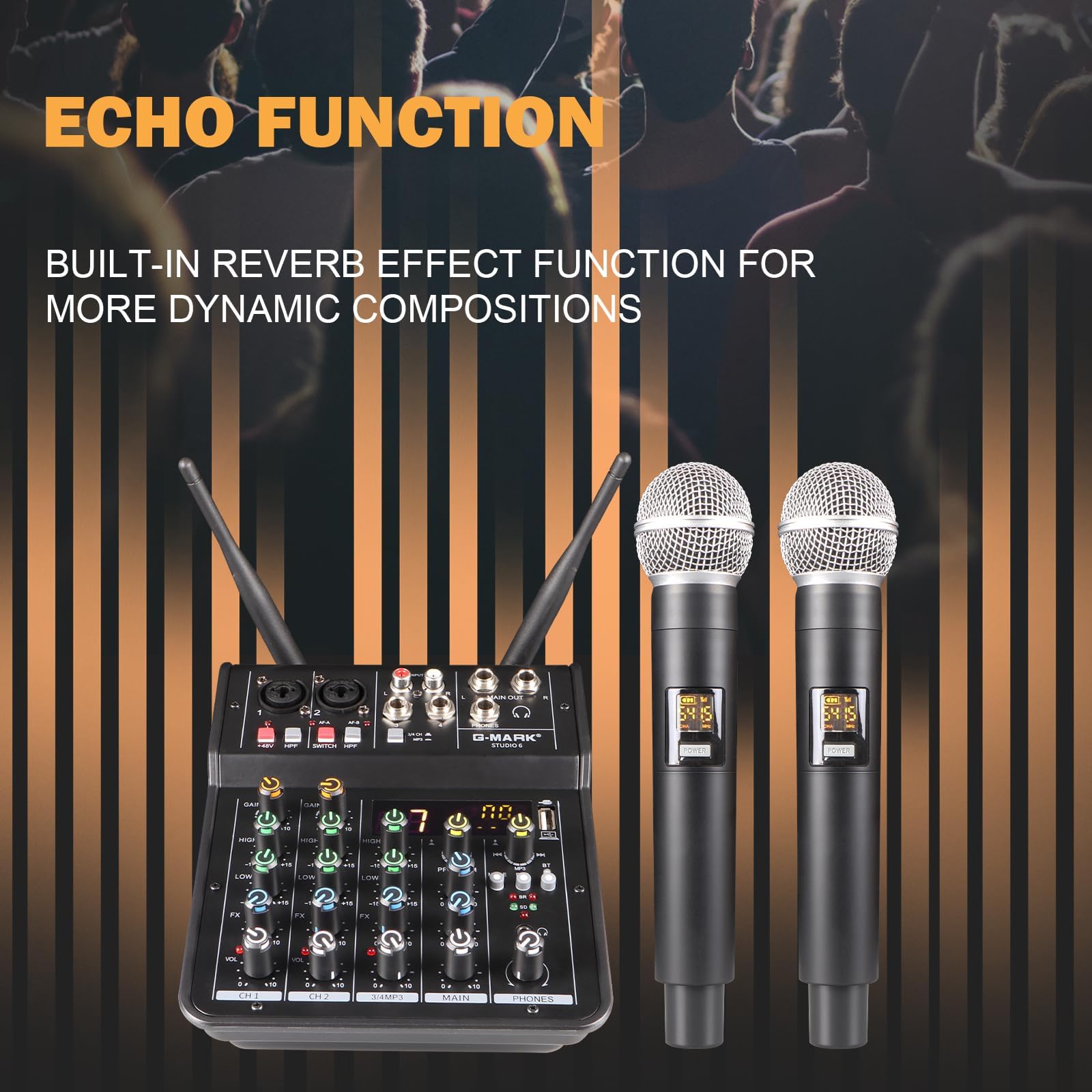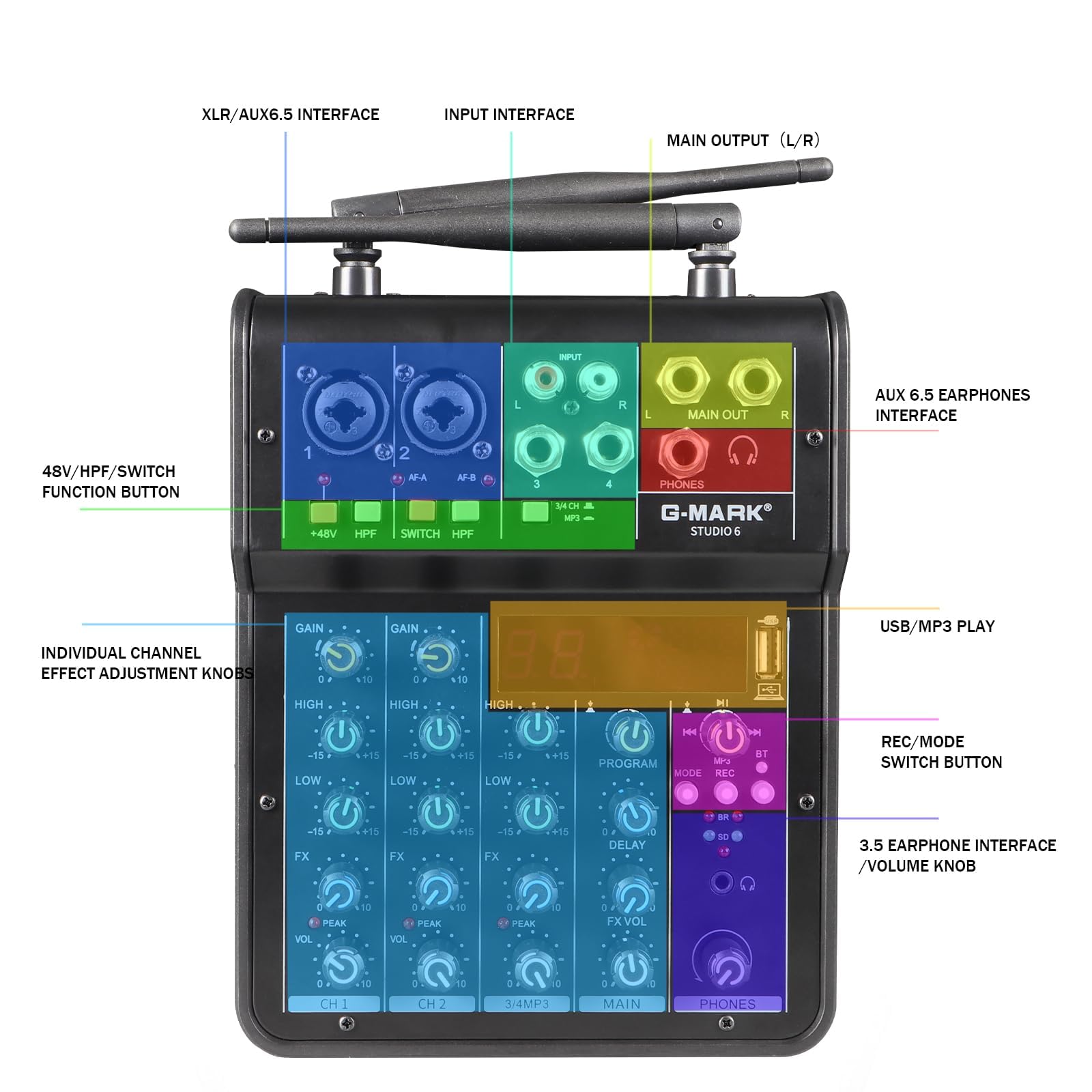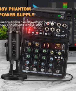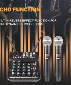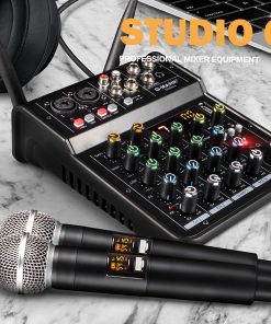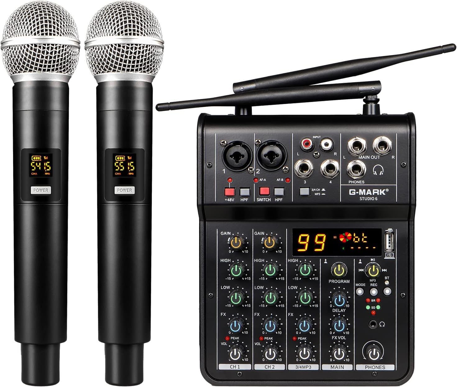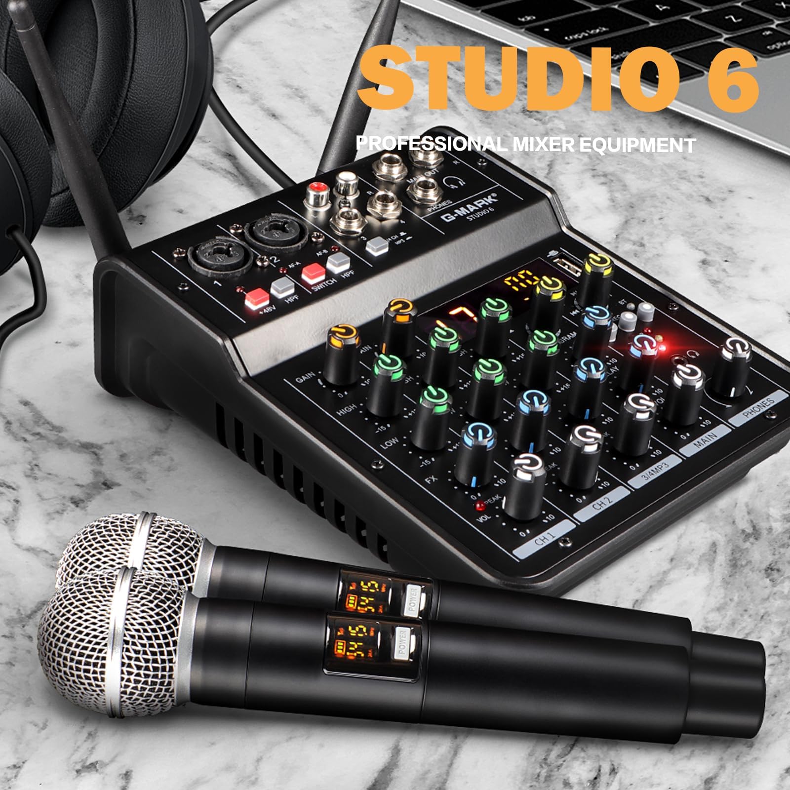 El Mezclador de Audio Studio 6 es un versátil y de alta calidad mezclador de DJ de 4 canales diseñado para mezcla y grabación de audio. Este mezclador de música incluye micrófonos inalámbricos duales, lo que lo convierte en una opción conveniente para los artistas que requieren movilidad y libertad de movimiento en el escenario.