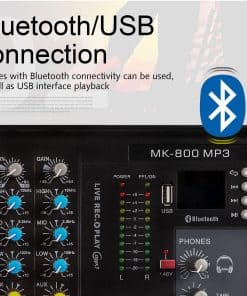 El sistema G-MARK MK800MP3 es un mezclador de audio de 8 canales verdaderamente fácil de usar, pero con un sonido agradable. El MK800MP3 está configurado con todas las características esenciales del mezclador. Procesador de efectos de sonido DSP incorporado reproductor MP3 integrado que admite una variedad de formatos de música. Pantalla LED para mostrar el estado de reproducción. EQ de 3 bandas ultra musical en todos los canales. Entradas de línea de micrófono. Indicadores LED de pico en todos los canales. Indicador de nivel de alta precisión. Interruptor de phantom Power (+48V). Perillas de control rotativas selladas para resistir polvo y suciedad. Chasis de acero resistente. Fuente de alimentación de voltaje múltiple para uso en todo el mundo.