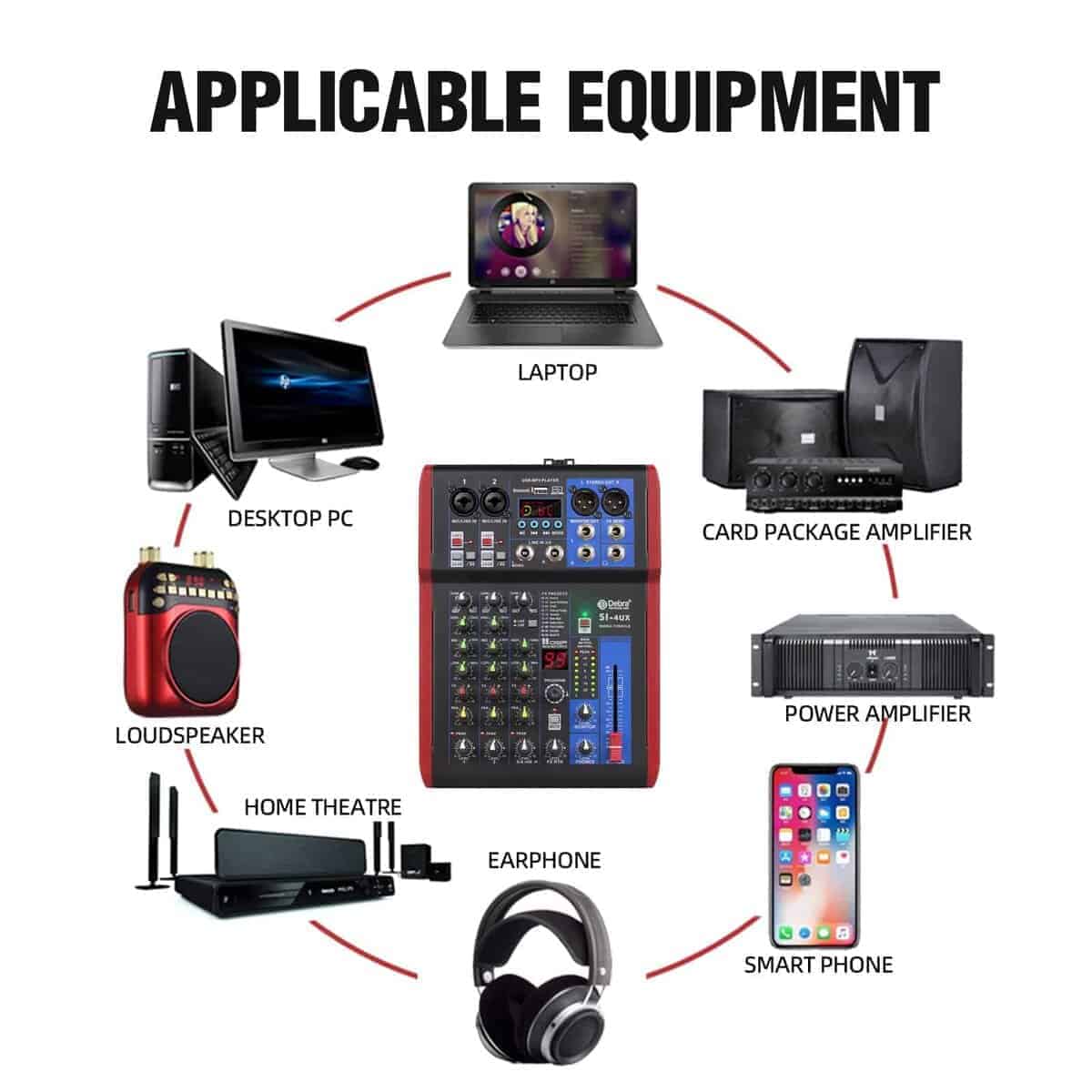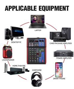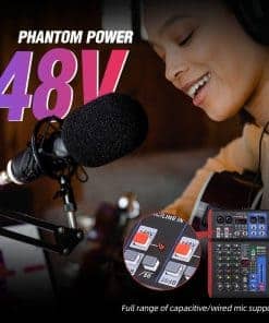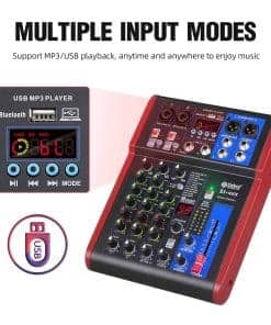 3. El mezclador de grabación cuenta con luces indicadoras LED y perillas de ajuste giratorio para la conveniencia del usuario. Tiene controles de selección de entrada, volumen maestro, balance de canal independiente y ajuste de frecuencia alta, media, baja. Adecuado para diversas grabaciones de individuos, bandas y profesionales.