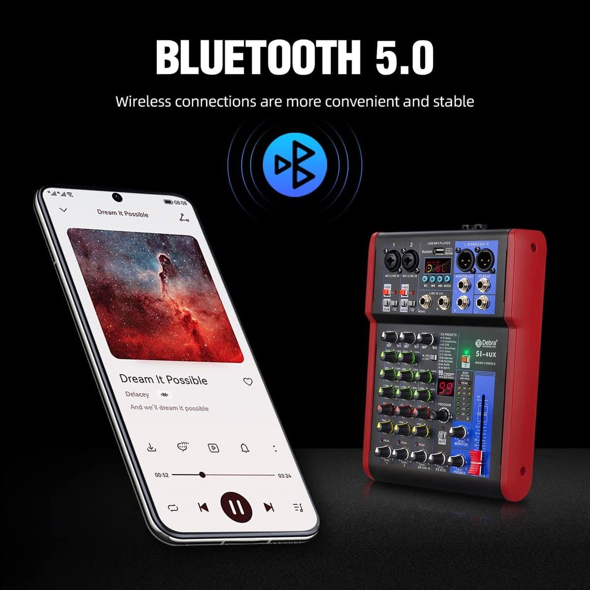 1. Este controlador de sonido DJ portátil cuenta con Bluetooth para transmisión inalámbrica y se puede utilizar como una entrada para mezclar la señal con otros canales de entrada. Funciona con iPhone, Android, iPad, tableta y reproductor de MP3. El rango inalámbrico es de 15 pies.