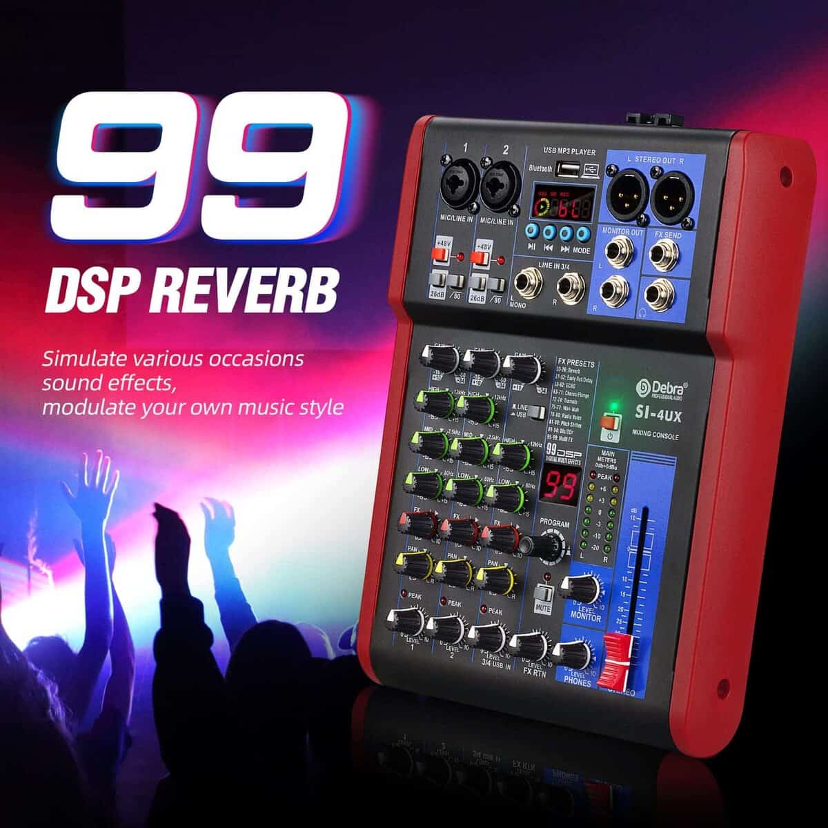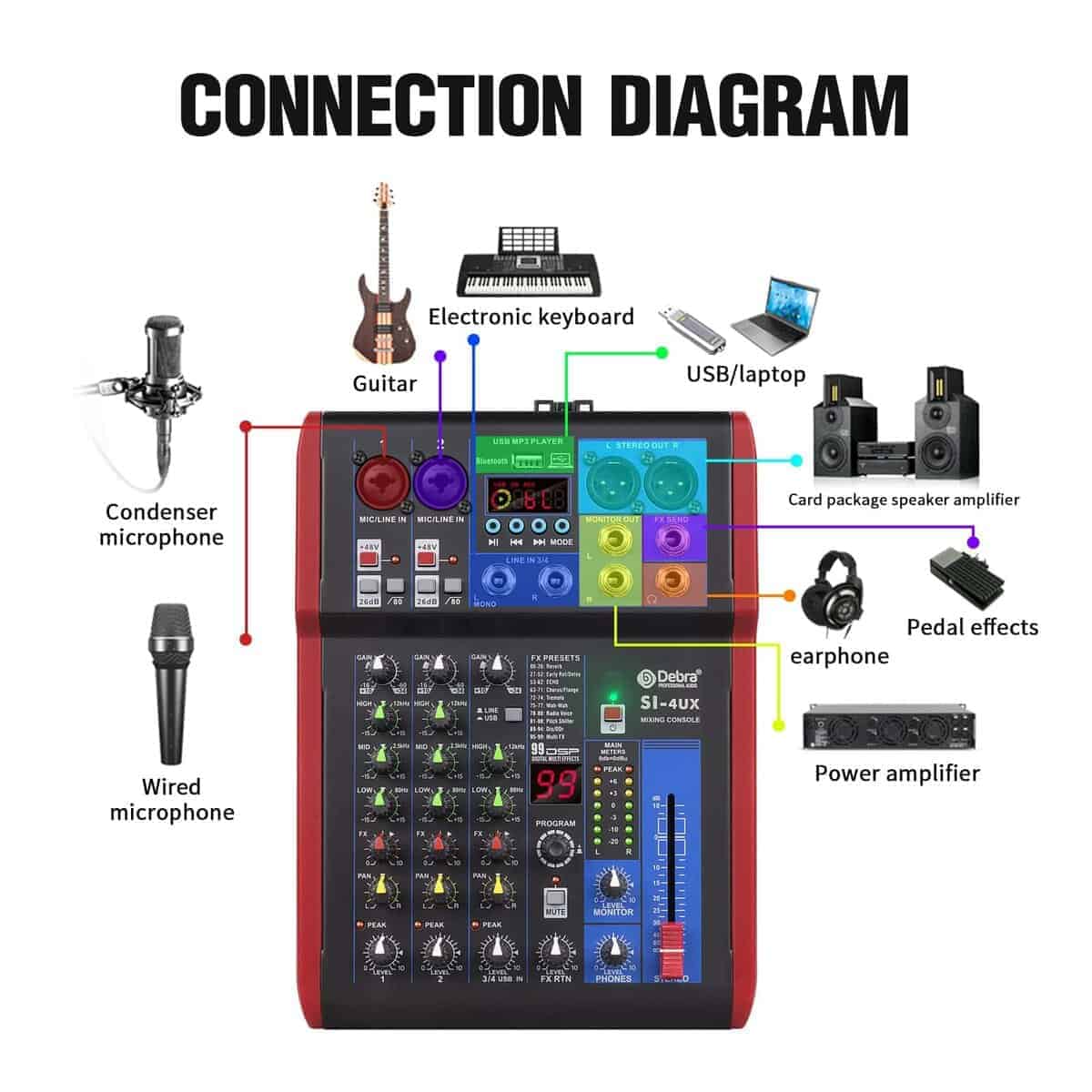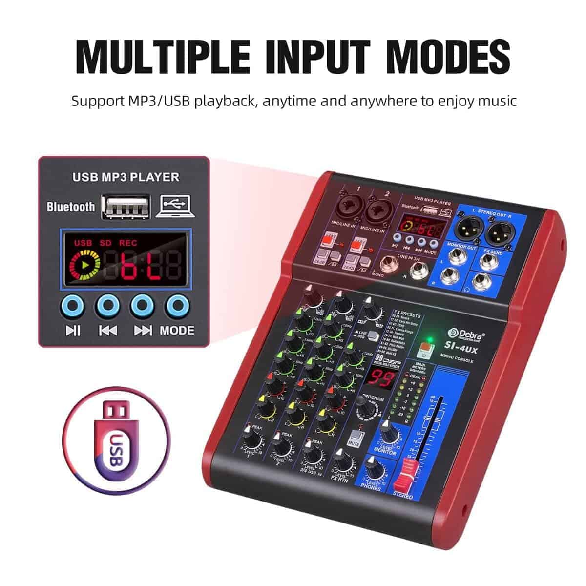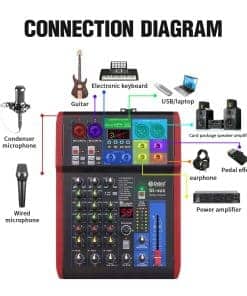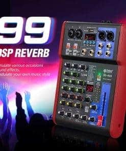 2. Este mezclador personal tiene una tarjeta de sonido USB y una interfaz de audio para grabar y conectarse a MAC o PC, y tiene una compatibilidad universal de archivos de audio digital. Puede ser utilizado por principiantes o aplicaciones profesionales de estudio. 99 efectos DSP, puede satisfacer la mayoría de los requisitos de grabación de escenas.