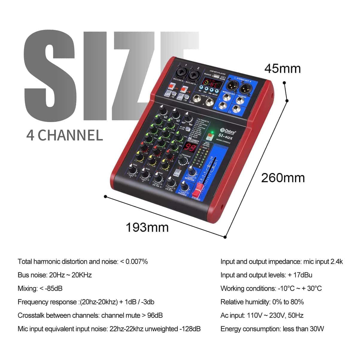 4. Para una fuente de alimentación confiable, este mezclador de DJ viene con una fuente de alimentación Phantom de +48V. Incluye un cable adaptador de corriente de 3 pines y el medidor de nivel de salida estéreo es de 12 segmentos (-30, -20, -10, -7, -4, -2, 0, +2, +4, +7, +10, CLIP).