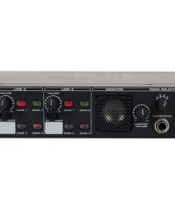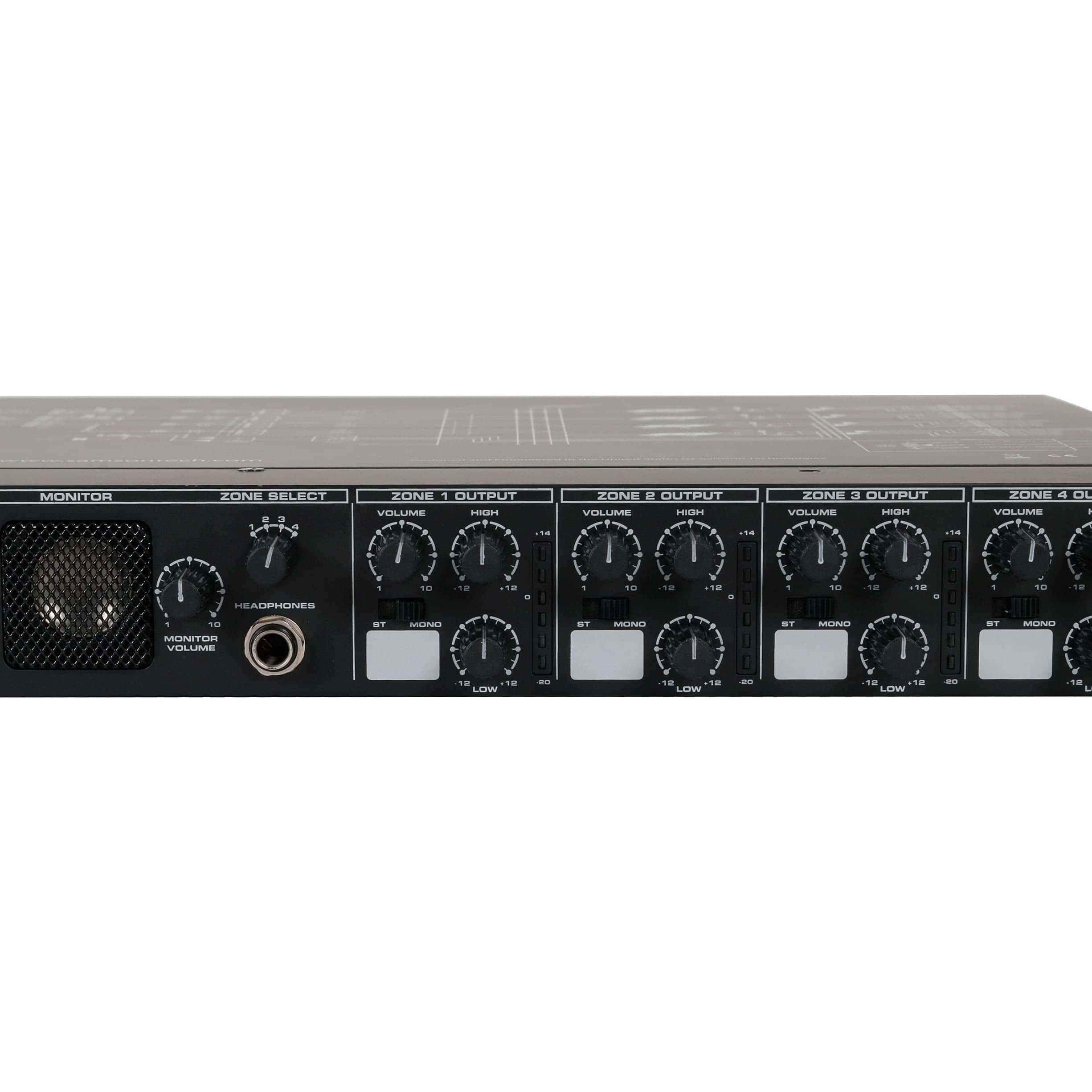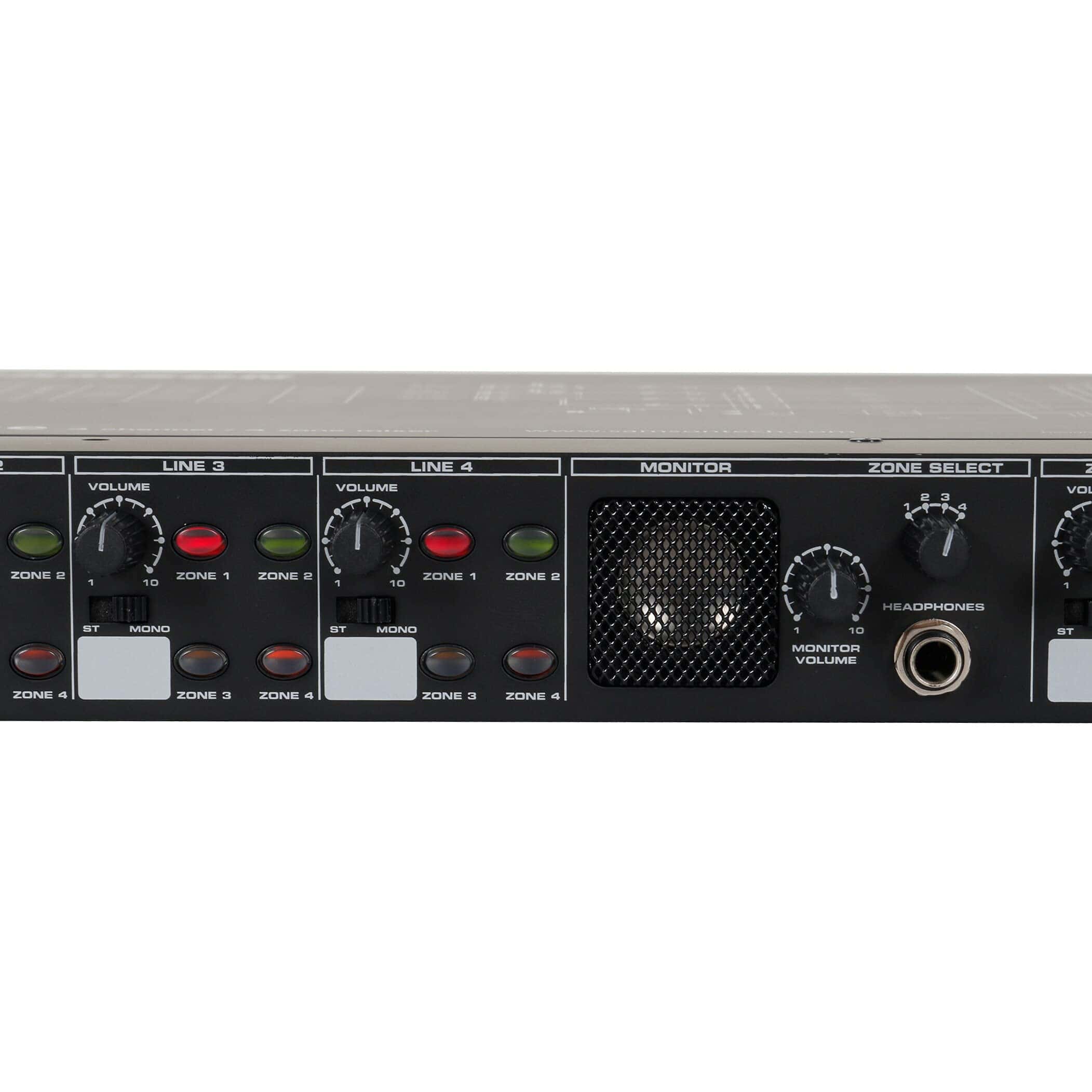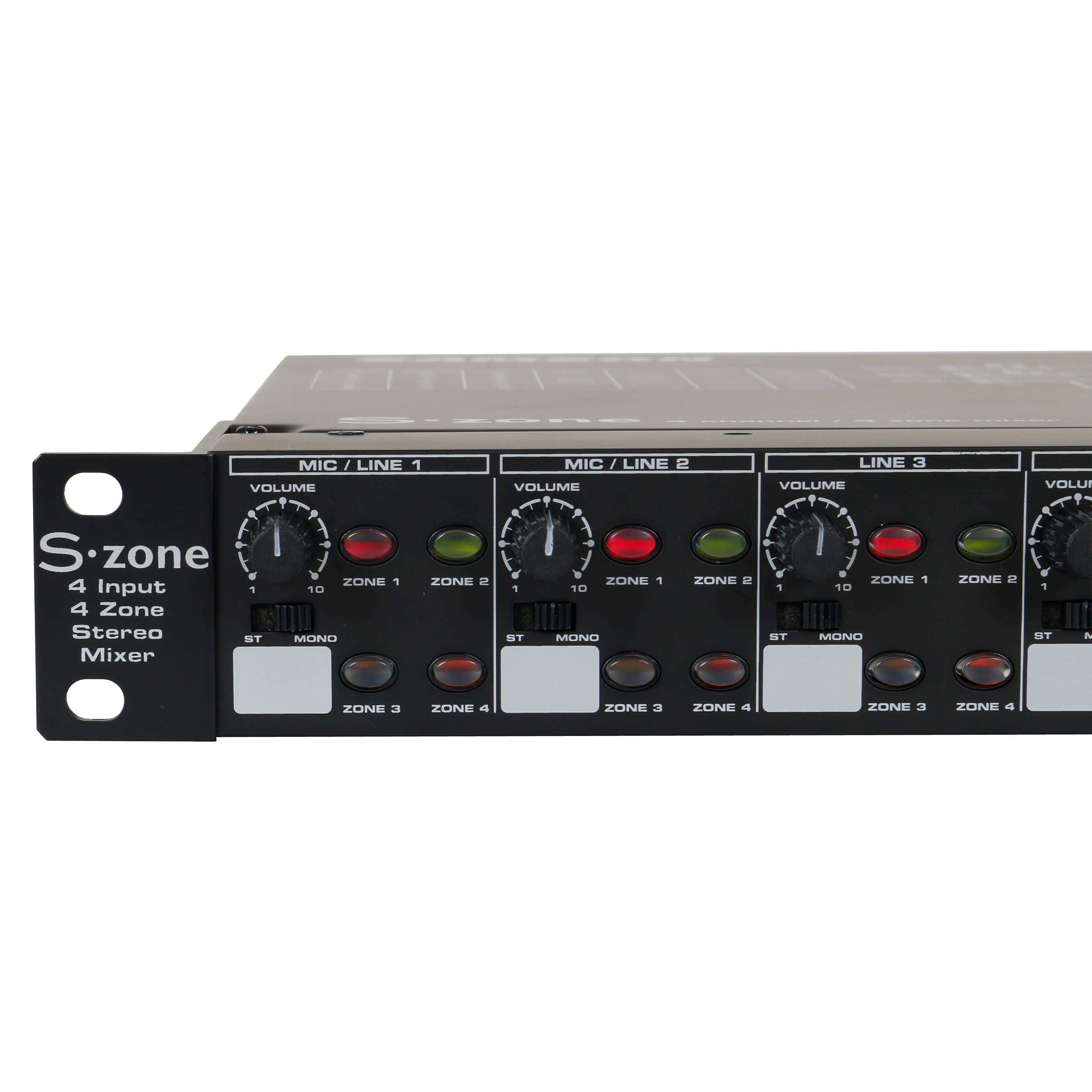 El S-Zone proporciona a los instaladores de sistemas todas las características que necesitan para controlar hasta cuatro zonas de audio con un dispositivo compacto de un solo espacio en rack. Cuenta con 2 entradas de micrófono balanceadas y 4 entradas auxiliares/línea balanceadas con una sección de control frontal única que le permite asignar cualquiera de las cuatro entradas a cualquiera de las cuatro zonas con solo presionar un botón. El diseño del panel frontal también incluye controles de volumen de entrada y salida, ecualización independiente de 2 bandas y un altavoz incorporado para monitoreo de zona seleccionable.
