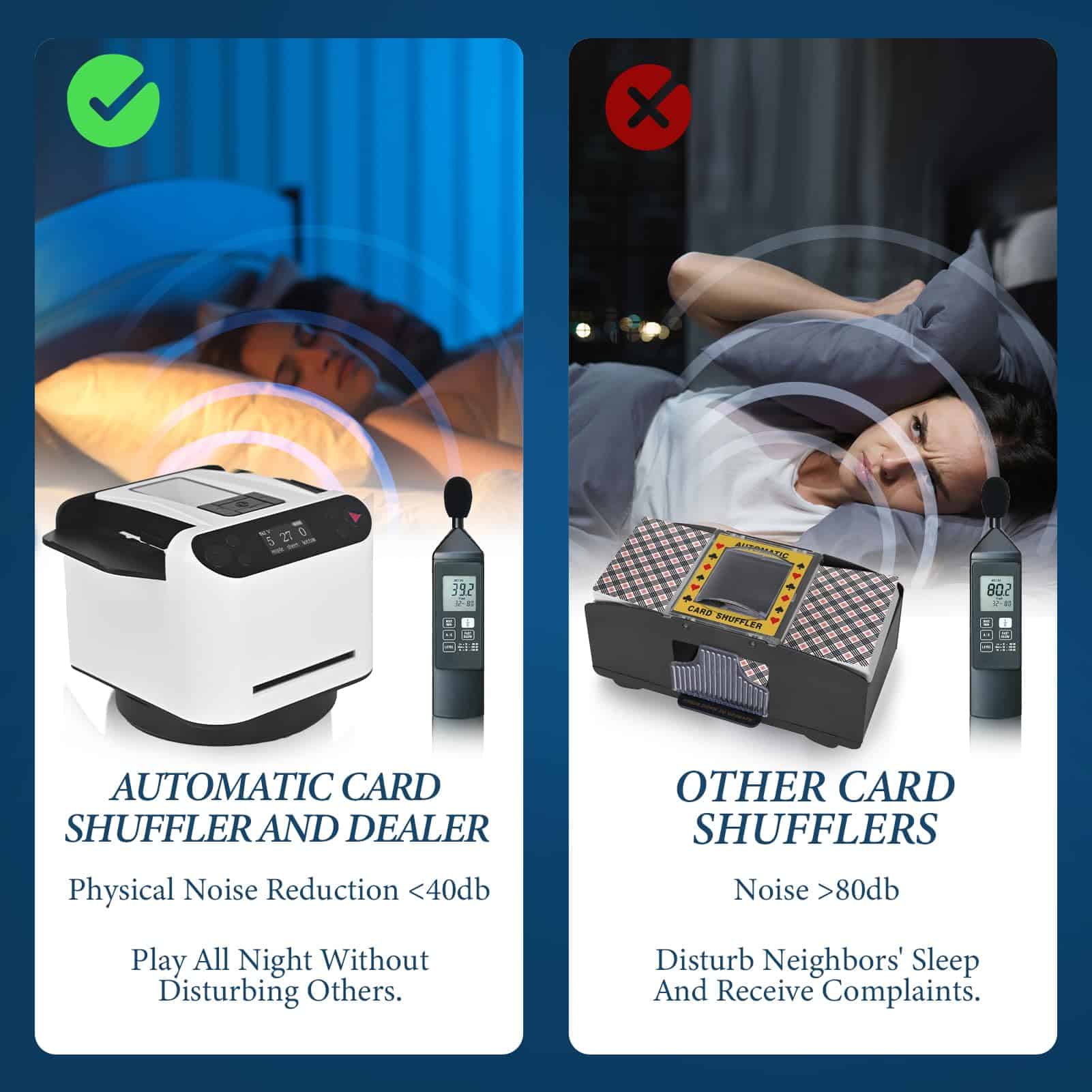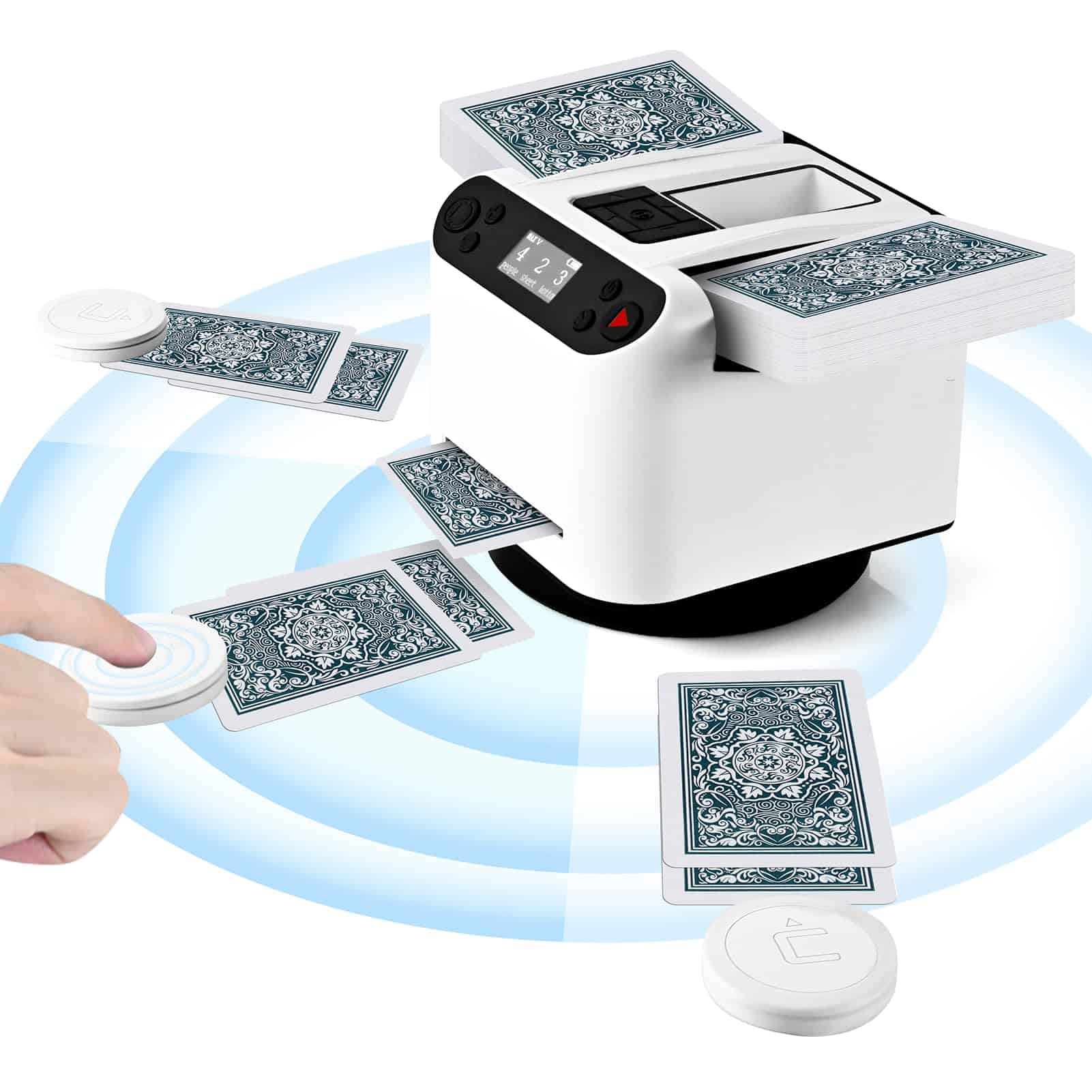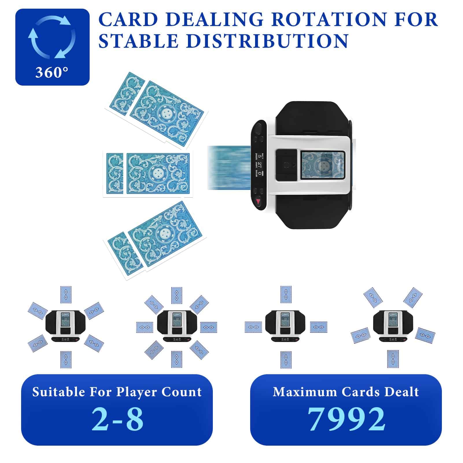 La innovadora función de reparto de cartas rotativo de 360° garantiza un reparto preciso y consistente, independientemente de la ubicación de los jugadores. Perfecto para varios entornos, incluyendo dormitorios, salas de estar, oficinas e incluso excursiones de camping.