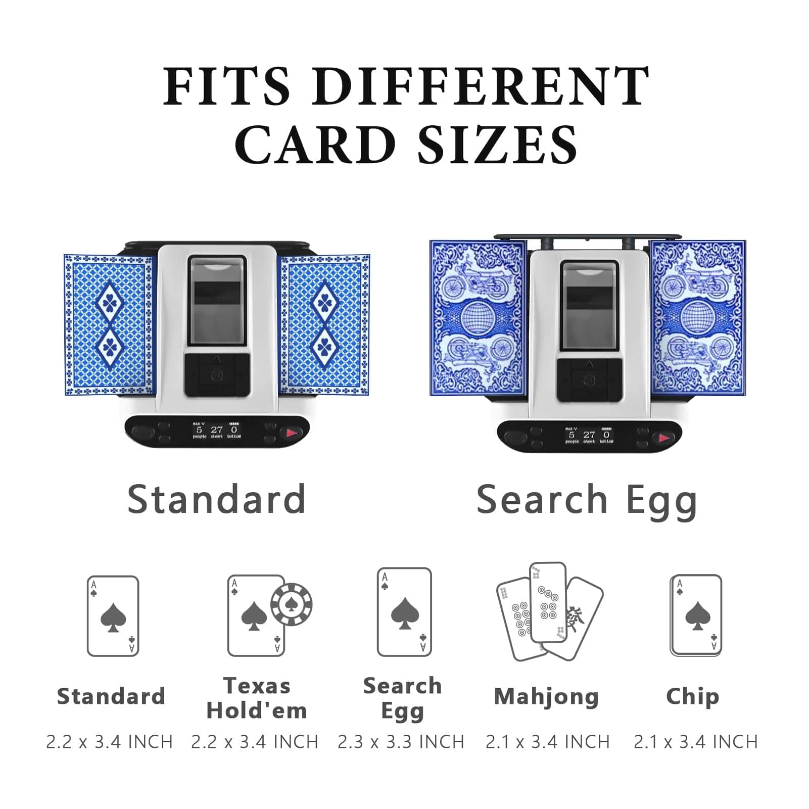 Personaliza tu juego de manera fácil con una configuración intuitiva que te permite ajustar el número de jugadores, la cantidad de cartas y las cartas compartidas. La bandeja tiene capacidad para 2 barajas, ampliable en cualquier momento, y la máquina reparte automáticamente hasta 14 barajas, adaptándose a una variedad de juegos, como Cards Against Humanity, póker, Texas Hold’em, blackjack y más.