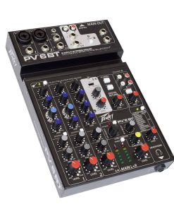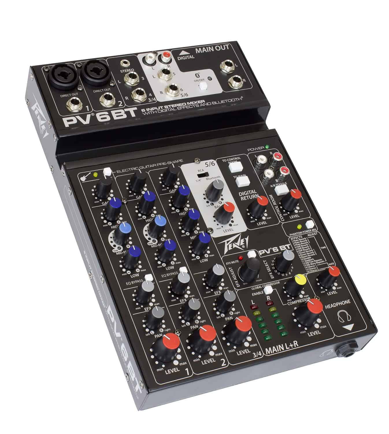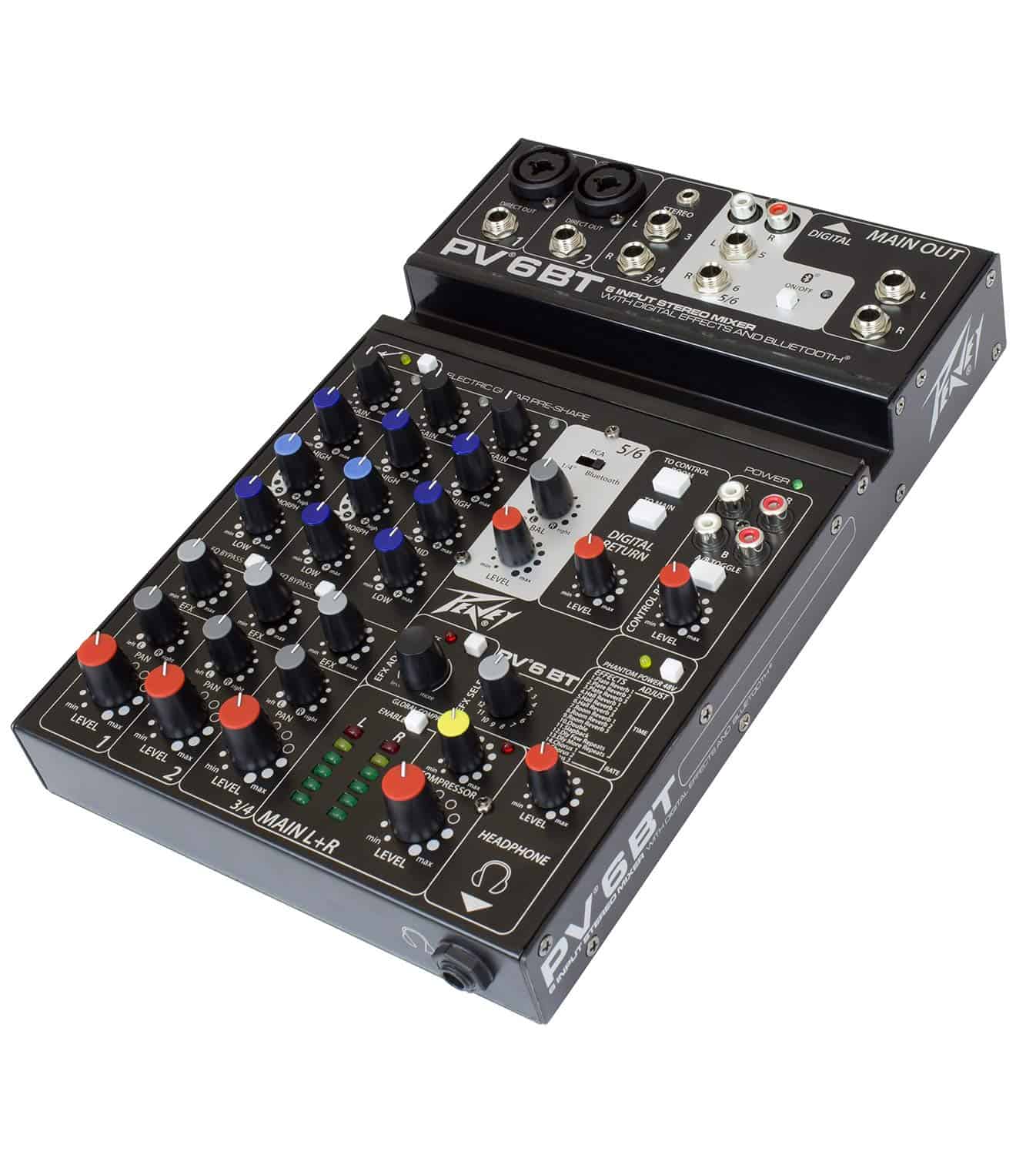 Equipada con preamplificadores de micrófono de referencia de alta calidad de Peavey que especulan en un increíble 0.0007% THD, la mezcladora PV 6 BT es excelente para aplicaciones en vivo o de grabación. La mezcladora PV 6 BT incluye 2 canales de preamplificadores de micrófono de referencia, 2 salidas directas para grabación, un canal de entrada estéreo y un canal de medios dedicado, entrada inalámbrica Bluetooth y efectos digitales de alta calidad. Otras características incluyen alimentación fantasma de 48 V, salidas de sala de control seleccionables duales, compresor estéreo incorporado, un preamplificador de alta impedancia seleccionable a bordo ecualizado para guitarra, EQ de 3 bandas por canal con bypass, indicadores de señal/clip y un puente LED maestro estéreo. Características como Bluetooth permiten una conexión perfecta con casi cualquier dispositivo «inteligente». Las salidas directas en los canales de micrófono permiten una fácil conexión a la mayoría de las interfaces DAW para grabación. Además, la mezcladora PV 6 BT puede transmitir la mezcla estéreo directamente hacia y desde una PC a través de USB. El interruptor USB a Sala de Control permite la monitorización directa al grabar con un DAW, como el software REAPER incluido. Estas mezcladoras también cuentan con un soporte para tabletas para sostener un dispositivo inteligente para una visualización conveniente y una operación sencilla.