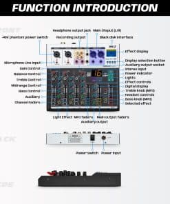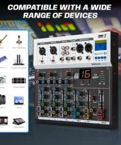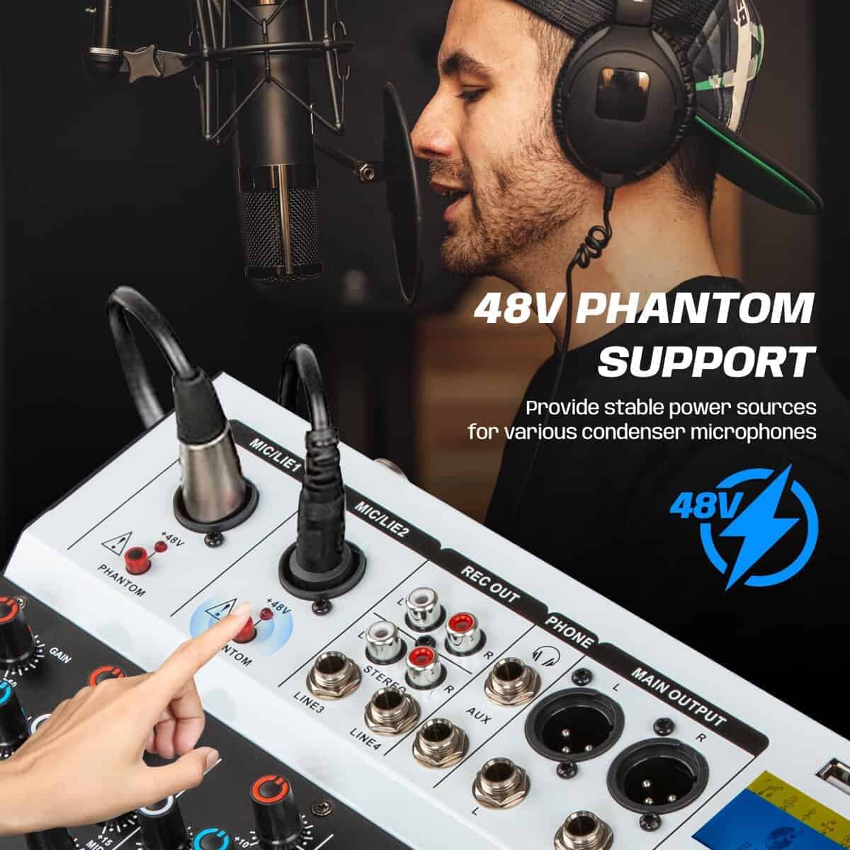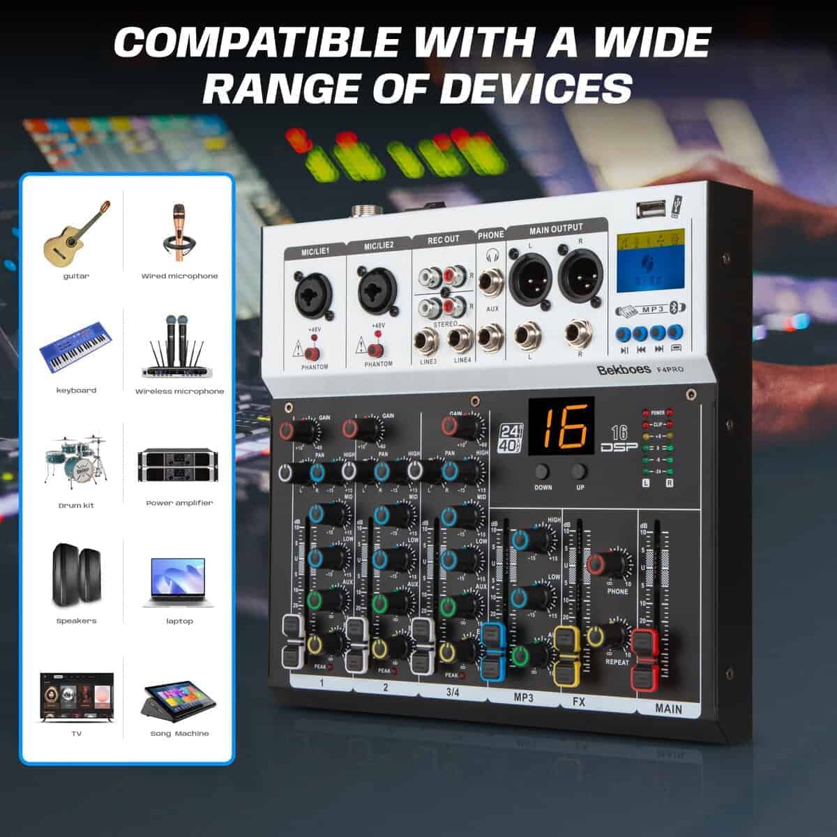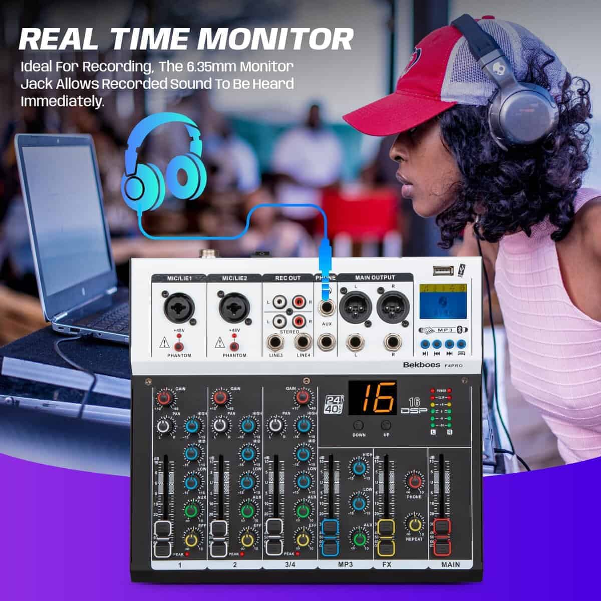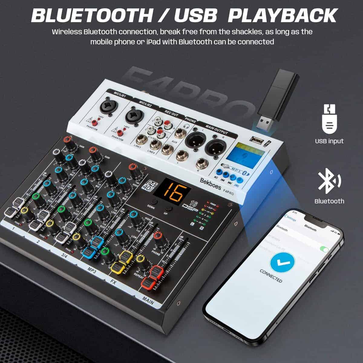 Mezcladora profesional de audio BEKBOES con 4 canales que ofrece 16 efectos DSP integrados. No se necesita equipo externo para obtener mejoras como eco, reverberación y distorsión. Conectividad Bluetooth y USB para grabar directamente a computadoras o transmitir inalámbricamente desde cualquier dispositivo Bluetooth. Phantom power de 48V para micrófonos de condensador. Monitoreo en tiempo real con jack de 6.35mm para una retroalimentación inmediata. Compatibilidad universal con una amplia gama de dispositivos, desde guitarras y PCs hasta micrófonos alámbricos e inalámbricos, teclados, bocinas y televisores. Control total sobre tu audio con ajuste de frecuencias altas, medias y bajas con precisión. Pantalla efectiva y luces indicadoras que ofrecen una visión clara del estado actual de los efectos.