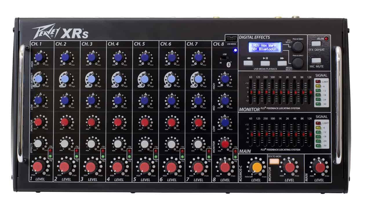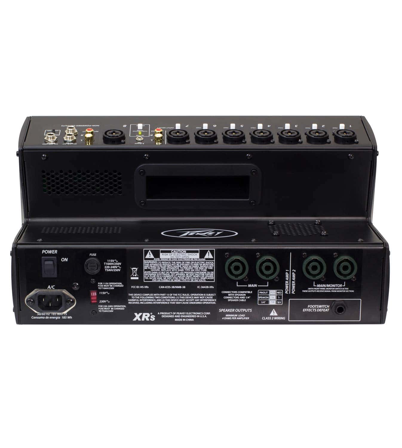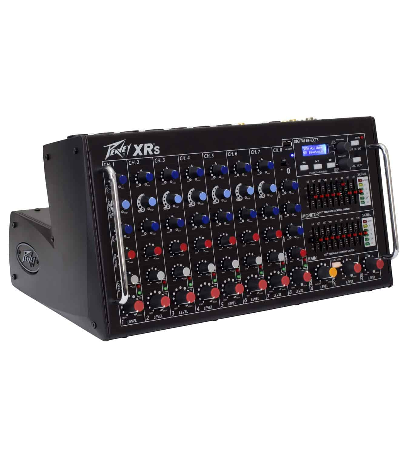 Mezcladora Potenciada Peavey XR-S con una potencia de 1,000 Watts RMS y 1,500 Watts de pico. Cuenta con una salida de línea para subwoofer y envío de monitor para una mayor versatilidad. Incluye efectos digitales para mejorar la calidad del sonido. Dispone de 8 entradas combinadas XLR/1/4 para conectar varios instrumentos o micrófonos.