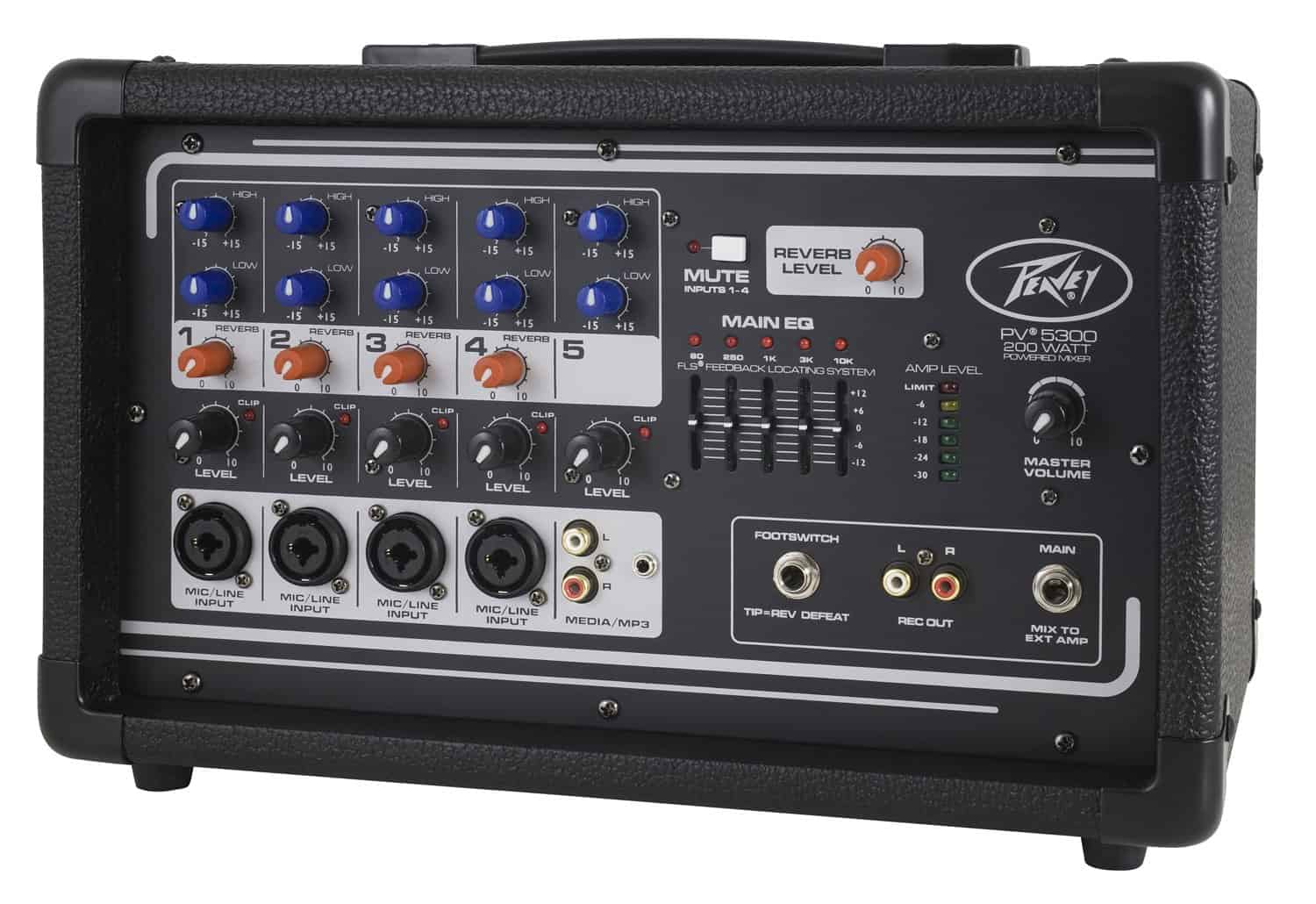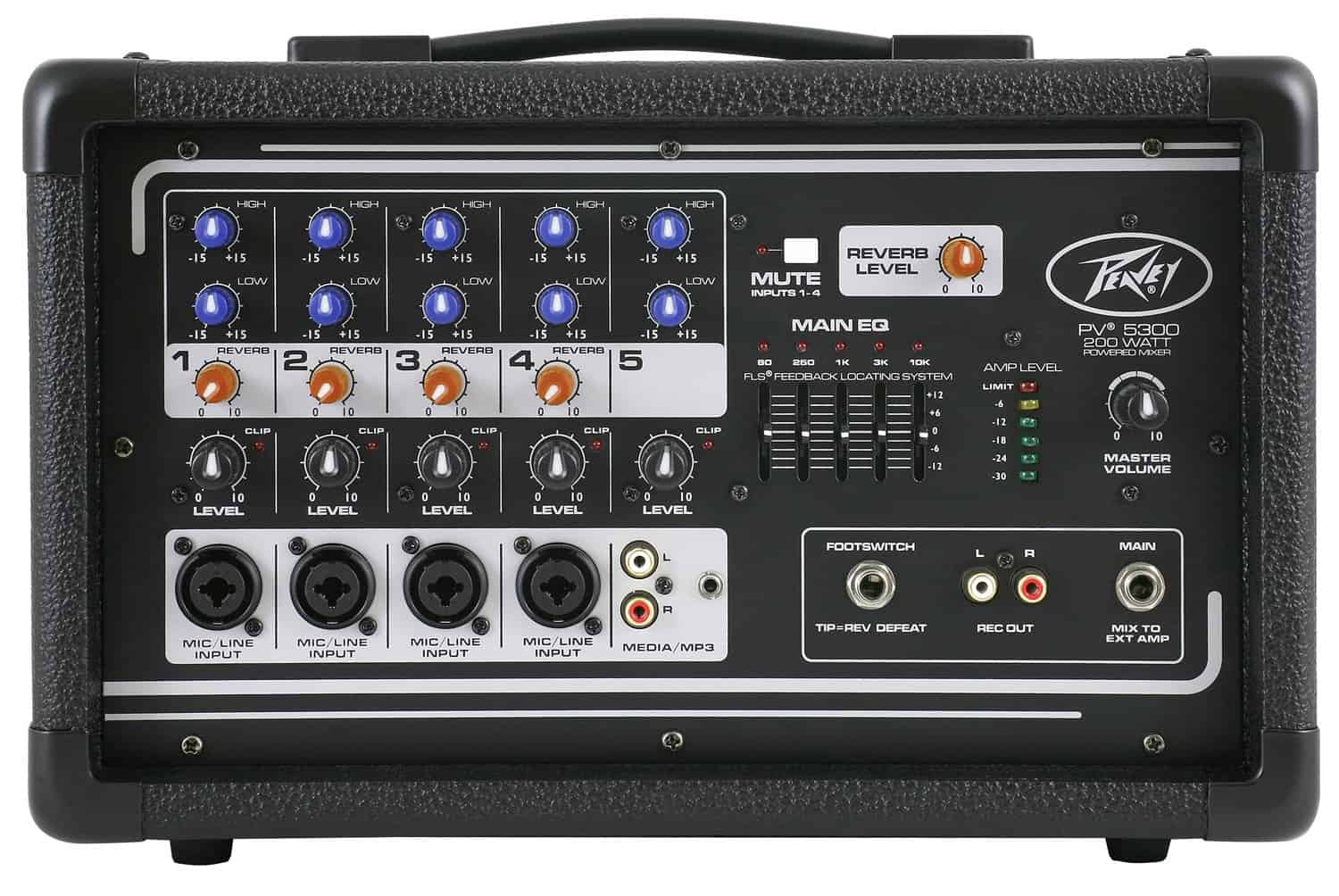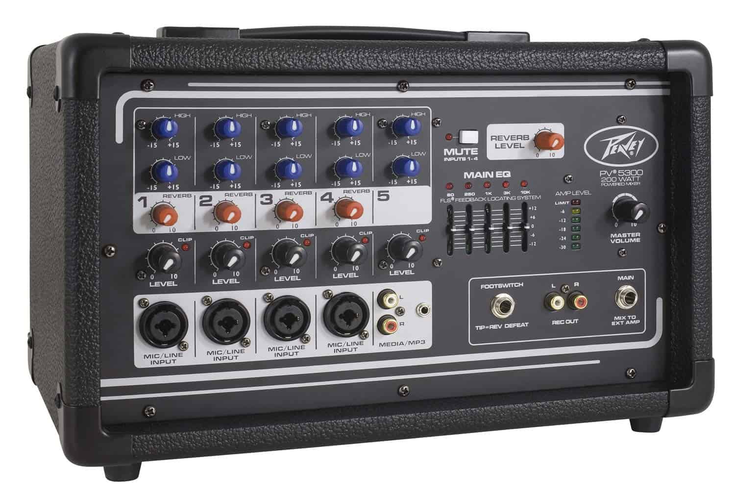 La Mezcladora Potenciada Todo en Uno Peavey PV 5300 es un equipo versátil que proporciona hasta cuatro entradas de combinación XLR y 1/4″ utilizando preamplificadores premium de micrófono Peavey, y 200 vatios de potencia pico para una reproducción de audio cristalina. La Peavey PV 5300 utiliza características exclusivas para ayudar a mejorar de forma precisa el tono y la claridad de las voces. Nuestro revolucionario Sistema de localización de retroalimentación FLS identifica y elimina rápidamente la retroalimentación. El reverb incorporado, con posibilidad de activación por pedal, complementa este equipo repleto de funciones. Conéctate casi a cualquier cosa a esta versátil mezcladora a través de los jacks integrados de 1/4″, RCA y mini de 1/8″.