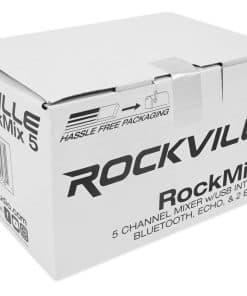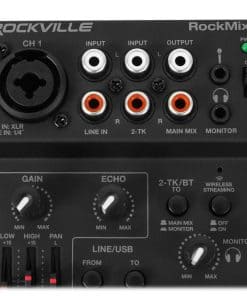 Mezcladora de 5 canales Rockville RockMix con interfaz USB, Bluetooth, eco, EQ de 2 bandas. Funciona con alimentación BUS, incluye pre-amplificador de micrófono super lineal de baja interferencia, indicadores de picos LED, Bluetooth integrado, alimentación phantom 18V y EQ británico clásico.