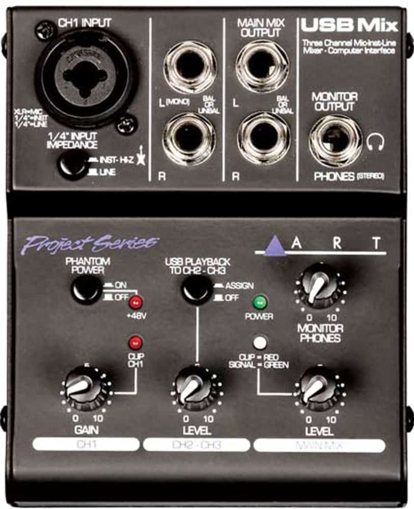 La ART USB Mix es una mezcladora de mic/instrumento/linea de 3 canales y una interfaz de audio USB. La USB Mix, alimentada por el bus USB, no solo te brinda una interfaz de audio de gran calidad para tu Mac o PC, sino también una versátil mezcladora de mic/linea con una entrada combo XLR/TRS, más otro canal de mezcla con entradas estéreo (o dos mono) de 1/4″. Todo esto está empacado en un estuche compacto y resistente de acero. Con su precio asequible, ¡no puedes permitirte no tener la ART USB Mix en tu arsenal de audio! Coloca una USB Mix en tu arsenal La ART USB Mix es una elección sólida si estás comenzando con la grabación de audio en computadora, ya que te brinda la funcionalidad de una mezcladora de mic/instrumento/linea de 3 canales, además de una interfaz de computadora. Todo está empacado en un estuche de acero ordenado, por lo que no ocupará mucho espacio en tu estudio, en tu escritorio o en tu mochila. La USB