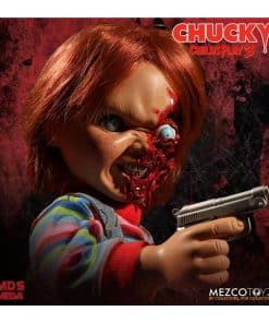 Vistiendo su conjunto característico de Good Guys y camisa a rayas, Chucky cuenta con 11 puntos de articulación, su cabello naranja característico y ojos de vidrio realistas. Viene completo con un arma que se ajusta perfectamente en su mano derecha.