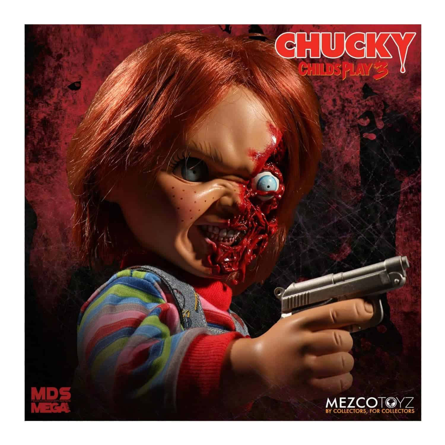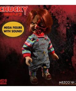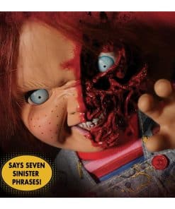 La serie Mezco Designer Series Talking Pizza Face Chucky presenta una nueva escultura de cabeza, que muestra el rostro mutilado de Chucky después de un encuentro con la guadaña del Segador en el ‘El Refugio del Diablo’.