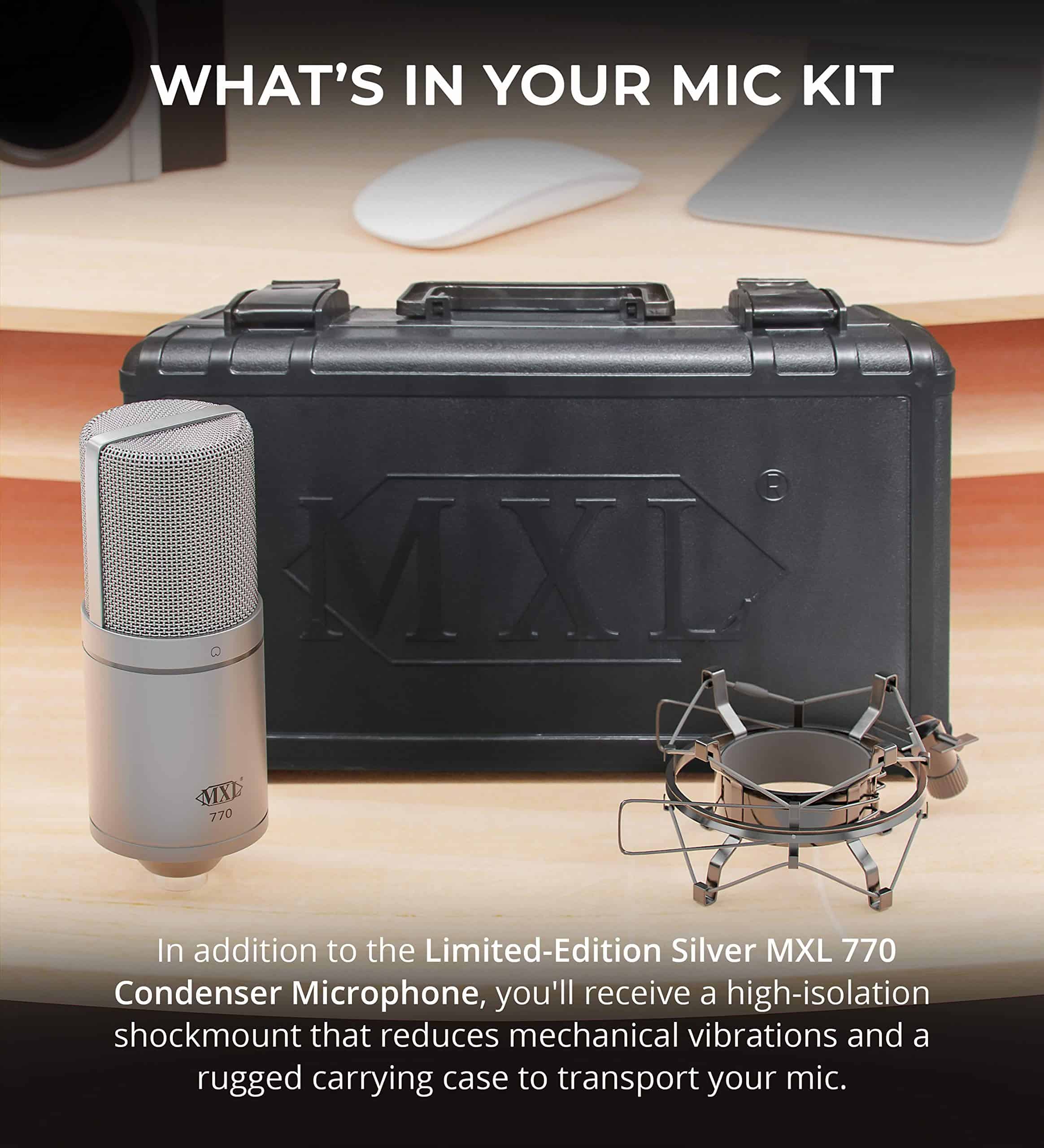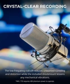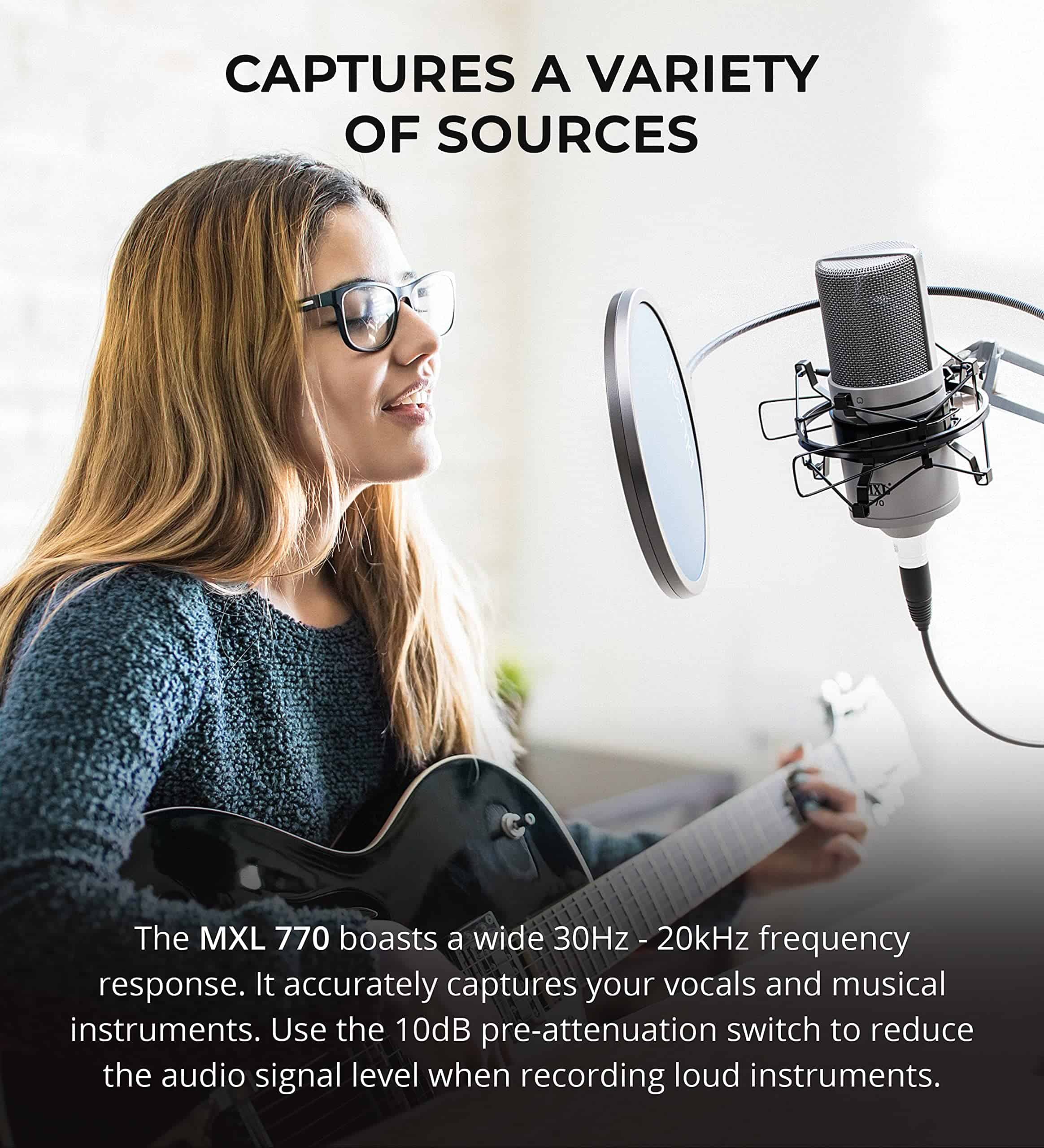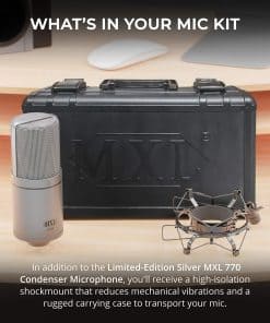 1. REPRODUCE SONIDOS DETALLADOS – El MXL 770 cuenta con una cápsula condensadora pequeña de 22 mm que captura de manera precisa los matices de tu fuente de audio. Ofrece una sólida respuesta de graves y agudos claros. 2. PROPORCIONA REPRODUCCIÓN DE AUDIO CLARA – El preamplificador FET de bajo ruido incorporado y la salida balanceada sin transformador ofrecen un amplio rango dinámico. Su patrón polar cardioide captura los sonidos que deseas enfrente y rechaza la captura de audio fuera del eje. 3. ENTREGA CALIDEZ Y CLARIDAD – Equipado con una respuesta de frecuencia de 30Hz-20kHz, el MXL 770 produce un sonido cálido con extra claridad y un rango medio equilibrado. Esto hace que el micrófono de condensador sea excelente para voces, pianos e instrumentos de cuerda. 4. MANEJA BIEN LOS INSTRUMENTOS FUERTES – El micrófono MXL 770 cuenta con un interruptor de pre-atenuación de -10dB, que facilita una amplia variedad de fuentes de sonido. El micrófono de condensador puede manejar hasta 137dB SPL y requiere alimentación fantasma de +48V para funcionar. 5. INCLUYE – Micrófono de Condensador Cardioide MXL 770 (Plata); Soporte de Aislamiento de Choques; Estuche Resistente. Brazo de Micrófono Todo en Uno Blucoil con Filtro Anti-Pop. Cable XLR Balanceado de 10 pies Blucoil – Serie Premium – Cable de 3 pines para micrófonos, altavoces y dispositivos profesionales (hembra a macho).