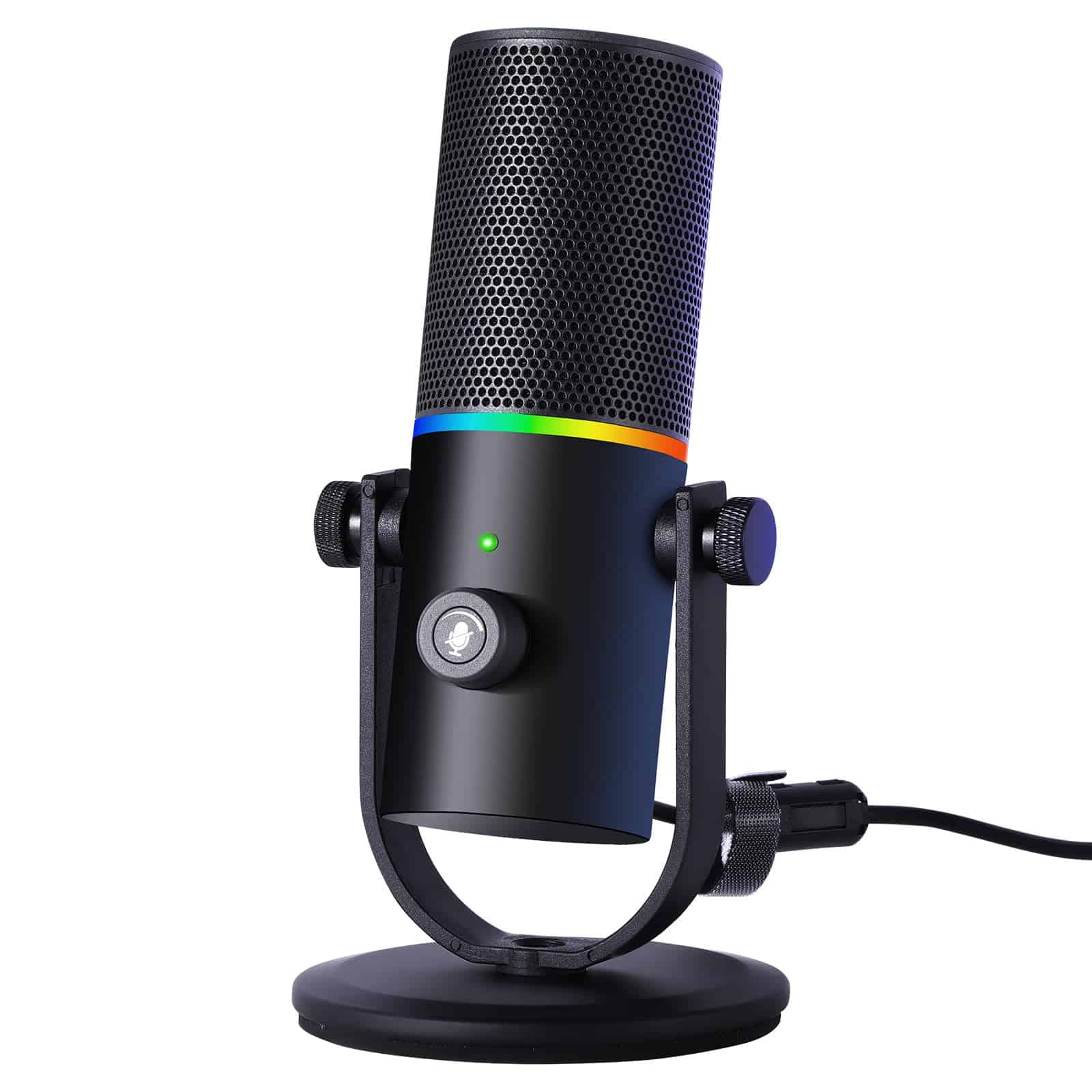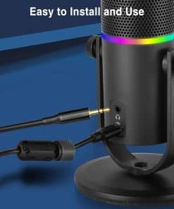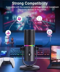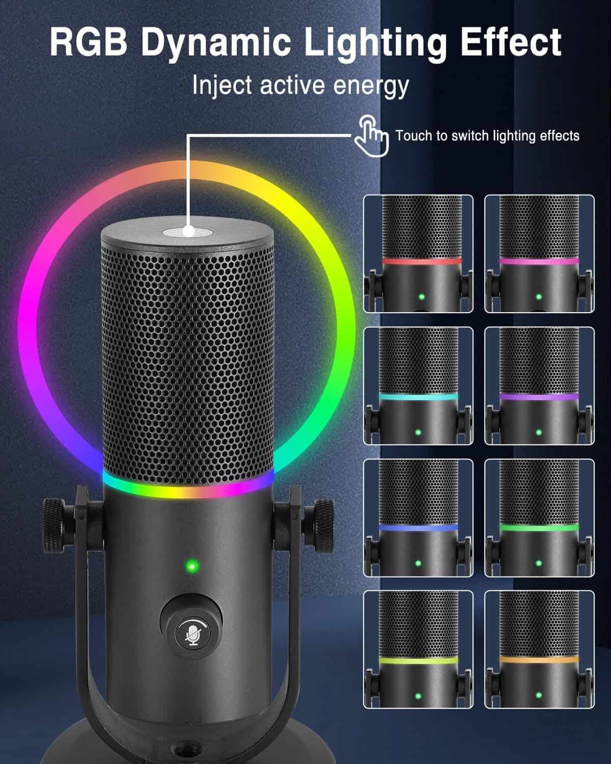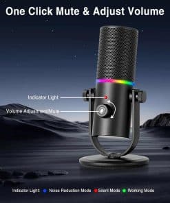 Micrófono de podcast con calidad de sonido súper claro, patrón de captación cardioide, conexión tipo C, operación sencilla, botón de silencio, efecto de iluminación RGB dinámico