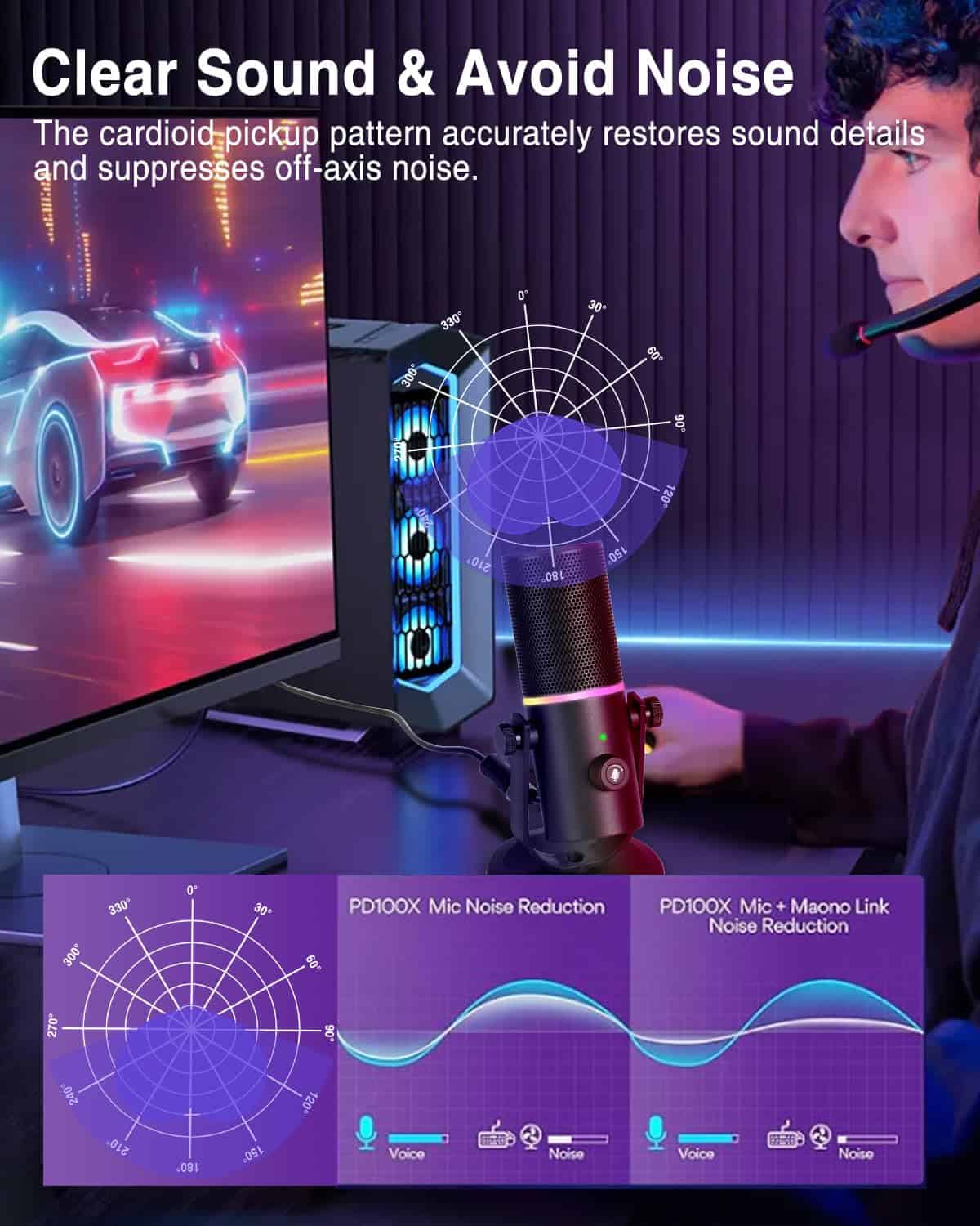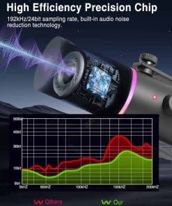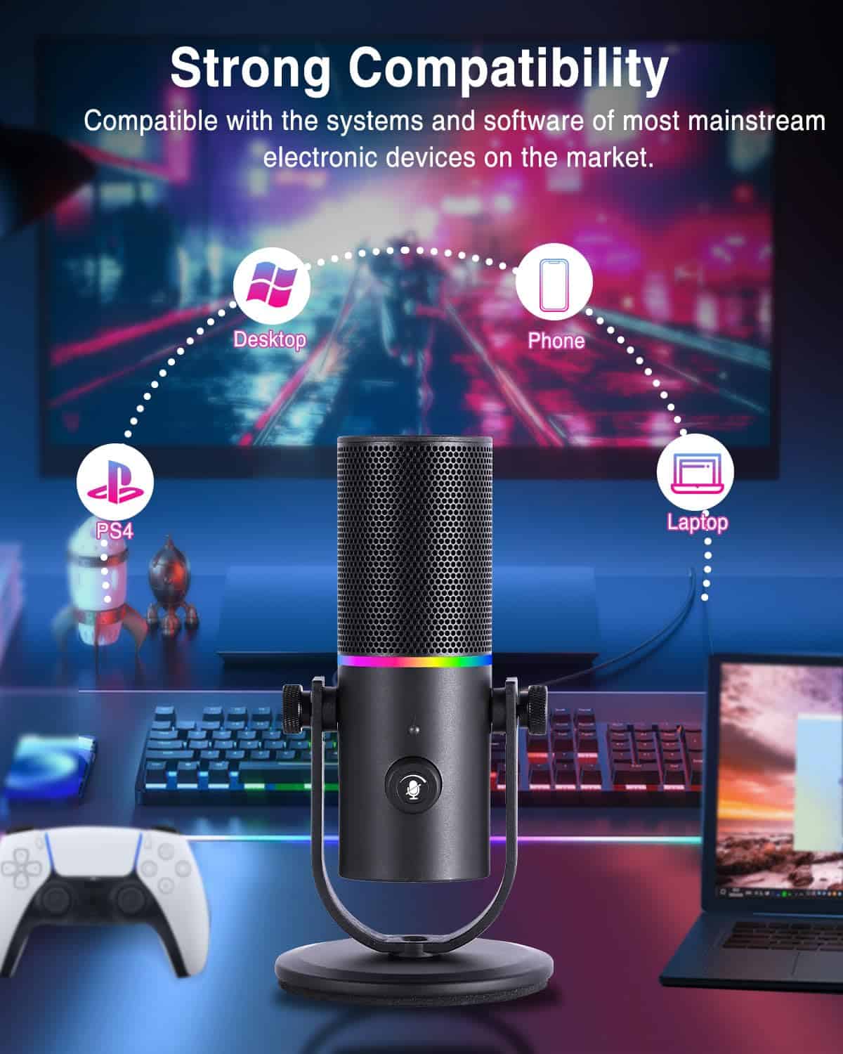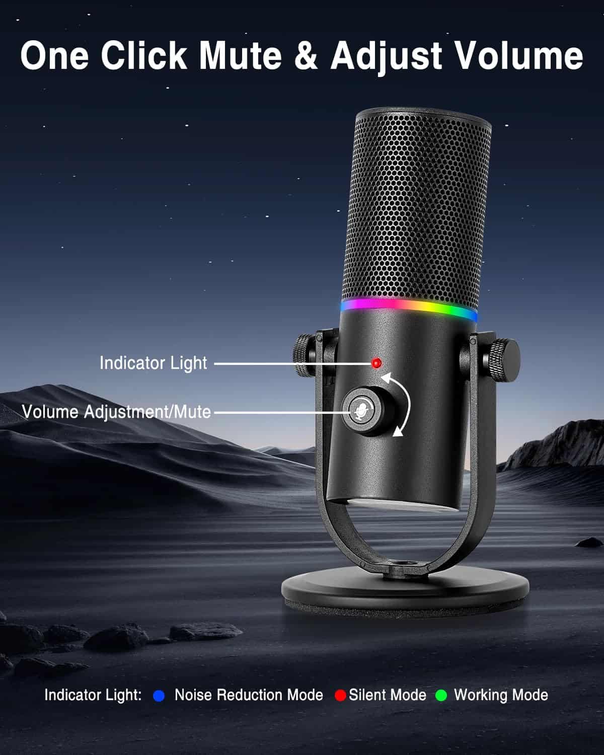 Micrófono de podcast con calidad de sonido súper claro, patrón de captación cardioide, conexión tipo C, operación sencilla, botón de silencio, efecto de iluminación RGB dinámico