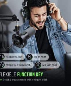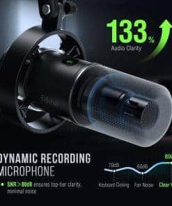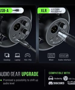 1. Calidad de sonido limpia. Micrófono dinámico XLR de metal para podcast con SPL de 130dB que no distorsionará el audio de la grabación vocal, de video o de música, manteniendo su originalidad. Patrón cardioide direccional elimina ruido de fondo. El micrófono de grabación de estudio ofrece una voz detallada sin necesidad de procesamiento adicional de ruido. (Soporte no incluido). 2. Salida XLR mejorada para un espacio de audio envolvente inmersivo en podcast. Reduce la interferencia de ruido del circuito. Relación S/N superior a 80dB para una calidad de audio mejorada. 3. Conexión USB práctica para grabar en PC de manera rápida. Plug and play sin necesidad de software adicional. 4. Control de mudo y ganancia fácil de usar. Control de volumen de auriculares para monitoreo en tiempo real. 6. Reducción adicional de ruido con parabrisas y montura de choque incluidos. Consejos cálidos y accesorios incluidos.