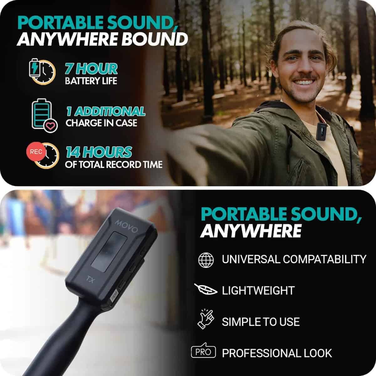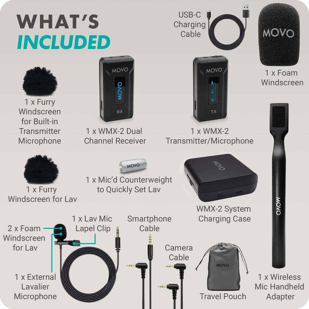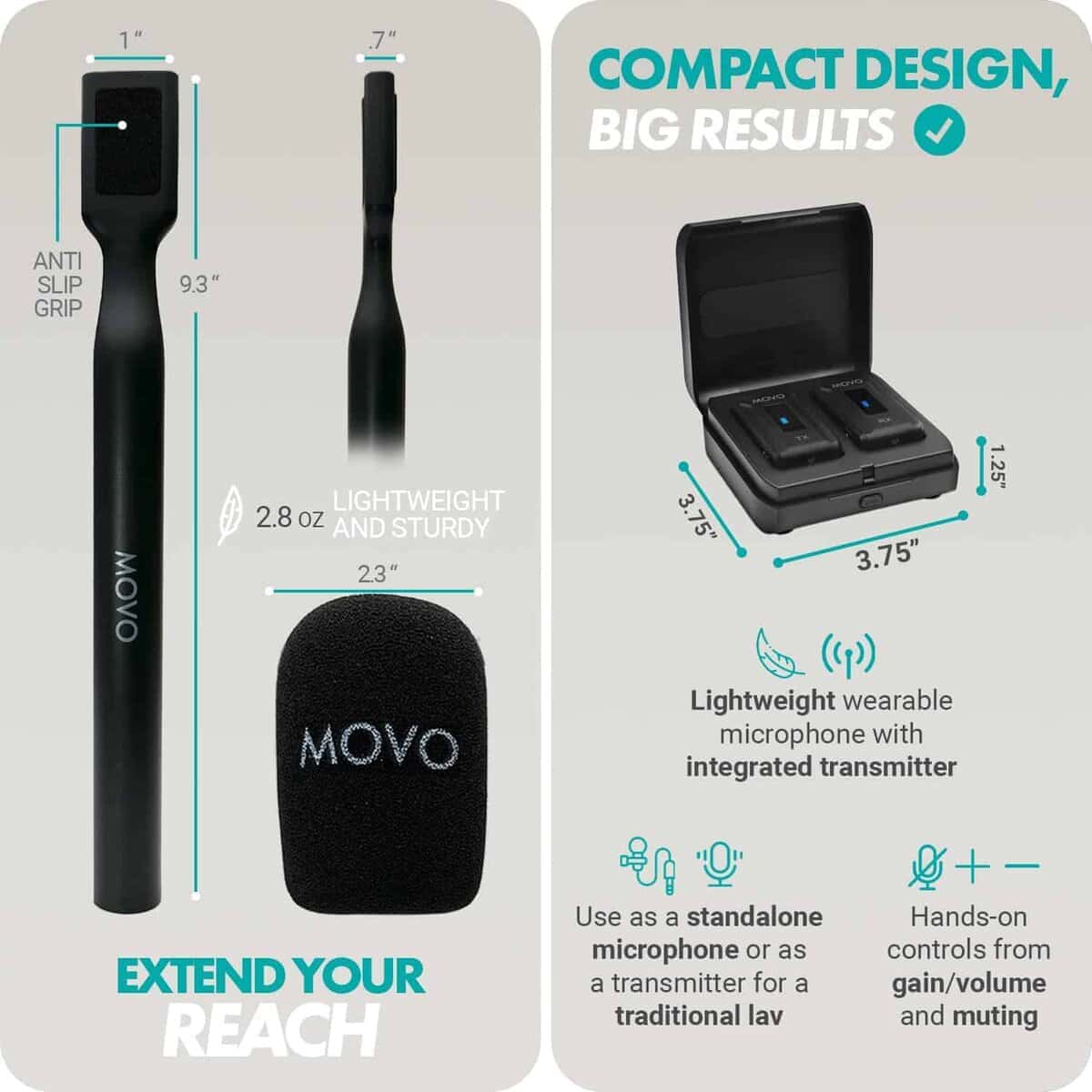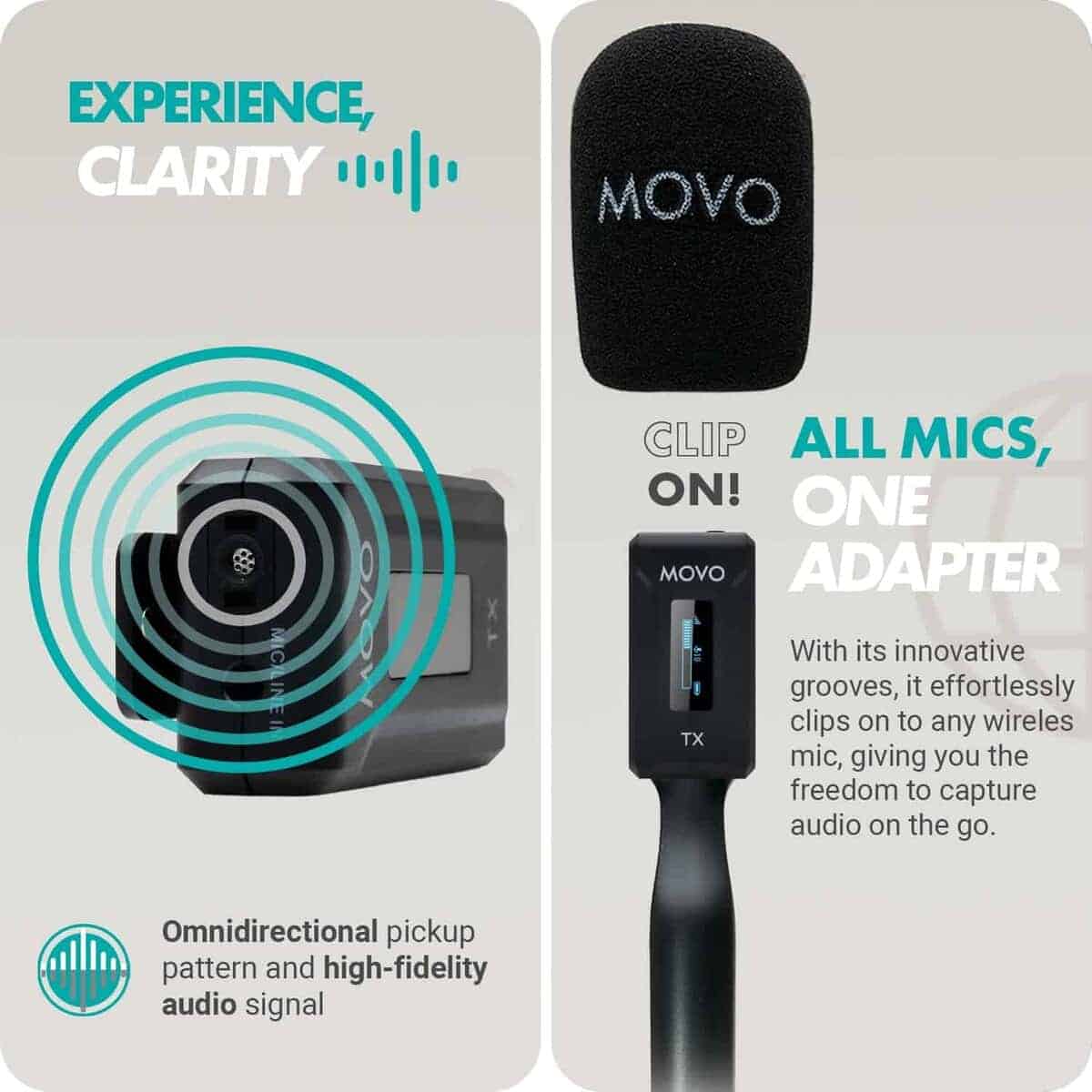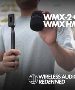 Micrófono inalámbrico de solapa Movo WMX-2 con estuche de carga y adaptador de mano WMX-HM. Completa el paquete con un adaptador de mano WMX-HM, que te permite sostener cómodamente el micrófono o fijarlo a un soporte para uso manos libres. El sistema de micrófono opera en una banda de transmisión 2.4GHz altamente estable, y cuenta con Salto de Frecuencia Adaptativo (AFH), asegurando una señal clara y libre de ruidos a distancias de hasta 328 pies. Graba en mono o estéreo. Con una duración de batería de hasta 7 horas, y un estuche de carga que te brinda una carga completa adicional, puedes grabar todo el día sin preocuparte por quedarte sin batería. ¡Tenemos tu respaldo! Nuestros productos están diseñados para aliviar tus problemas técnicos, no para agregar más. Nuestro amigable soporte en EE. UU. está aquí para ayudarte.