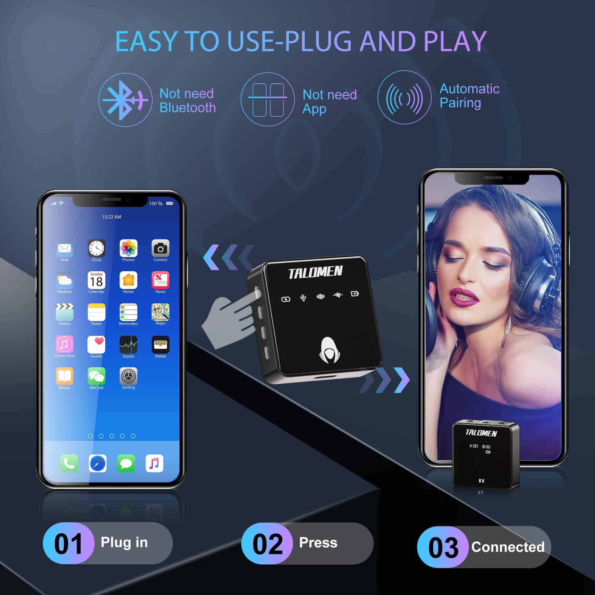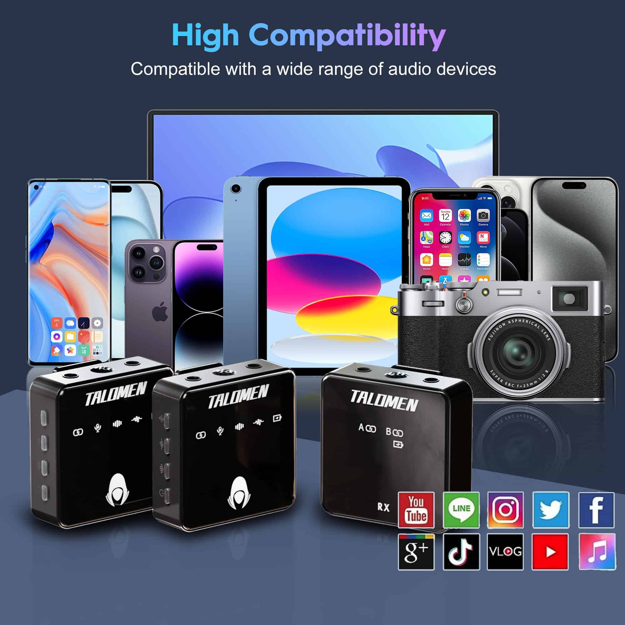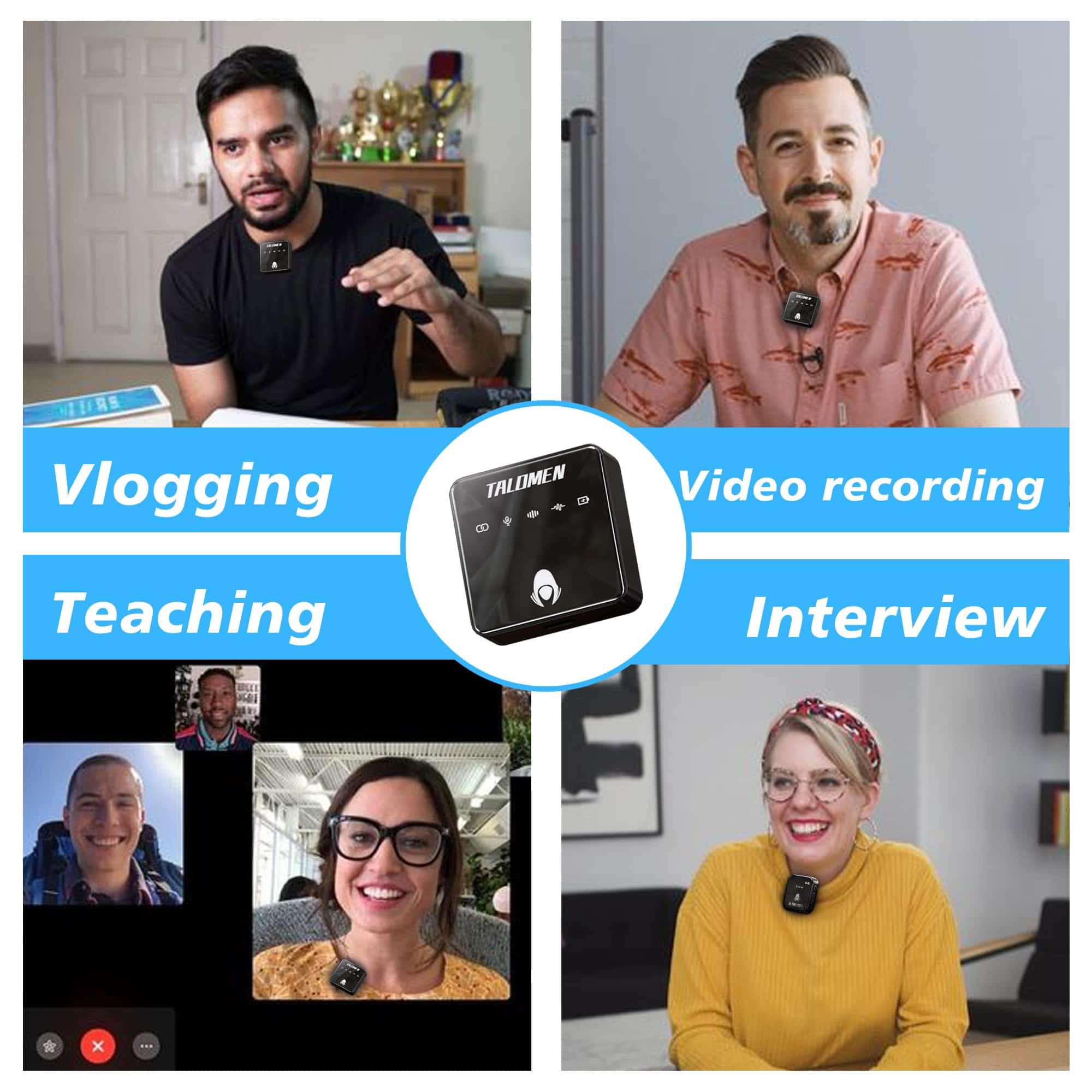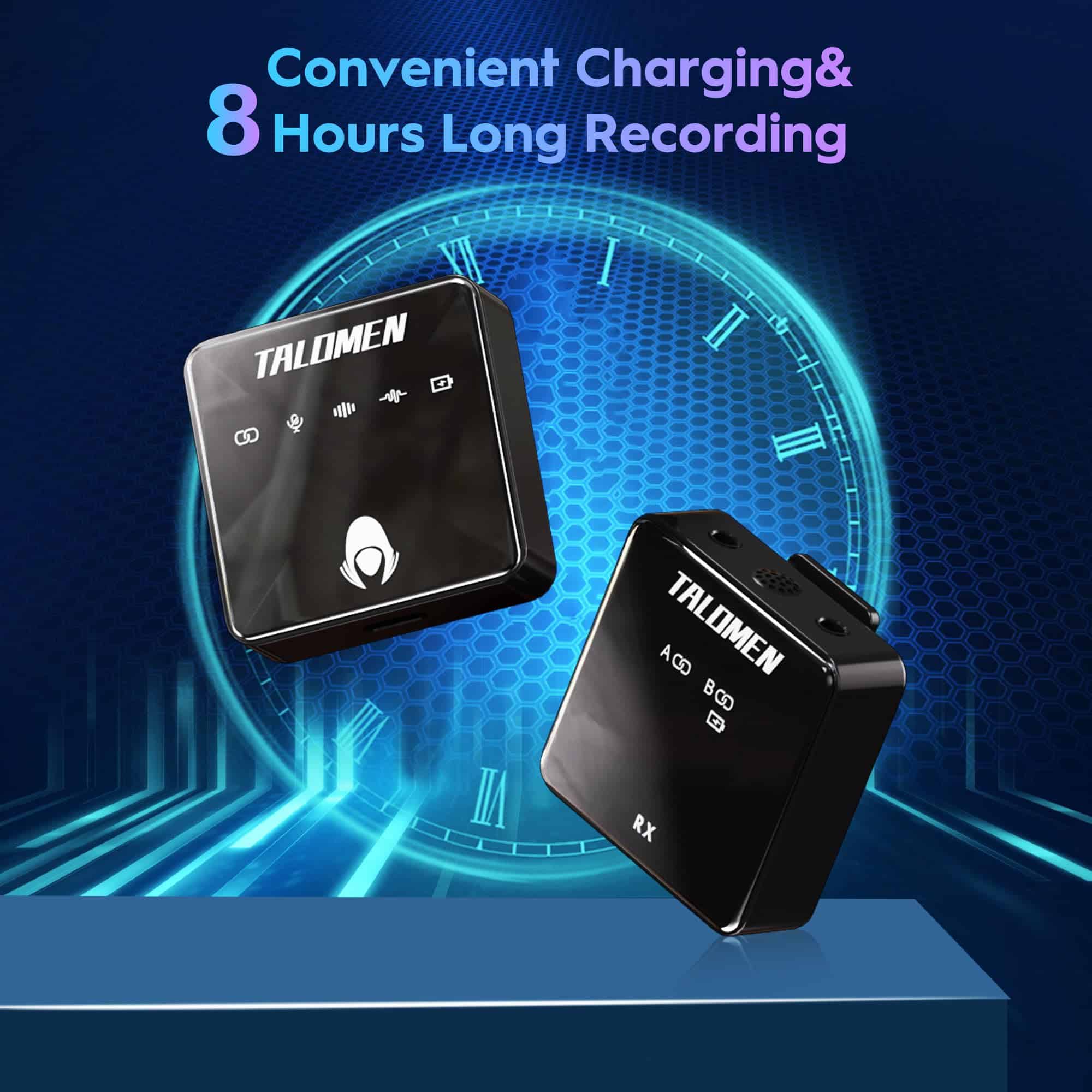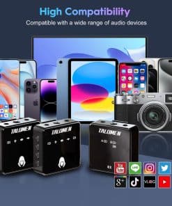 1. Sonido cristalino y efecto de reverberación El micrófono inalámbrico Talomen es reconocido por su capacidad para capturar un sonido cristalino y grabar detalles de audio ricos. Con su tecnología de efecto de reverberación integrada, ofrece una experiencia de audio excepcional, haciendo que cada sesión de grabación suene como si se hubiera hecho en un estudio de grabación profesional. 2. Uso de uno a dos y conexión automática El micrófono de solapa inalámbrico Talomen admite el uso de uno a dos, lo que le permite conectar simultáneamente dos dispositivos, como una cámara y un smartphone, para grabación multicanal. También cuenta con una función de conexión automática al iniciar, no requiere una configuración compleja, lo que hace que la grabación sea muy sencilla. 3. Reducción inteligente de ruido con chip DSP El chip DSP (Procesamiento de Señal Digital) integrado reduce inteligentemente el ruido de fondo, garantizando una grabación de sonido clara en diversos entornos. No importa dónde estés, el micrófono de podcast Talomen ofrece un audio de alta calidad. 4. Tecnología inalámbrica 2.4G Rango de transmisión de 80 metros 262 pies El micrófono Talomen utiliza tecnología inalámbrica 2.4G para ofrecer un rango de transmisión estable de hasta 80 metros, permitiéndote la libertad de moverte sin restricciones de distancia. Esto lo hace ideal para grabaciones al aire libre, entrevistas, transmisiones en vivo, grabaciones de bodas, enseñanza en línea, YouTube, grabación de audio, podcasts, estudios y más. 5. Conexión inalámbrica Universal El micrófono de solapa Talomen ofrece una amplia compatibilidad, convirtiéndolo en la elección perfecta para todas tus necesidades de grabación. Ofrece una conectividad sin problemas con diversos dispositivos, incluyendo cámaras, computadoras, smartphones y más. Con opciones de cable versátiles, puedes conectar fácilmente a tu equipo de grabación preferido. Ya seas un creador de contenido aspirante o un profesional, Talomen garantiza que puedas capturar una calidad de audio excepcional en múltiples plataformas. 6. Nos comprometemos y brindamos 12 meses de reemplazos sin problemas, no se requieren reparaciones. No importa los desafíos que puedan surgir, puedes contar con nuestro impecable soporte postventa. Además, nuestro equipo de servicio al cliente dedicado está a tu disposición las 24 horas del día, los 7 días de la semana, garantizando tu tranquilidad. Cuando inviertes en nuestro producto, no solo obtienes un rendimiento excepcional, sino también un servicio postventa excepcional, que te permite usar tu micrófono con completa confianza.