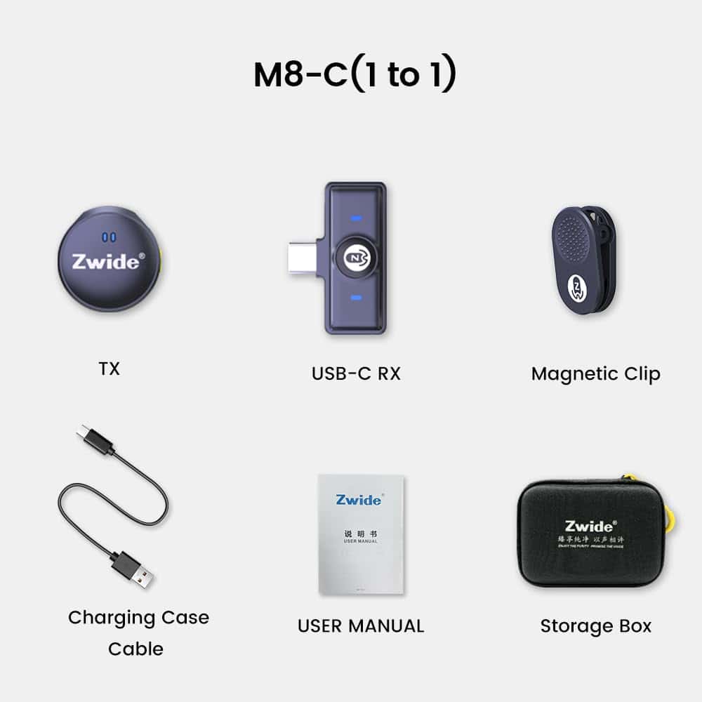 El micrófono inalámbrico de solapa Zwide M8-C(1to1) consta de 1 receptor USB-C, 2 transmisores. Función de cancelación de ruido y reverberación compatible para grabación de video y streaming. Diseño tipo botón, muy pequeño y ligero, fácil de llevar. Reducción de ruido con un clic y reproducción sin necesidad de sacar el RX, protegiendo el puerto de tus dispositivos. El Clip Magnético se puede separar del TX y admitir varios estilos de uso. Tus dispositivos, como teléfonos móviles que graban video, también admiten carga mientras se utilizan a través del RX conectado.