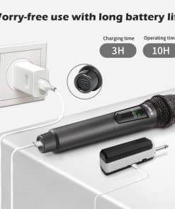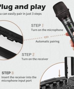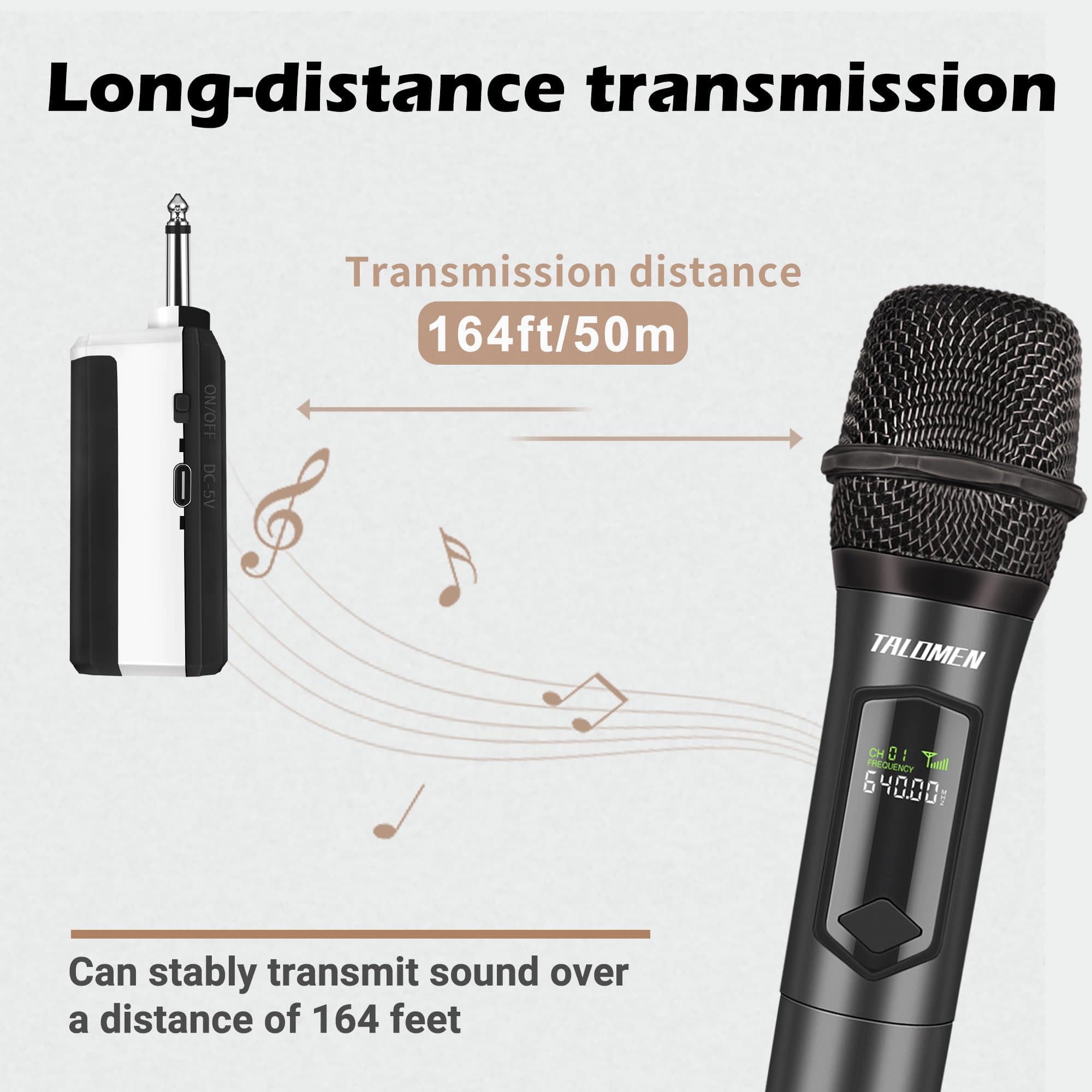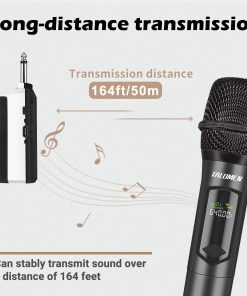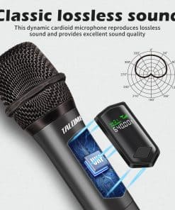 Micrófono inalámbrico talomen en frecuencia de 2.4G Hz con un alcance de 160 pies para libertad de movimiento en escenarios interiores y exteriores. Ofrece calidad de sonido superior con núcleo de micrófono dinámico, tecnología de reducción de ruido DSP y estabilidad de señal. Fácil de usar, solo conectar el receptor a un dispositivo con entrada de micrófono. Funciona con baterías recargables incluidas que se cargan en 2-3 horas y ofrecen más de 10 horas de uso continuo. Compatible con una variedad de dispositivos y adecuado para diversas ocasiones como canto, discursos, etc. Incluye accesorios y garantía de servicio de reemplazo gratuito por 1 año. ¡Obtén tu set de micrófonos inalámbricos para disfrutar de excelente calidad de sonido en cualquier evento!