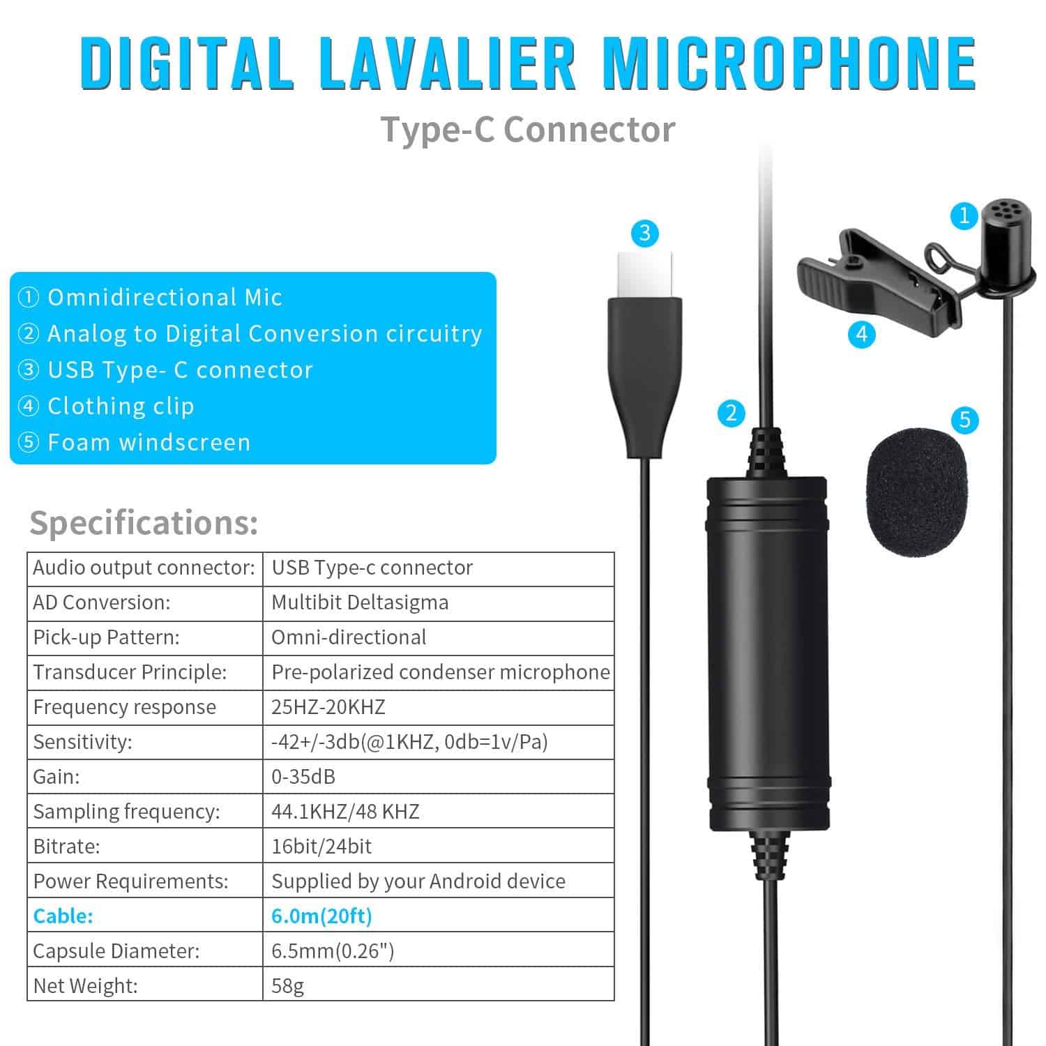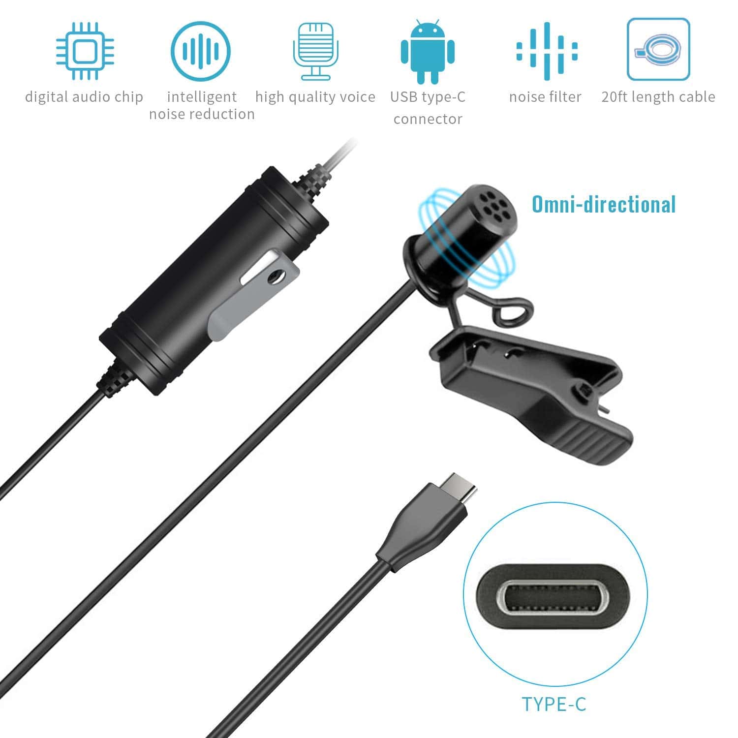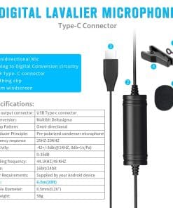 El micrófono de solapa Velikon VK-DM2 cuenta con un conector USB Type-C especialmente diseñado para dispositivos Android, incluidos teléfonos inteligentes y tabletas Samsung Galaxy. No requiere baterías para funcionar, lo que ofrece una configuración y mantenimiento sin complicaciones. El micrófono de grabación de solapa tiene una circuitaría de conversión de audio a digital integrada que minimiza efectivamente el ruido ambiental no deseado e interferencia de eco. Captura con precisión el audio a 24 bits/48 kHz, lo que garantiza la entrega de una calidad de sonido de alta fidelidad y cristalina. La cápsula de condensador omnidireccional está hecha de metal sólido y permite una captura precisa del sonido en un patrón de 360 grados. Es la elección ideal para Youtubers, Podcasters, Vloggers, así como para grabaciones en Facebook, Twitter e Instagram. El cable de audio de alta calidad extra largo de 20 pies proporciona una distancia cómoda para la grabación de audio y está hecho de material de alta elasticidad para facilitar su uso. La pantalla anti-pop de espuma incluida puede reducir eficazmente los ruidos del viento y de manipulación. Especificaciones: Conector de Salida de Audio: USB Type-C Conversión AD: Multibit Delta Sigma Patrón de Captación: Omnidireccional Respuesta de Frecuencia: 25Hz-20KHz Sensibilidad: -42+/-3dB(@1KHz,0db 1v/Pa) Frecuencia de Muestreo: 44.1kHz/48kHz Bitrate: 16Bit/24Bit Longitud del Cable: 6.0m(20ft) Peso Neto: 58g. Incluye: 1 Micrófono 1 Pantalla anti-pop de espuma 1 Estuche de transporte 1 Manual de usuario (Inglés) 1 Organizador de cables Velikon
