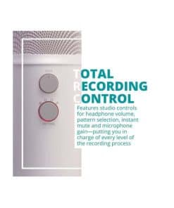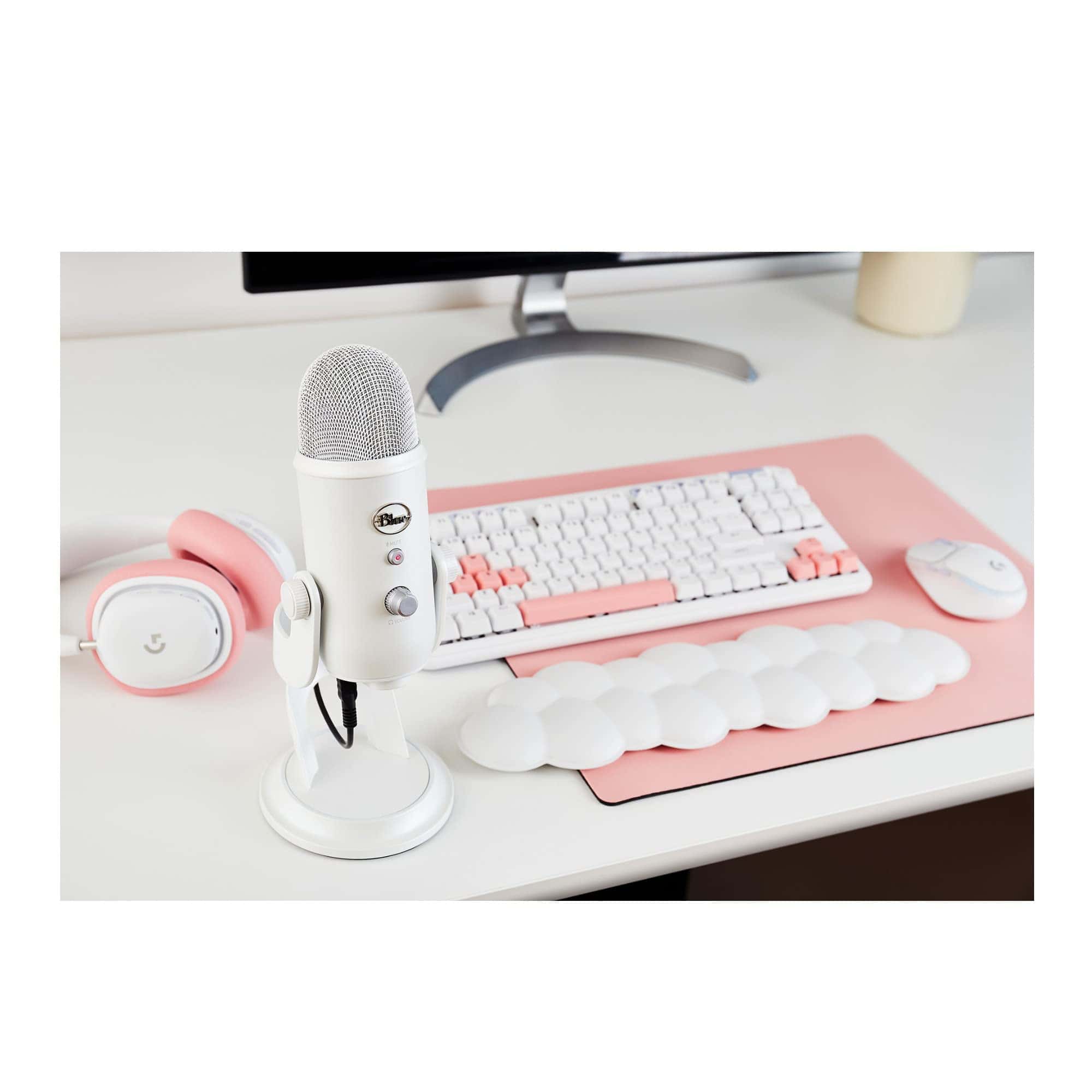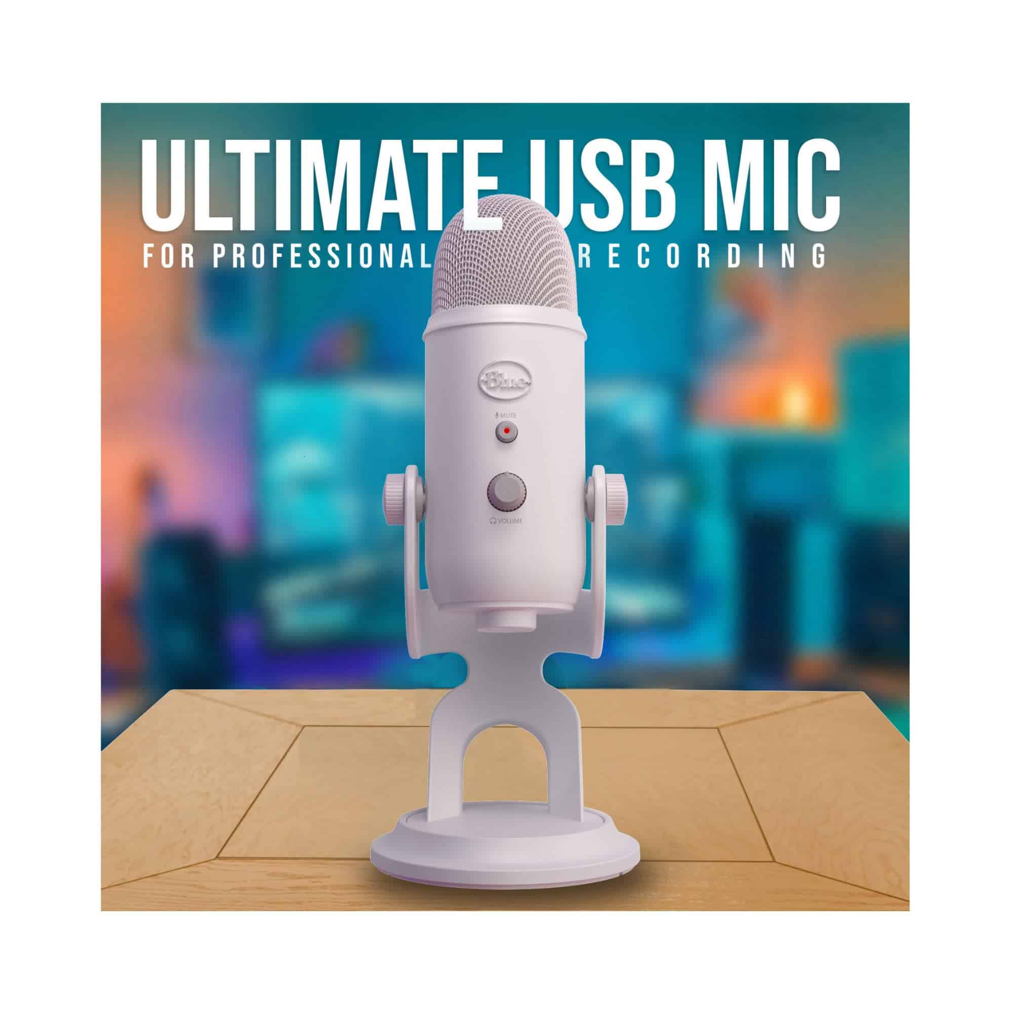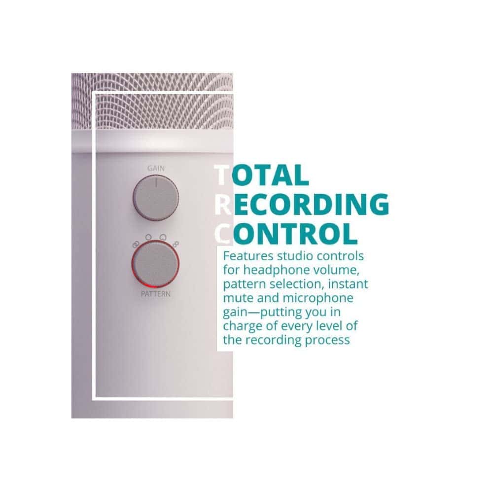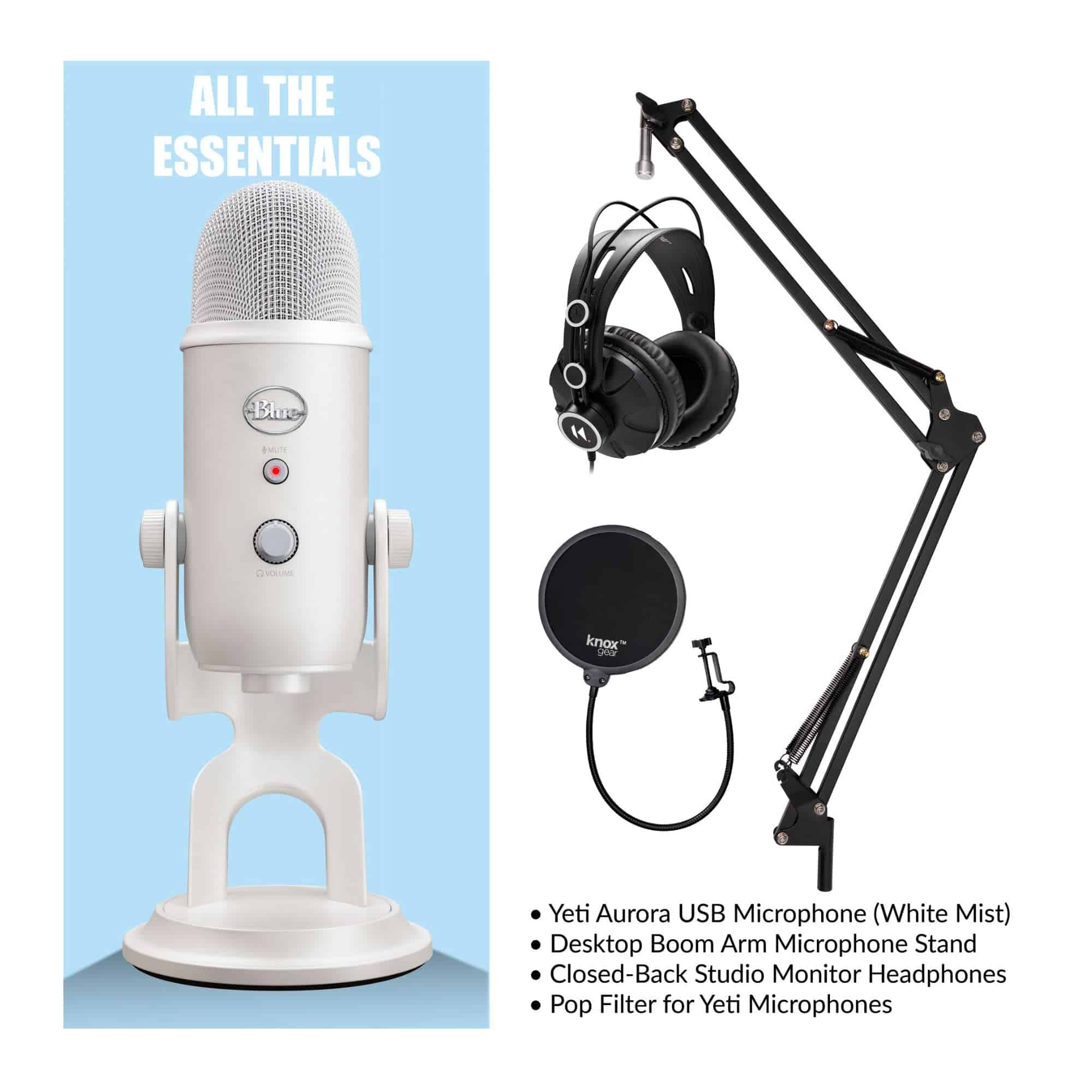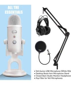 Bundle Incluye: Micrófono USB Blue Yeti (White Mist), Brazo de micrófono de sobremesa, Auriculares de monitor cerrados TX-100 y Filtro Pop para Micrófonos Yeti.