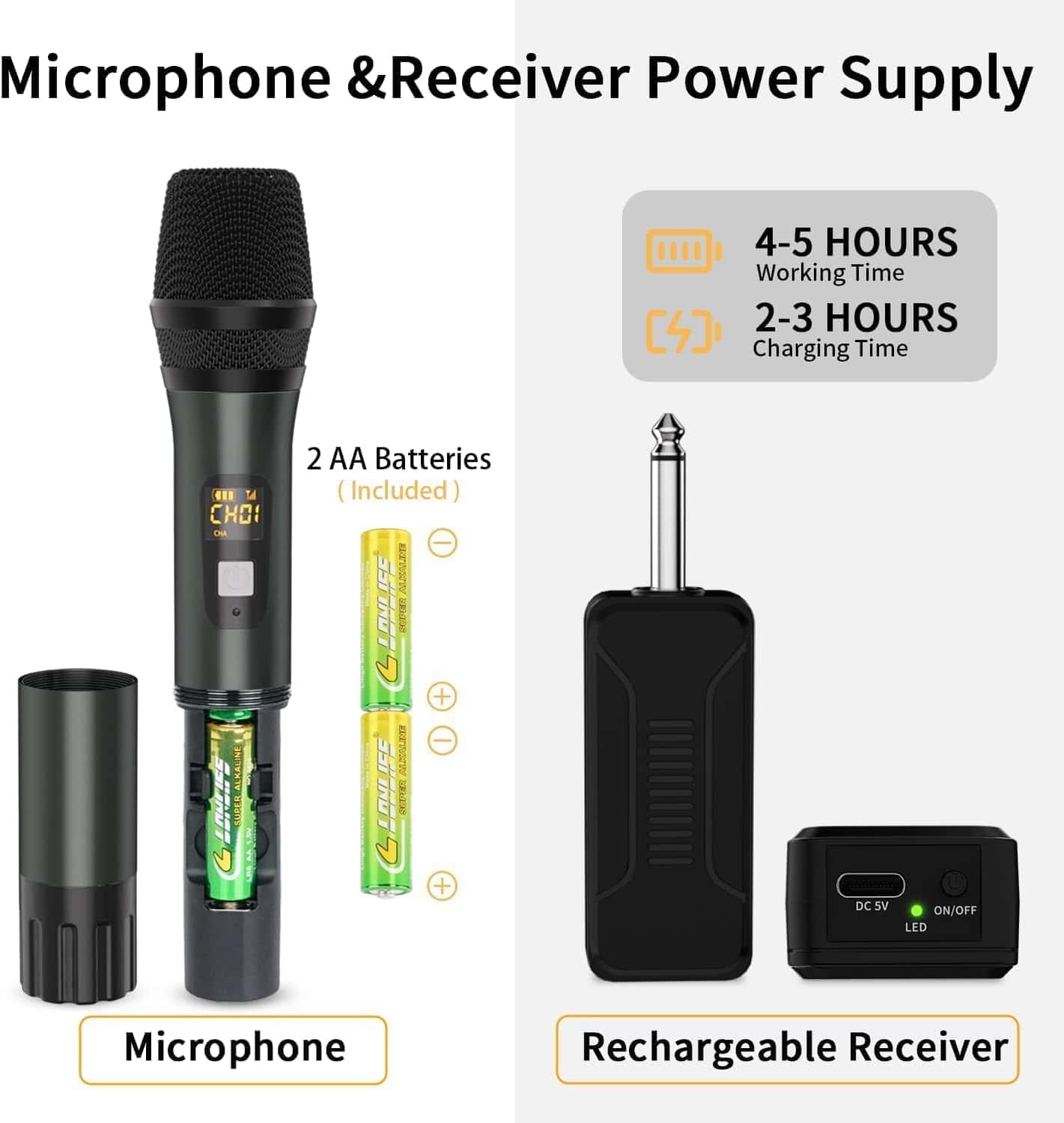 Micrófonos inalámbricos profesionales de mano dobles de metal UHF con sistema de micrófono dinámico recargable, salida de 1/4″, rango de 160 pies, conexión automática para karaoke, canto de fiesta, iglesia, discurso, DJ. Este micrófono inalámbrico de alta calidad ofrece un sonido claro y completo gracias al micrófono dinámico profesional incorporado y la tecnología de reducción de ruido. El micrófono está diseñado con material de aleación para mayor resistencia y ligereza. Con un rango inalámbrico de hasta 160 pies, garantiza una conexión estable y rápida. Es fácil de usar ya que se empareja automáticamente al encender el micrófono y el receptor. Admite hasta 2 micrófonos utilizados juntos. Compatible con Karaoke Machine, Amplificador de Audio, Pa System, Mixer, Voice Amplifier y más. No es compatible con Bluetooth. El receptor recargable puede funcionar durante 4.5 horas y se carga por completo en 2.5 horas. Cada micrófono requiere 2 pilas alcalinas AA. La pantalla LCD muestra la conexión, canal y energía restante. Incluye una caja con conector de 3.5mm. Soluciona problemas comunes como falta de energía, problemas de conexión y falta de sonido. Para garantizar la satisfacción del cliente, ofrecemos soporte en línea las 24 horas y 3 años de garantía en estos micrófonos inalámbricos.
