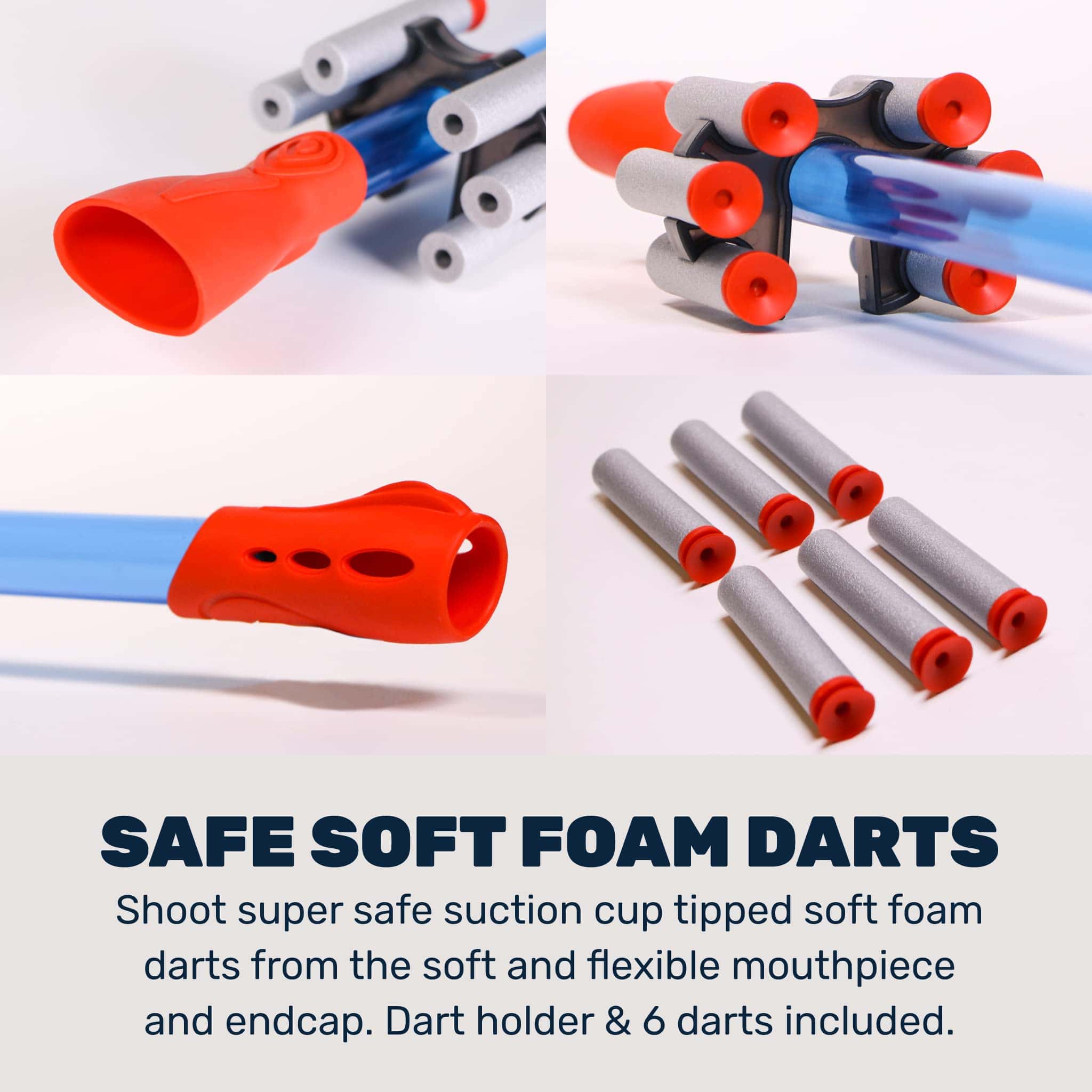 4. FÁCIL DE USAR: Simplemente carga un dardo con punta de ventosa en la tapa del extremo del tubo de soplo. (Consejo: solo carga un dardo a la vez con el extremo de espuma primero.) Luego inhala fuerte para aspirar y preparar el dardo, asegurándote de que pase por todo el tubo de soplo y se detenga en la boquilla. Una vez que hayas cargado y preparado el dardo, apunta a tu objetivo y prepárate para soplar. ¡Con una exhalación fuerte y rápida a través de la boquilla, envía el dardo volando hacia tu objetivo!