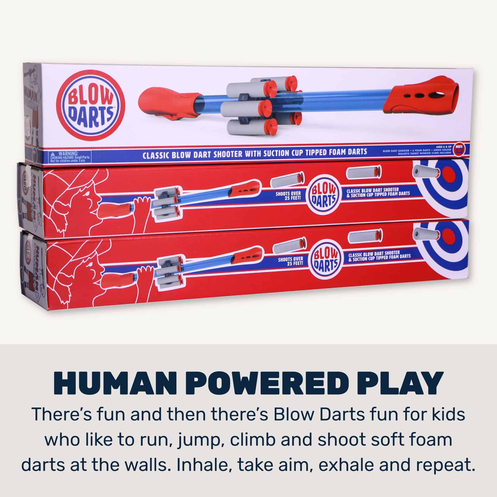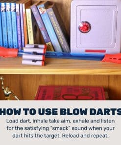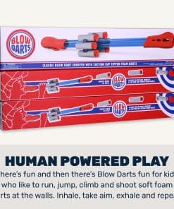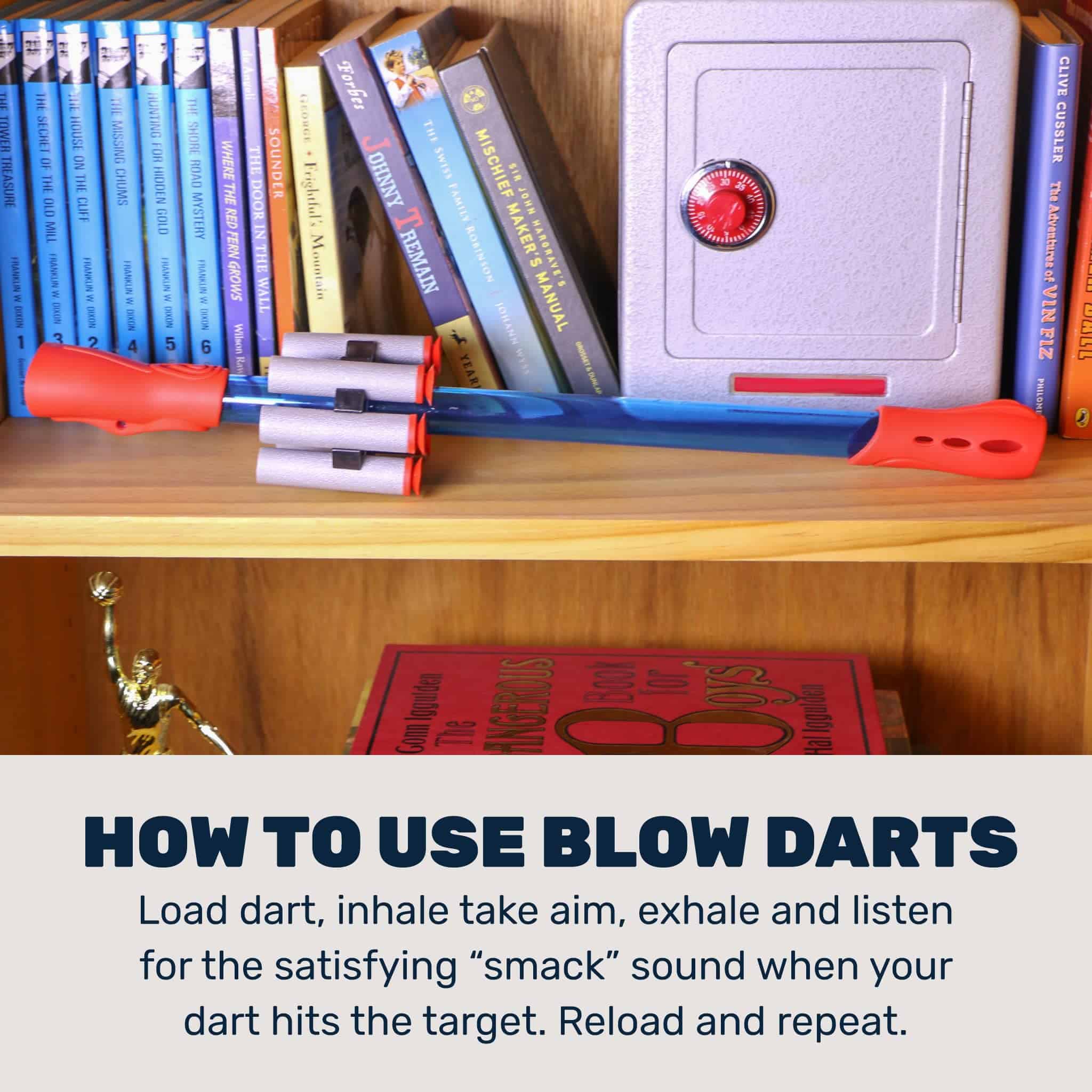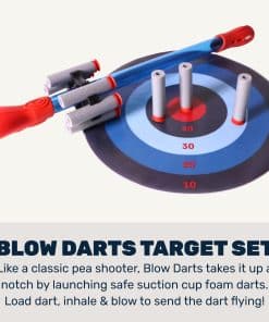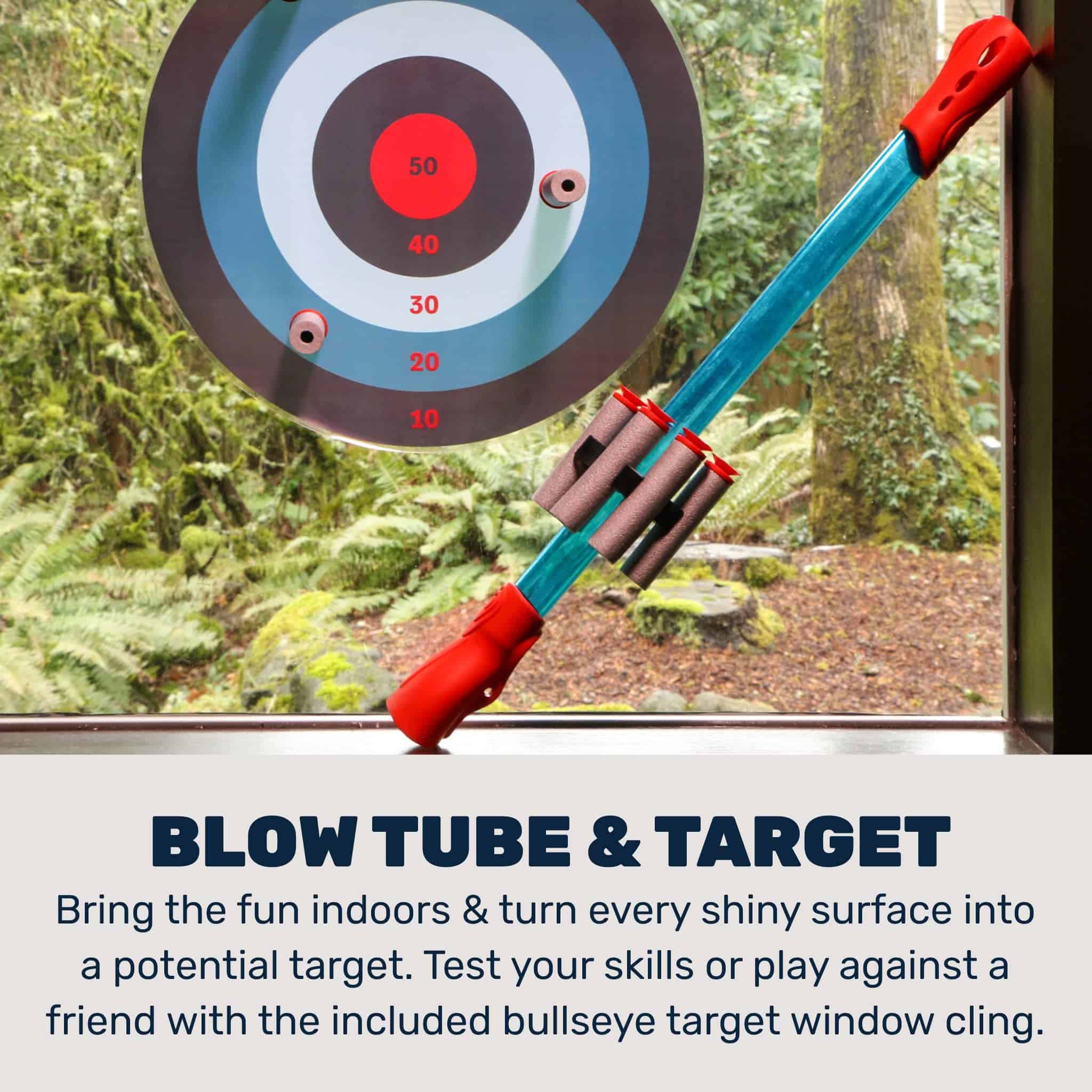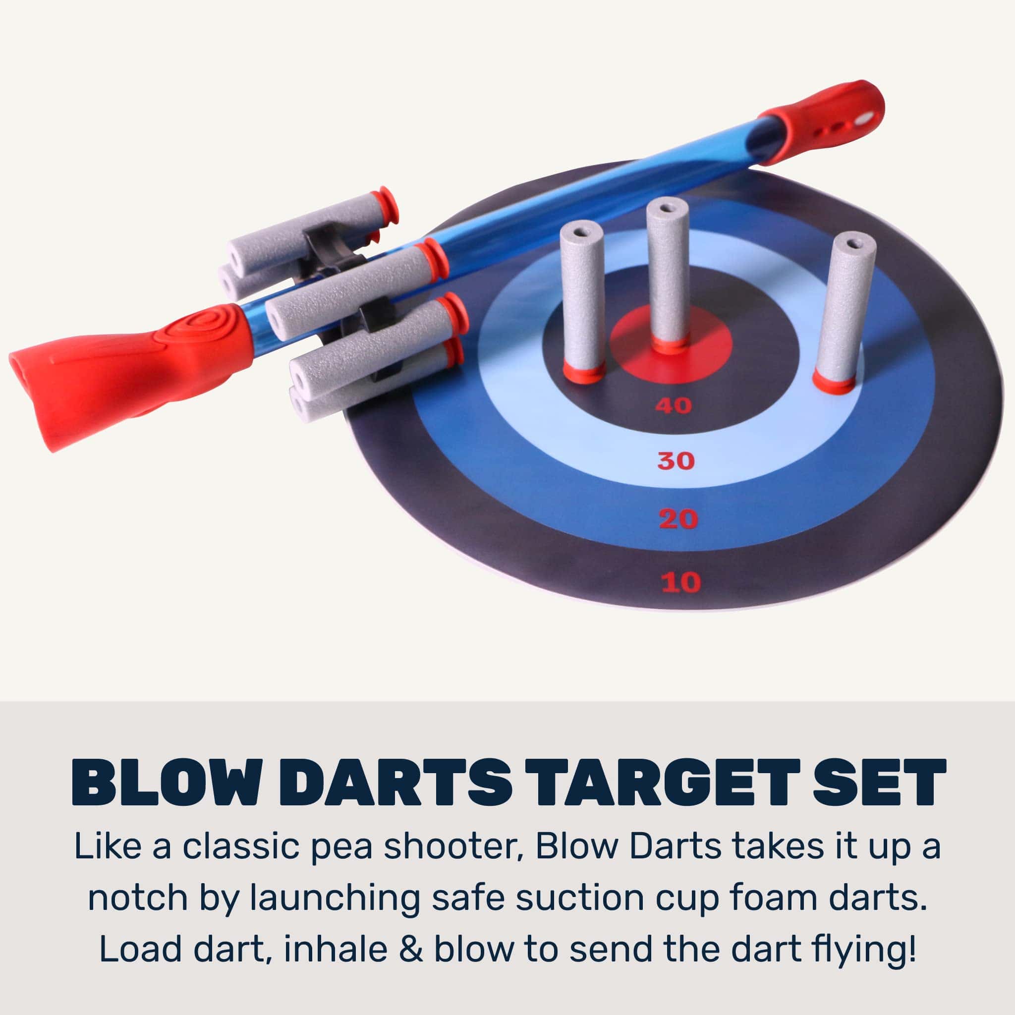 1. COMO UNA CLÁSICA PEA SHOOTER CON DARDOS: Blow Darts lleva las cosas a otro nivel al lanzar dardos con punta de ventosa de espuma suave. ¡Super divertido y fácil de usar! Carga el dardo de espuma en el extremo del tubo de soplo, inhala profundamente para preparar el dardo, luego sopla con fuerza para enviar el dardo volando! Escucha el satisfactorio golpe cuando tu dardo golpea y se pega a cualquier superficie brillante, espejo o ventana. También se incluye una imagen de diana adhesiva marcada para probar tu puntería. ¡Disparar Blow Darts es una explosión!