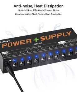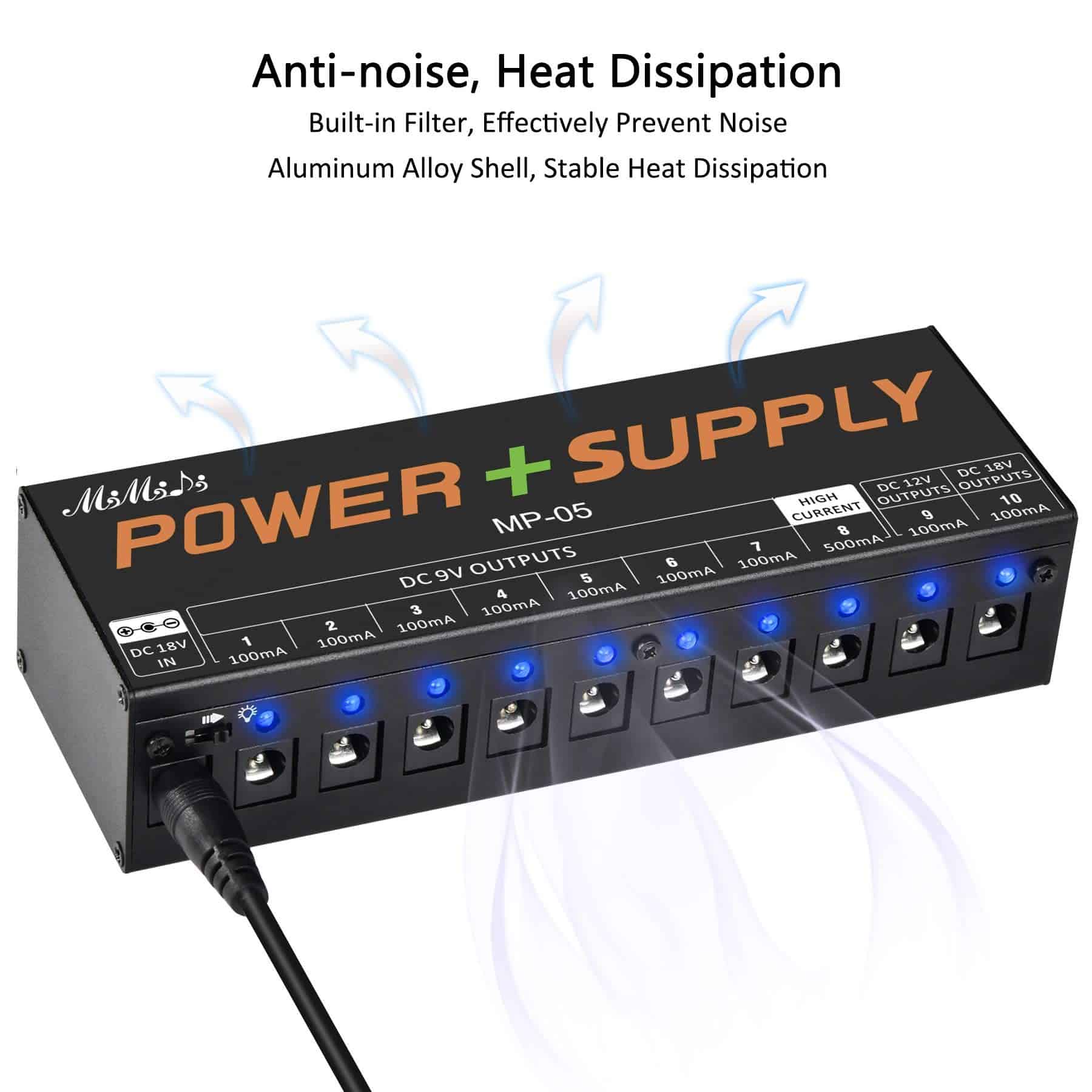 4. Menos Ruido / Disipación del Calor – Con un potente filtro de ruido incorporado, esta fuente de alimentación para pedaleras puede mejorar significativamente el problema de ruido. Utilizando materiales de aleación de aluminio de alta calidad para la disipación de calor, chips IC cuidadosamente seleccionados, generan menos calor. Y hay suficiente espacio dentro del equipo para una refrigeración rápida.