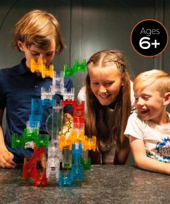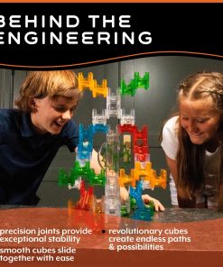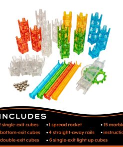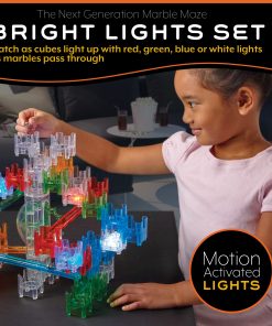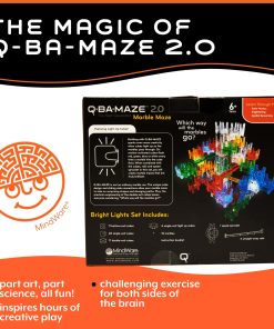 ¡Experimenta el Q-BA-MAZE que iluminará la noche! ¡Parte arte y parte ciencia, el diseño de Q-BA-MAZE Bright Lights permite opciones de configuración ilimitadas, además de partes que se iluminan por movimiento para una emoción en la oscuridad! ¡Observa con asombro cómo las canicas vuelan a través de los cubos de salida cuádruple al azar, encendiendo luces azules, verdes o rojas hasta que caen en un destello blanco radiante en los atrapadores iluminados de canicas! Usa tus habilidades de pensamiento crítico para apilar e interconectar las piezas translúcidas de una manera que crea un laberinto de canicas avanzado que mantiene a todos preguntándose, ¿hacia dónde irán las canicas?