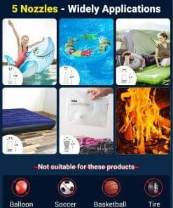 Además, la Mini Bomba de Aire de OMQ viene con 5 boquillas diferentes que se adaptan a una variedad de productos inflables, desde colchonetas para dormir hasta muebles inflables. Una de las boquillas está diseñada para bolsas de vacío, lo que le permite ahorrar espacio de almacenamiento de manera eficiente.