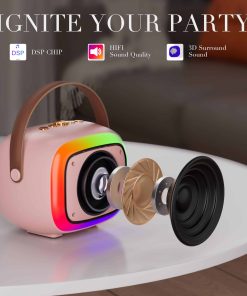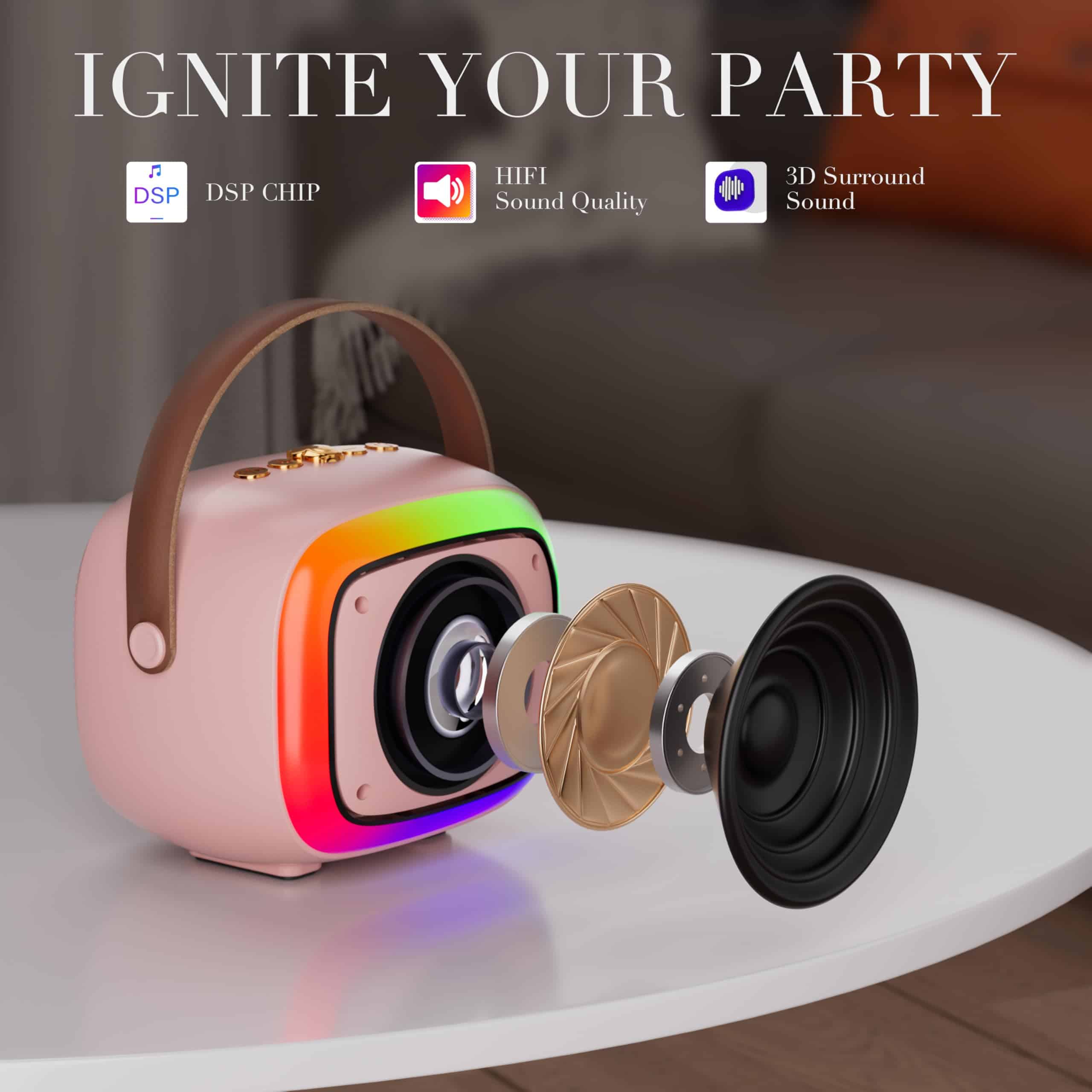 1. Esta mini máquina de karaoke es perfecta para fiestas, combinando karaoke, un altavoz portátil y luces de fiesta LED para entretenimiento sin fin.