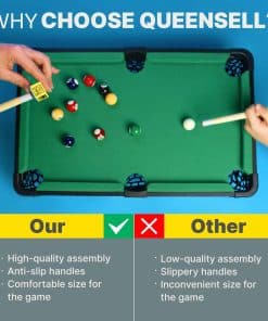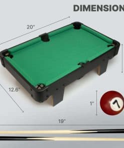 Mini Mesa de Billar para Niños y Adultos – Mesa de Billar Pequeña de 20 Pulgadas, Mesa de Billar Miniatura para Noches de Juegos en Familia – Montaje Sencillo Requerido. Ya sea que seas principiante o profesional, esta mesa de billar de mesa es la manera perfecta de disfrutar de horas de diversión para todos. Viene con todo lo que necesitas: tacos, bolas, triángulo, y chalking, solo configúralo y comienza a jugar en tu mesa de billar de mesa (se requiere un montaje sencillo). Esta mesa de billar miniatura para adultos y niños está diseñada con materiales fuertes para resistir juegos intensos. Con medidas de 20.3×12.8×4.3 pulgadas, esta mesa de billar pequeña es fácil de guardar y cabe en cualquier mesa o escritorio. Una opción fantástica para los amantes de los billares de todas las edades, desde una mesa de billar para niños hasta una mesa de billar miniatura para jugadores casuales y principiantes.