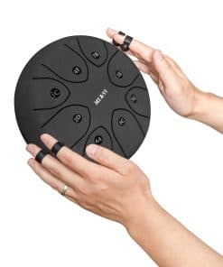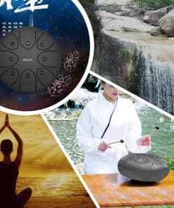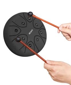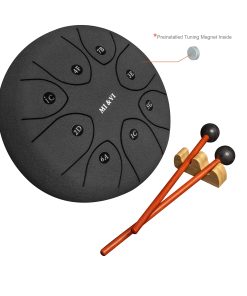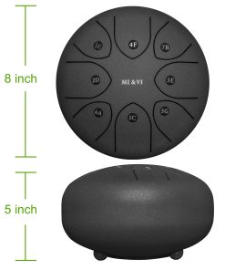 ESPECIFICACIONES: Tipo de Producto: Steel Tongue Drum Forma: Redonda Tamaño: 8 pulgadas Peso: Dimensiones Generales: 8 pulgadas de diámetro x 5 pulgadas de altura CONTENIDO DEL PAQUETE: 2x Mazos de Tambor 1x Bolsa de Tambor de Viaje Pegatinas de Tono Extra 1x Soporte para Mazos de Tambor 4x Púas de Dedo Imanes de Afinación: Viene con un imán de afinación preinstalado. Forman parte de la característica que mejora la precisión de afinación.