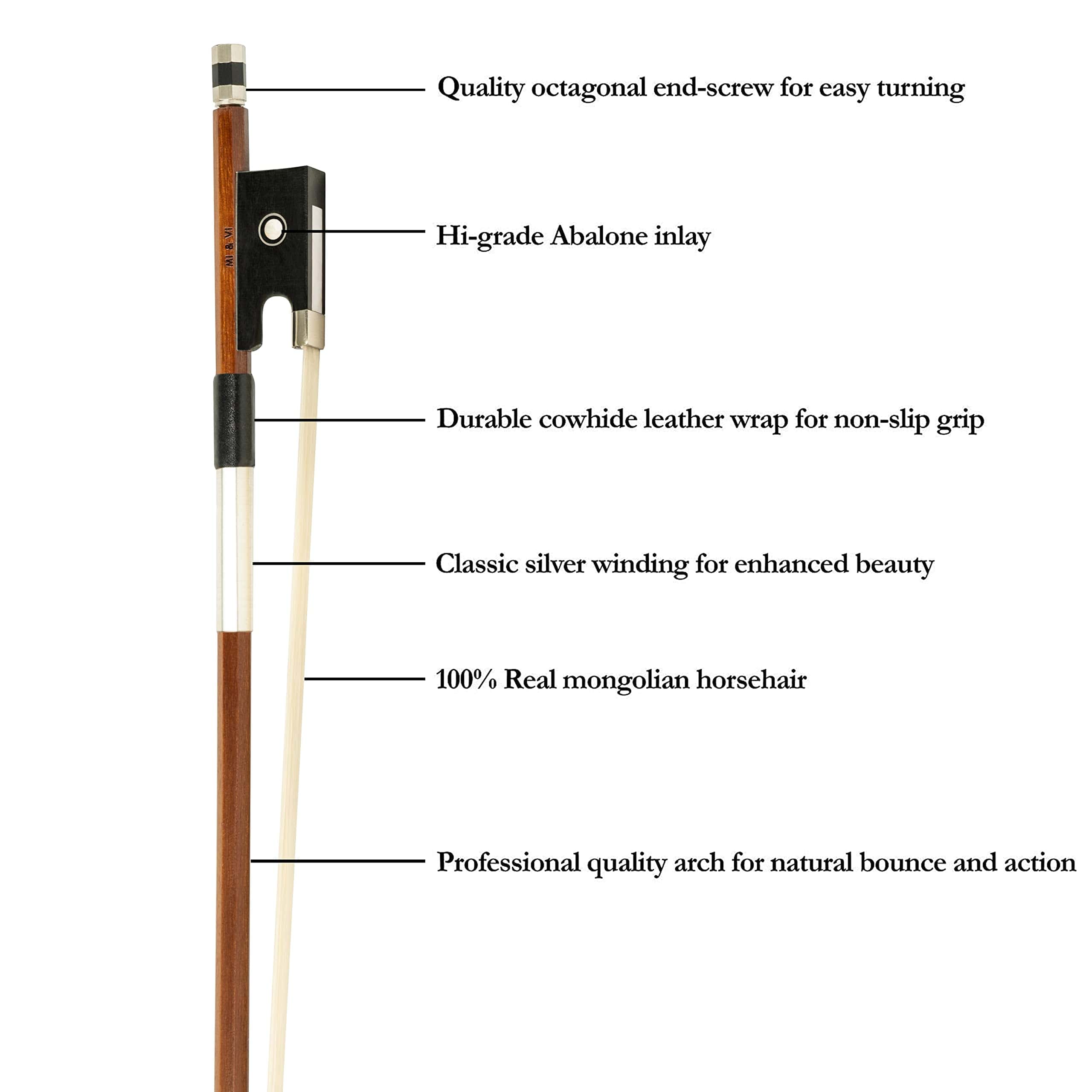 CARACTERÍSTICAS CLAVE: Arco de Violín de Madera de Brasil Hecho a Mano de Música MI&VI Pelo de Caballo Mongol Natural de Alta Calidad Decorativo Ojo de Ébano con Encaje en París Gran Balance y Distribución de Peso Ligero Madera Real para Rebote Natural y Sujeción Estable Excelente Elección para Todos los Niveles Principiantes a Intermedios