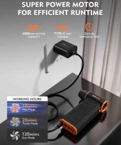 4. Soplador de aire compacto y duradero: Nuestro mini ventilador turbo combina durabilidad con un diseño ligero. Como soplador de aire inalámbrico, cuenta con un agarre ergonómico y antideslizante y es lo suficientemente compacto para caber en su bolsillo. Funciona perfectamente como un soplador de mano y ofrece una vida útil de rendimiento ecológico sin más botes de aire comprimido voluminosos y desperdiciados.