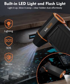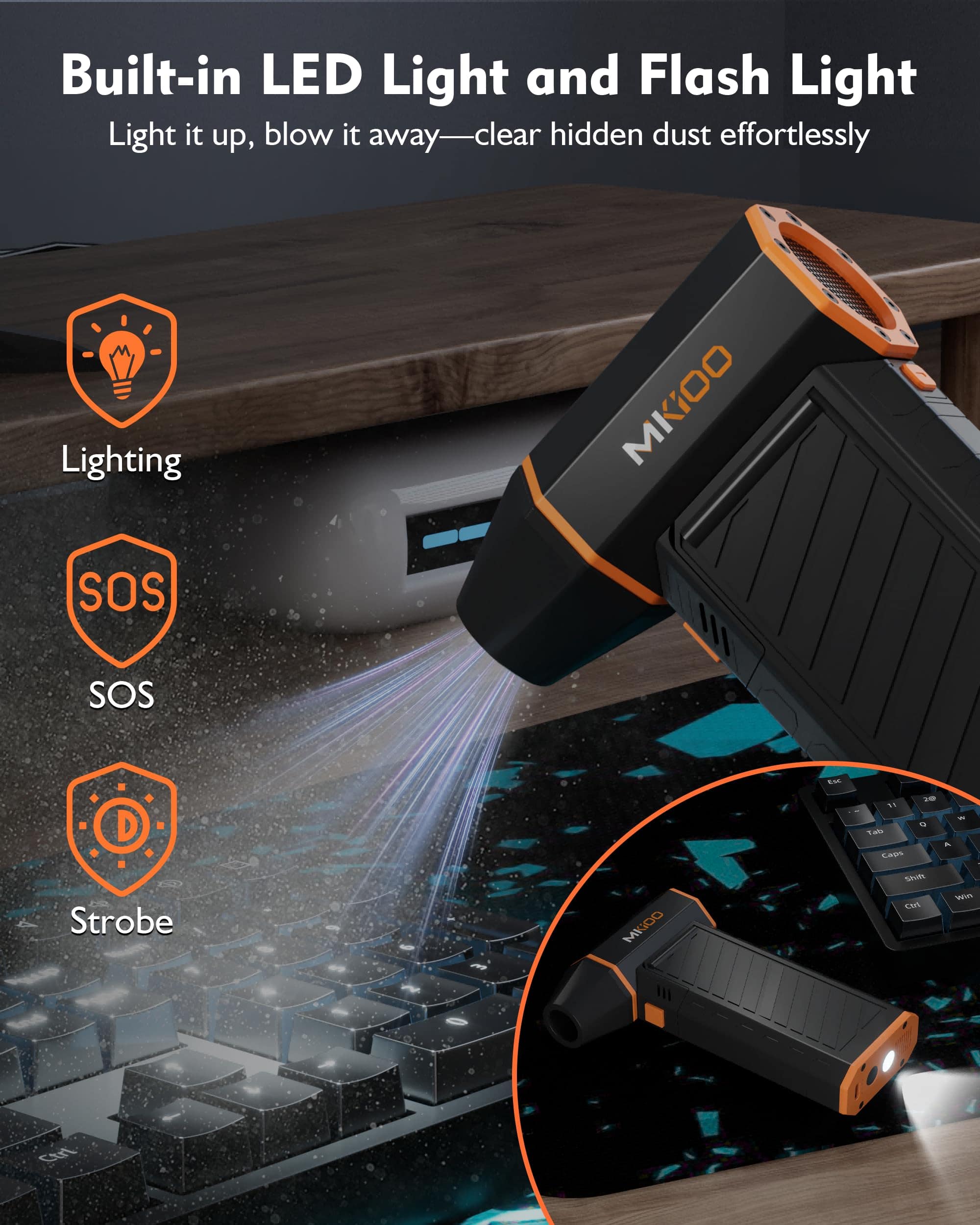3. Potente & Versátil: El soplador de aire eléctrico MKIOO ofrece 3 velocidades ajustables para todas sus necesidades de limpieza. Es lo suficientemente suave para componentes delicados como lentes de cámara, pero lo suficientemente robusto para despejar nieve y hojas sin esfuerzo como un mini soplador. Con iluminación LED integrada, obtiene mejor visibilidad y precisión, lo que facilita detectar y eliminar el polvo en rincones oscuros, una opción superior a los tradicionales botes de aire comprimido para computadora.