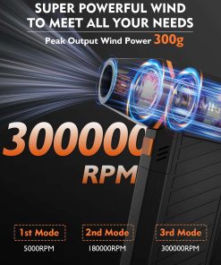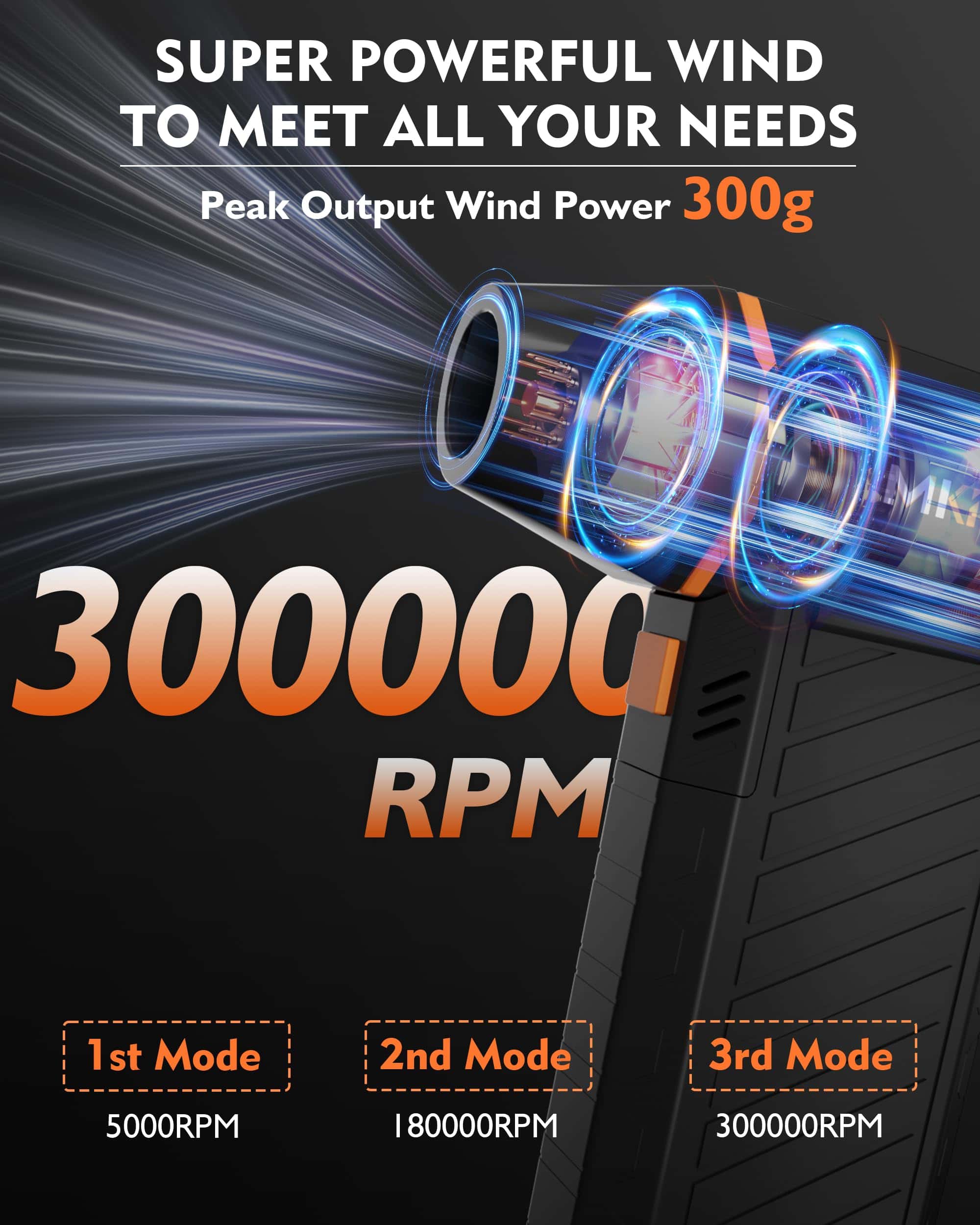 1. Ventilador Turbo de Súper Potencia: La versión más reciente de soplador de aire eléctrico, con un motor mejorado con una velocidad máxima de 300000RPM, fuerza de viento de 300g y velocidad máxima de viento de 60 m/s. Diseñado para una eficiencia de limpieza incomparable, es el soplador de aire comprimido definitivo para abordar el polvo obstinado en lugares difíciles de alcanzar.