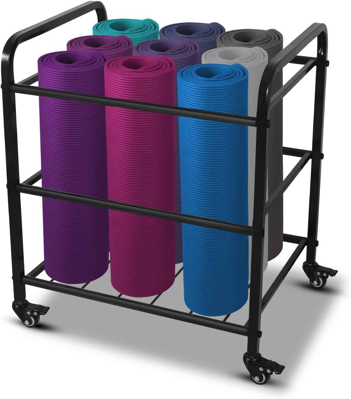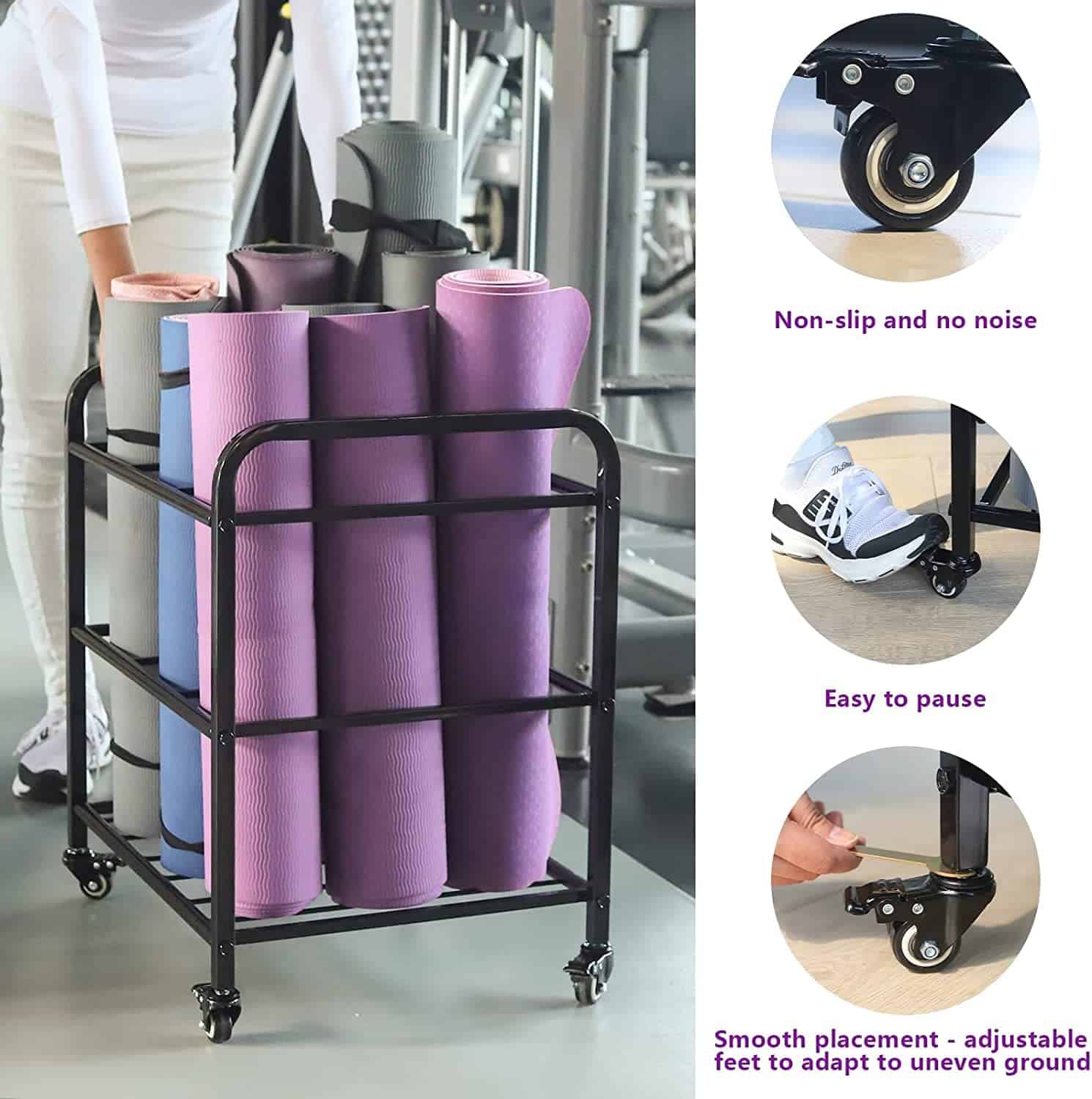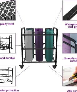 2. 360 PORTARROLLOS SUAVE: El carrito de almacenamiento para tapetes de yoga cuenta con 4 ruedas multidireccionales de servicio pesado, almohadilla de pie silenciosa antideslizante, que es fácil de mover en el carro de almacenamiento a cualquier lugar y se adapta a una posición específica.