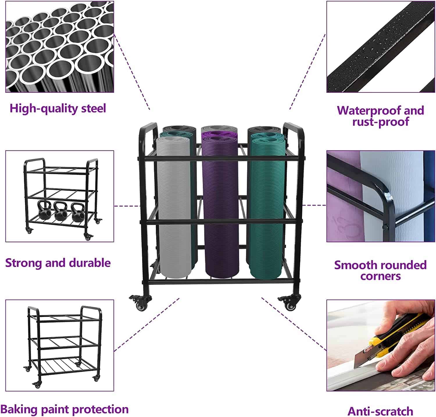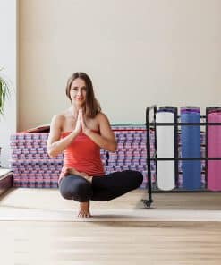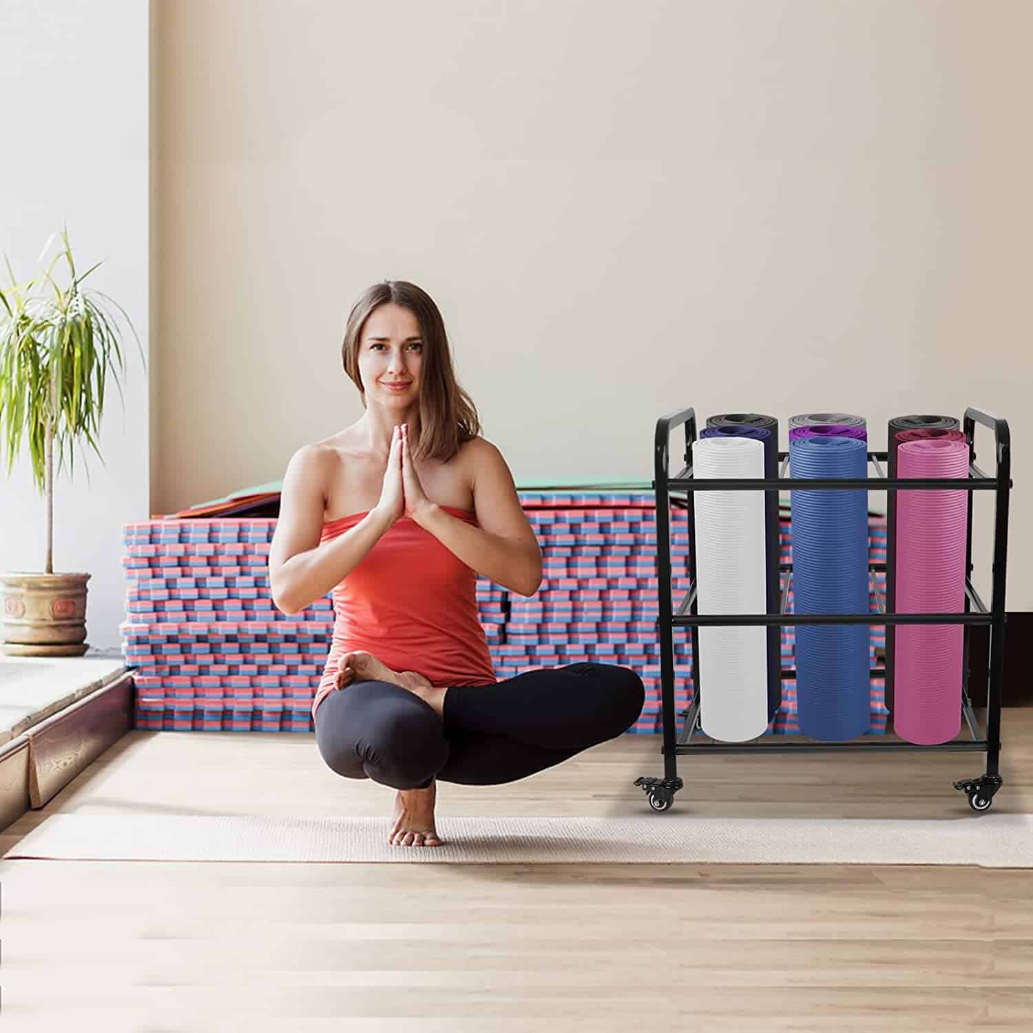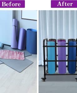 5. TAMAÑO PERFECTO: La dimensión de este organizador de gimnasio es 17.7″D x 22″W x 25.5″H. El estante de yoga resistente y resistente puede almacenar 9 tapetes de rodillo. Tratamiento de filete, más efectivo para evitar golpes, Refuerzo de carga (Nota: Producto no incluido en tapete)