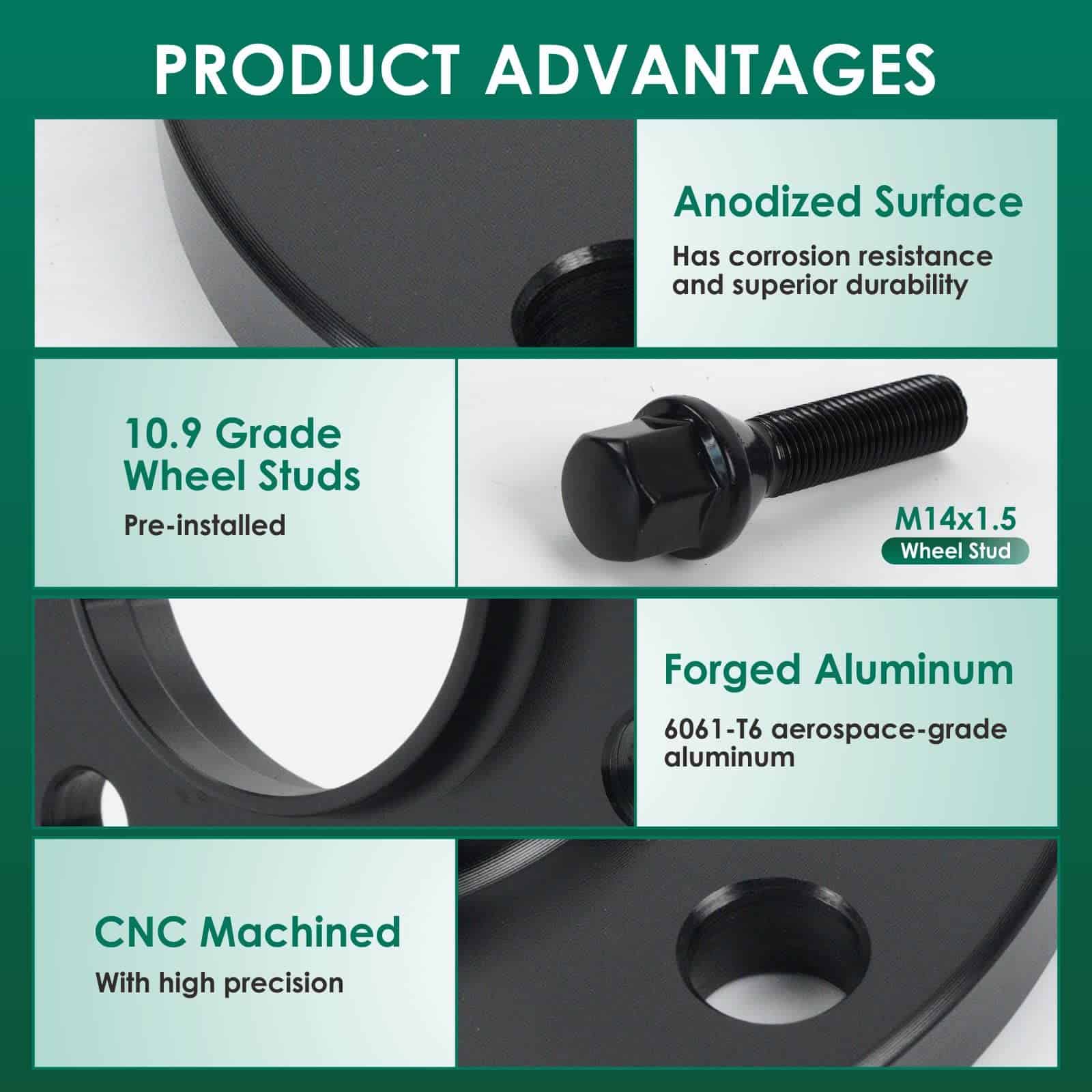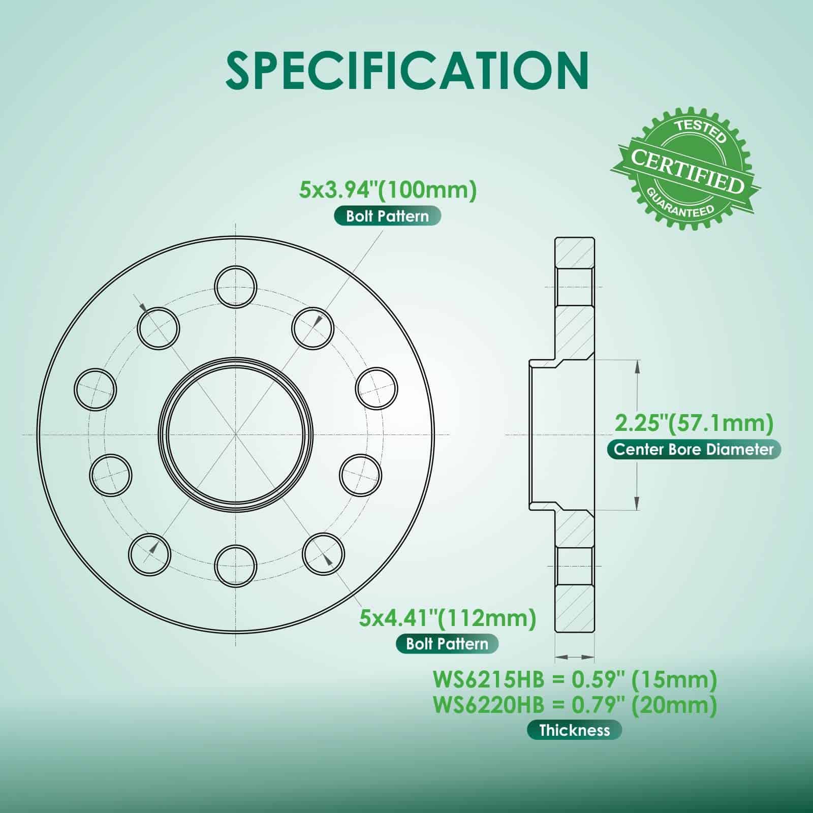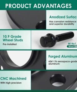 Este juego incluye 2 separadores de 15mm y 2 de 20mm, fabricados en aluminio forjado 6061 T6 para una mayor resistencia. Con un patrón de pernos de 5×100 a 5x112mm, centro de 57.1mm y rosca M14x1.5, estos separadores cuentan con un diseño HubCentric chamfered y tuercas de perno 10.9 para una instalación segura.