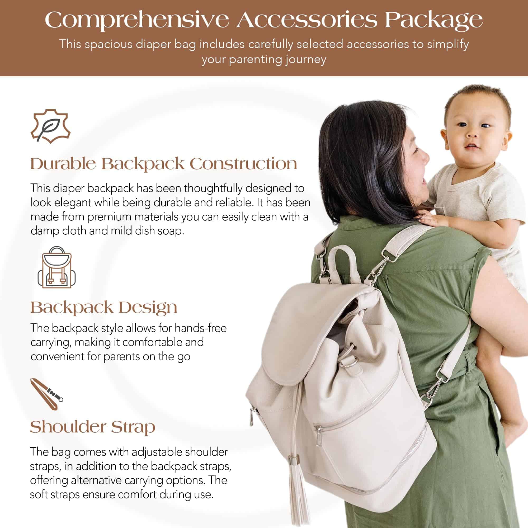 Experimenta una versatilidad inigualable con la mochila cambiador de piel Citi Journey, que puede ser fácilmente cambiada de un estilo de mochila a un bolso de hombro o bandolera con correas removibles. Esto hace que nuestra mochila cambiador de piel sea perfecta para cualquier situación, desde diligencias hasta salidas, todo mientras añade un toque de sofisticación a tu conjunto. Su esquema de color clásico complementa cualquier atuendo, fusionando funcionalidad con moda. Nuestra mochila cambiador con almacenamiento aislante para botellas está equipada para manejar desafíos de crianza sobre la marcha. Esta mochila cambiador de piel vegana está lista para cualquier cosa con dos bolsillos aislantes, un clip para cochecito y una almohadilla para cambiar grande. Es un espacio cuidadosamente organizado para todas las necesidades de tu bebé, haciendo que cada salida de casa sea más accesible y organizada. Esta mochila cambiador de piel de mochila presenta una construcción robusta, doble pespunteado y piel vegana de alta calidad. Esto la hace impermeable y a prueba de manchas, ideal para enfrentar cualquier desorden. El interior de nylon fácil de limpiar asegura que la mochila cambiador de bebé se vea fresca y nueva, sin importar a dónde te lleven tus aventuras, demostrando que es una elección confiable para familias activas. Cada mochila cambiador de piel de Citi Collective está respaldada por un servicio al cliente dedicado, garantizando la excelencia. Rigurosamente inspeccionadas antes del envío, nuestras bolsas de género neutro cumplen con altos estándares. Nuestro equipo de soporte receptivo está disponible para cualquier inquietud, garantizando tu satisfacción. Elige a Citi Collective para tener tranquilidad en cada uso.